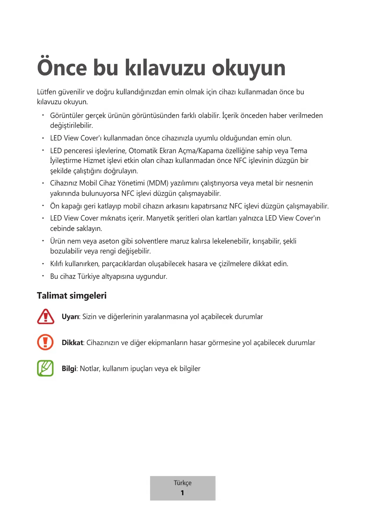 LED penceresi işlevlerine, Otomatik Ekran Açma/Kapama özelliğine sahip veya Tema İyileştirme Hizmet işlevi etkin olan cihazı kullanmadan önce NFC işlevinin düzgün bir şekilde çalıştığını doğrulayın.