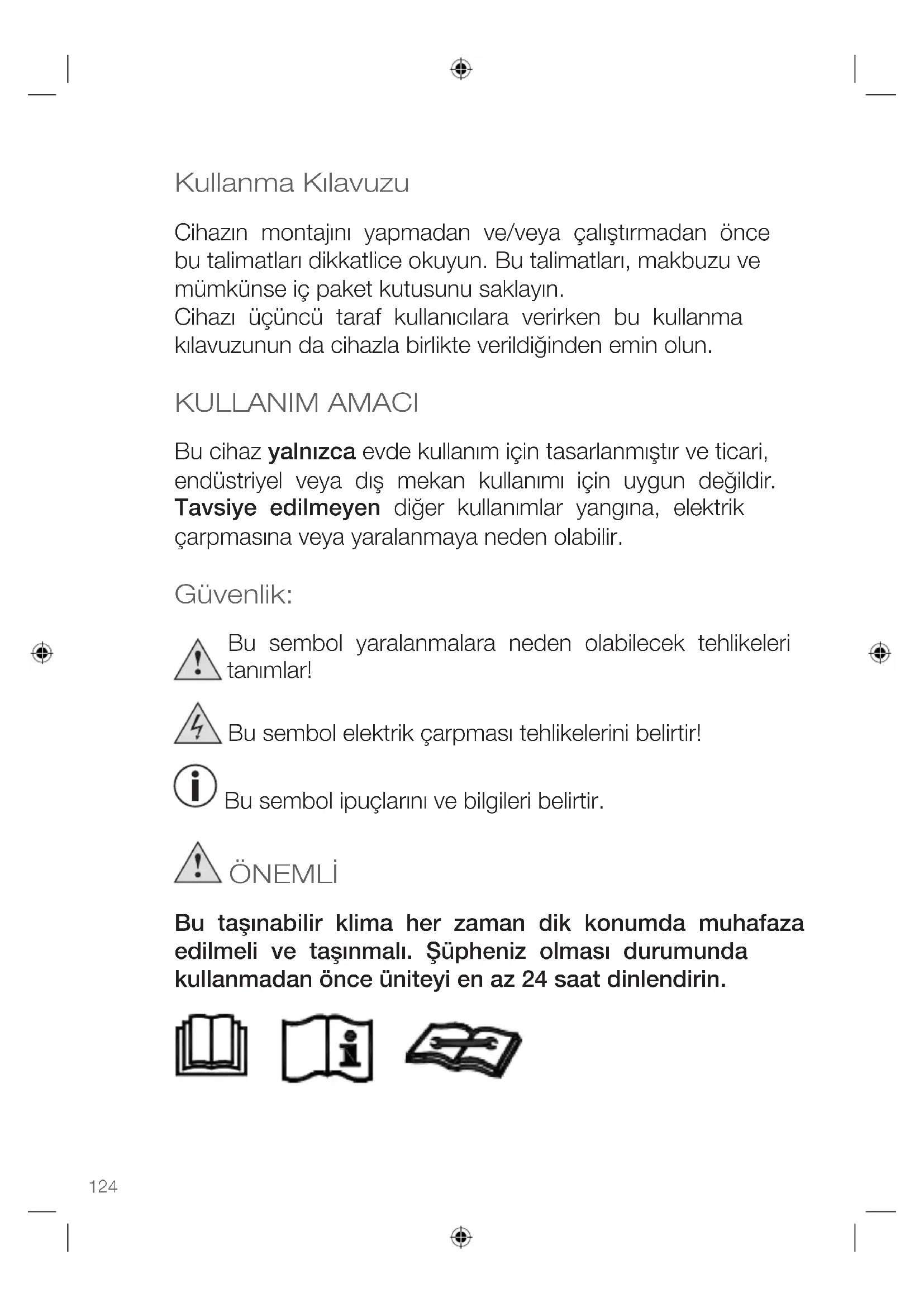 - pordañoscausadosporelpropietario. Esta garantía no afecta su derecho estatutario, ni ningún derecho legal que pueda tener como cliente bajo la legislación nacional aplicable que rija la compra de bienes. Para hacer valer su derecho de garantía durante el periodo garantizado, el cliente debe proporcionar una evidencia de la fecha de compra (recibo). La garantía debe presentarse contra KORONA electric GmbH, Sundern/Alemania. Línea telefónica directa: +49 2933 90284-80 Correo electrónico: service@korona-electric.de Página web: www.korona-electric.de dentro de los 2 años posteriores a la fecha de compra. En caso de hacer valer la garantía, el cliente tiene derecho a tener su aparato reparado en nuestra tienda o en una tienda autorizada. No se otorgan más derechos (por la garantía) al consumidor.124 Kullanma Kılavuzu Cihazın montajını yapmadan ve/veya çalıştırmadan önce bu talimatları dikkatlice okuyun. Bu talimatları, makbuzu ve mümkünse iç paket kutusunu saklayın. Cihazı üçüncü taraf kullanıcılara verirken bu kullanma kılavuzunun da cihazla birlikte verildiğinden emin olun. KULLANIM AMACI Bu cihaz yalnızca evde kullanım için tasarlanmıştır ve ticari, endüstriyel veya dış mekan kullanımı için uygun değildir. Tavsiye edilmeyen diğer kullanımlar yangına, elektrik çarpmasına veya yaralanmaya neden olabilir. Güvenlik: Bu sembol yaralanmalara neden olabilecek tehlikeleri tanımlar! Bu sembol elektrik çarpması tehlikelerini belirtir! Bu sembol ipuçlarını ve bilgileri belirtir. ÖNEMLİ Bu taşınabilir klima her zaman dik konumda muhafaza edilmeli ve taşınmalı. Şüpheniz olması durumunda kullanmadan önce üniteyi en az 24 saat dinlendirin.TÜRKçE Kullanma Kılavuzu