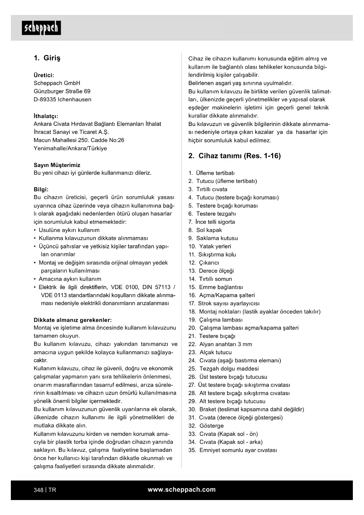 Üretici: Scheppach GmbH Günzburger Straße 69 D-89335 Ichenhausen İthalatçı: Ankara Civata Hırdavat Bağlantı Elemanları İthalat İhracat Sanayi ve Ticaret A.Ş. Macun Mahallesi 250. Cadde No:26 Yenimahalle/Ankara/Türkiye Sayın Müşterimiz Bu yeni cihazı iyi günlerde kullanmanızı dileriz. Bilgi: Bu cihazın üreticisi, geçerli ürün sorumluluk yasası uyarınca cihaz üzerinde veya cihazın kullanımına bağ- lı olarak aşağıdaki nedenlerden ötürü oluşan hasarlar için sorumluluk kabul etmemektedir: