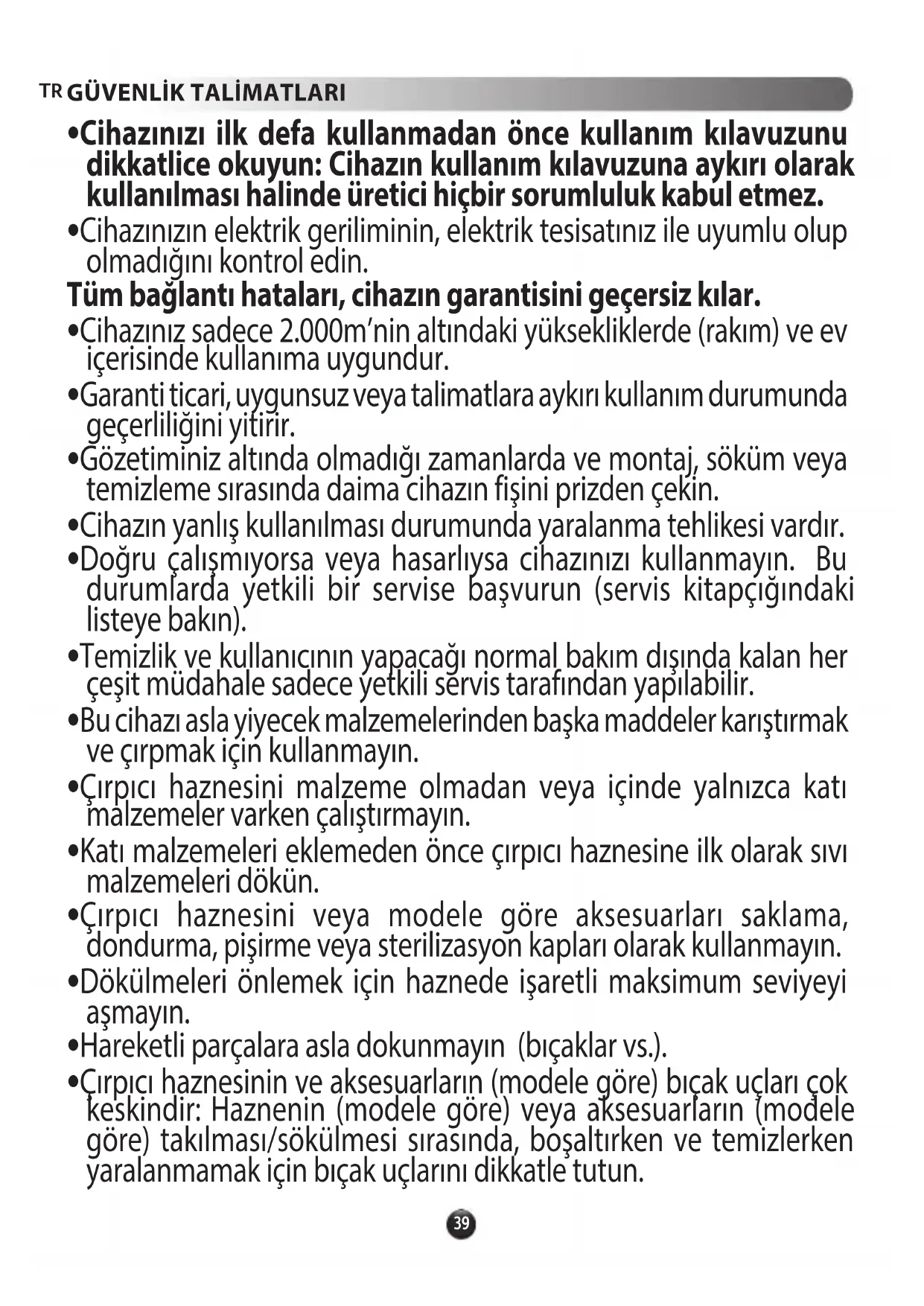 - Cihazın çalışması sırasında parmaklarınızı veya cihazın kullanımı için işlevsel olmayan nesneleri çırpıcı haznesine koymayın.
