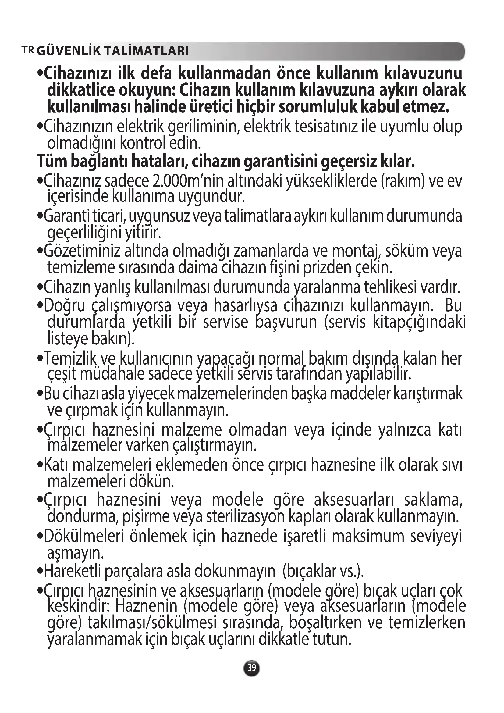- Cihazınızı ilk defa kullanmadan önce kullanım kılavuzunu dikkatlice okuyun: Cihazın kullanım kılavuzuna aykırı olarak kullanılması halinde üretici hiçbir sorumluluk kabul etmez.