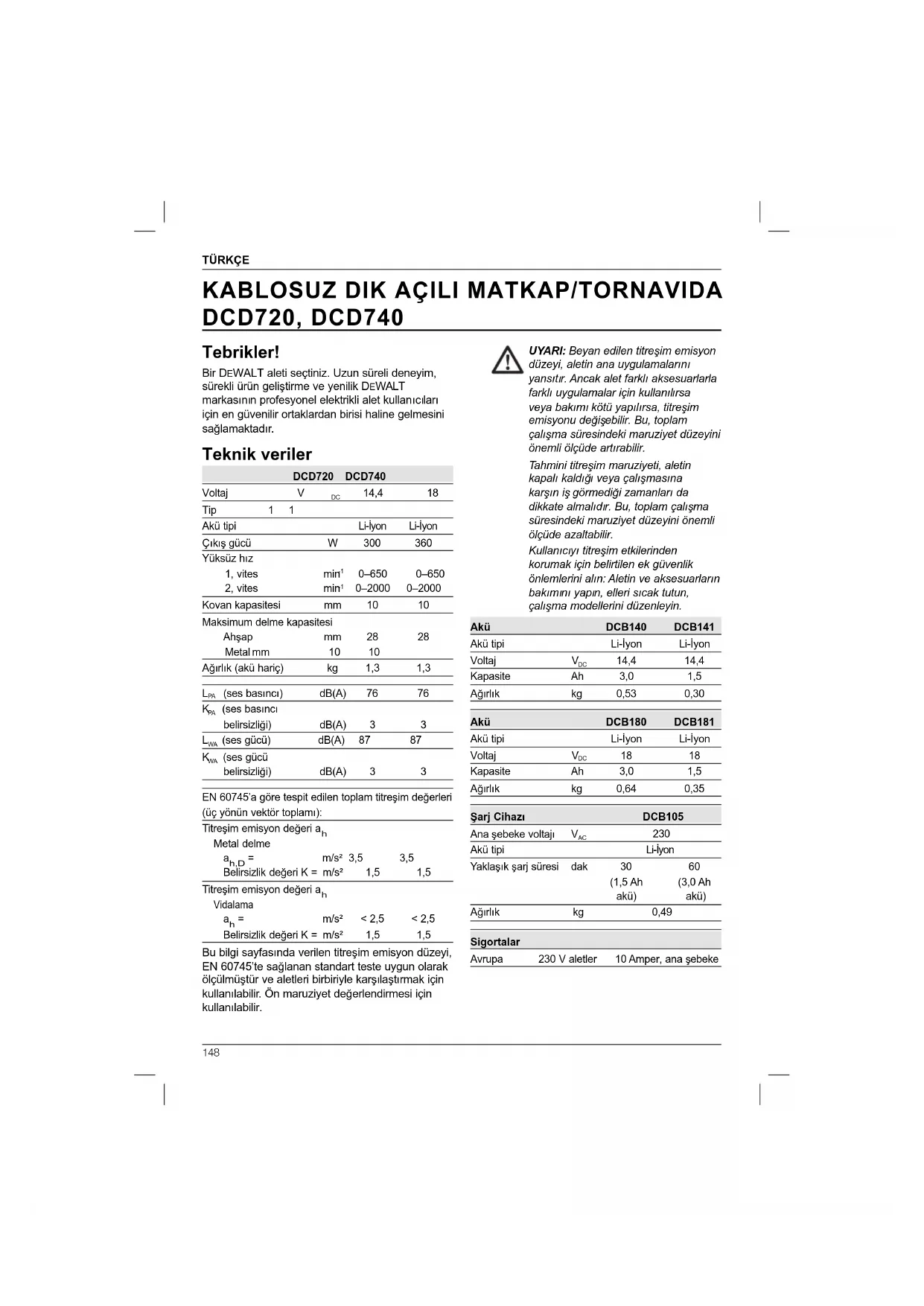 DCD720, DCD740 Tebrikler! Bir DEWALT aleti seçtiniz. Uzun süreli deneyim, sürekli ürün geliştirme ve yenilik DEWALT markasının profesyonel elektrikli alet kullanıcıları için en güvenilir ortaklardan birisi haline gelmesini sağlamaktadır. Teknik veriler DCD720 DCD740 Voltaj V