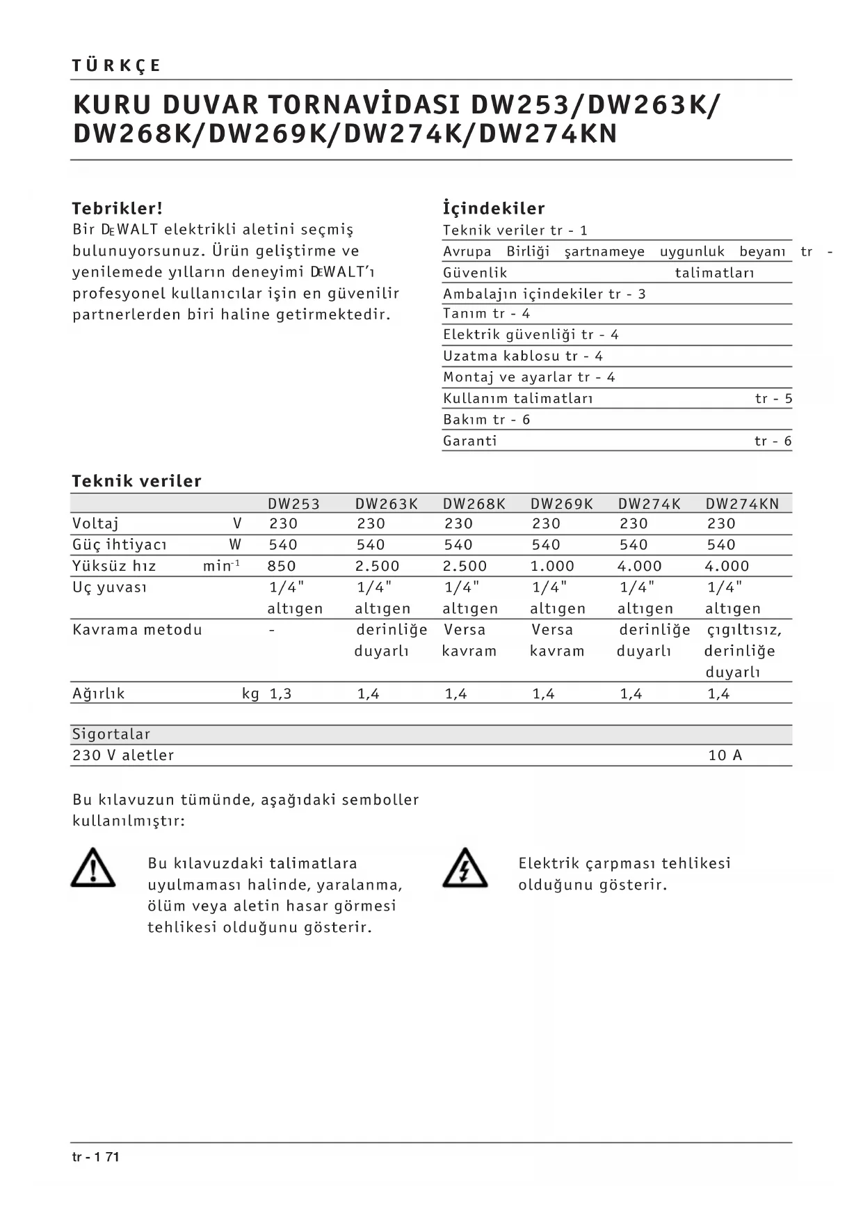 Uç yuvas 1/4" 1/4" 1/4" 1/4" 1/4" 1/4" altgen altgen altgen altgen altgen altgen Kavrama metodu - derinliğe Versa Versa derinliğe çgltsz, duyarl kavram kavram duyarl derinliğe duyarl Ağrlk kg 1,3 1,4 1,4 1,4 1,4 1,4 Sigortalar 230 V aletler 10 A Bu klavuzun tümünde, aşağdaki semboller kullanlmştr: Bu klavuzdaki talimatlara uyulmamas halinde, yaralanma, ölüm veya aletin hasar görmesi tehlikesi olduğunu gösterir. Elektrik çarpmas tehlikesi olduğunu gösterir.TÜRKÇE 72 tr - 2 Avrupa Birliği şartnameye uygunluk beyan DW253/DW263K/DW268K/DW269K/ DW274K/DW274KN