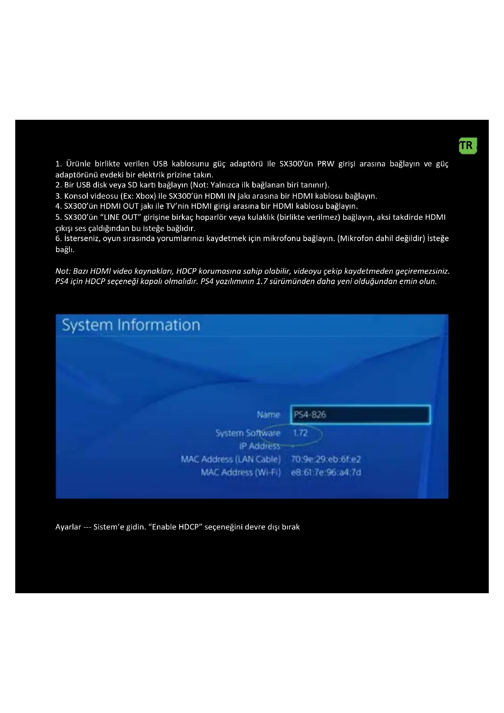 bağlı. Not: Bazı HDMI video kaynakları, HDCP korumasına sahip olabilir, videoyu çekip kaydetmeden geçiremezsiniz. PS4 için HDCP seçeneği kapalı olmalıdır. PS4 yazılımının 1.7 sürümünden daha yeni olduğundan emin olun. Ayarlar --- Sistem’e gidin. “Enable HDCP” seçeneğini devre dışı bırak TRNot: HDCP seçeneğini yalnızca Bluray lm içeriği yakmak için değil, kayıt oyunları için devre dışı bırakın. TRYPBPR bileşen video bağlansı (DVD oynacı, PS3 vb.)