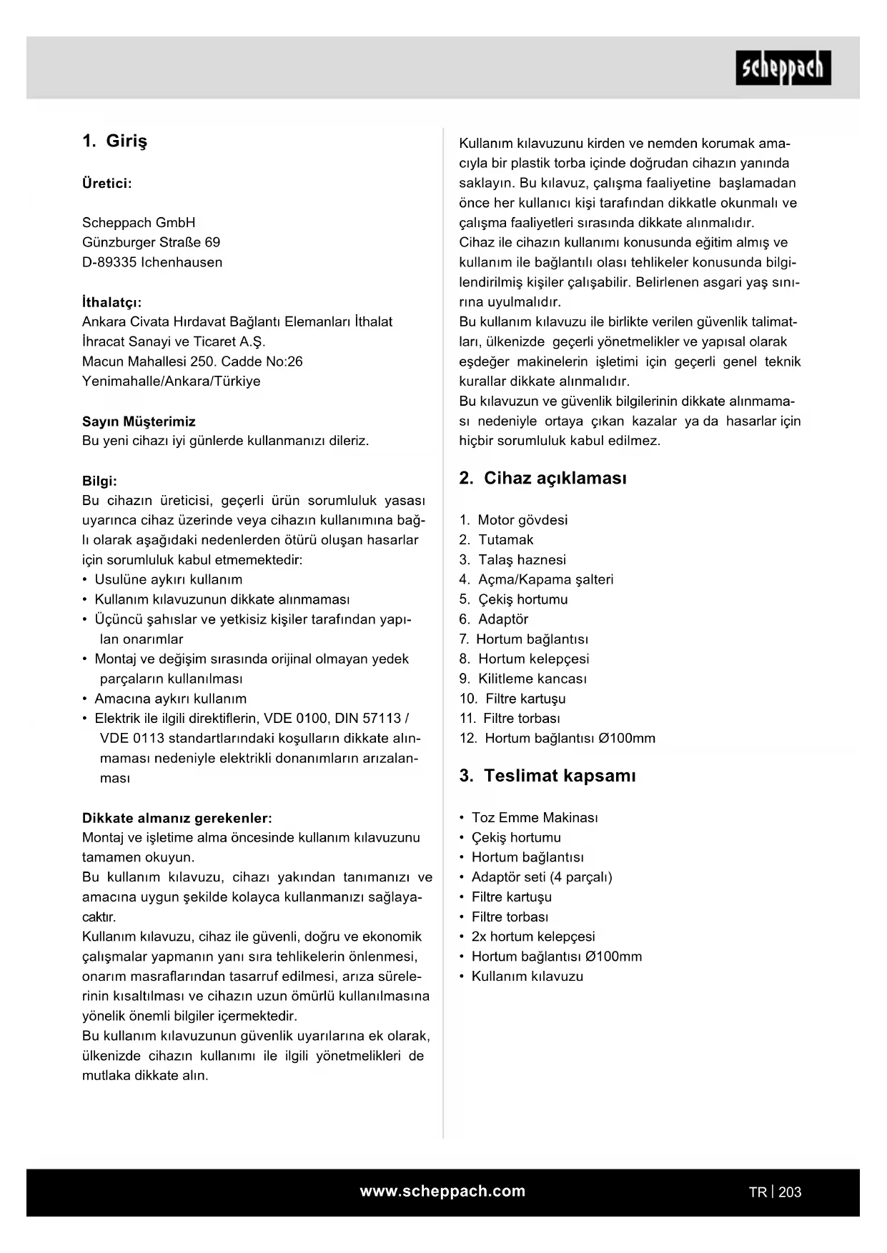 - Elektrik ile ilgili direktierin, VDE 0100, DIN 57113 / VDE 0113 standartlarındaki koşulların dikkate alın- maması nedeniyle elektrikli donanımların arızalan- ması Dikkate almanız gerekenler: Montaj ve işletime alma öncesinde kullanım kılavuzunu tamamen okuyun. Bu kullanım kılavuzu, cihazı yakından tanımanızı ve amacına uygun şekilde kolayca kullanmanızı sağlaya- caktır. Kullanım kılavuzu, cihaz ile güvenli, doğru ve ekonomik çalışmalar yapmanın yanı sıra tehlikelerin önlenmesi, onarım masraarından tasarruf edilmesi, arıza sürele- rinin kısaltılması ve cihazın uzun ömürlü kullanılmasına yönelik önemli bilgiler içermektedir. Bu kullanım kılavuzunun güvenlik uyarılarına ek olarak, ülkenizde cihazın kullanımı ile ilgili yönetmelikleri de mutlaka dikkate alın.www.scheppach.com