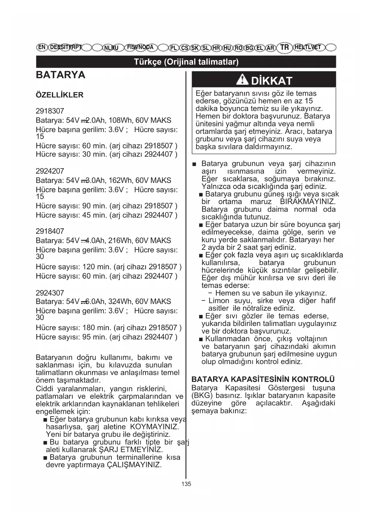 Hücre sayısı: 180 min. (arj cihazı 2918507 ) Hücre sayısı: 95 min. (arj cihazı 2924407 ) Bataryanın doğru kullanımı, bakımı ve saklanması için, bu kılavuzda sunulan talimatların okunması ve anlaşılması temel önem taşımaktadır. Ciddi yaralanmaları, yangın risklerini, patlamaları ve elektrik çarpmalarından ve elektrik arklarından kaynaklanan tehlikeleri engellemek için: ■ Eğer batarya grubunun kabı kırıksa veya hasarlıysa, şarj aletine KOYMAYINIZ. Yeni bir batarya grubu ile değiştiriniz. ■ Bu batarya grubunu farklı tipte bir şarj aleti kullanarak ŞARJ ETMEYİNİZ. ■ Batarya grubunun terminallerine kısa devre yaptırmaya ÇALIŞMAYINIZ. DİKKAT Eğer bataryanın sıvısı göz ile temas ederse, gözünüzü hemen en az 15 dakika boyunca temiz su ile yıkayınız. Hemen bir doktora başvurunuz. Batarya ünitesini yağmur altında veya nemli ortamlarda şarj etmeyiniz. Aracı, batarya grubunu veya şarj cihazını suya veya başka sıvılara daldırmayınız. ■ Batarya grubunun veya şarj cihazının aşırı ısınmasına izin vermeyiniz. Eğer sıcaklarsa, soğumaya bırakınız. Yalnızca oda sıcaklığında şarj ediniz. ■ Batarya grubunu güneş ışığı veya sıcak bir ortama maruz BIRAKMAYINIZ. Batarya grubunu daima normal oda sıcaklığında tutunuz. ■ Eğer batarya uzun bir süre boyunca şarj edilmeyecekse, daima gölge, serin ve kuru yerde saklanmalıdır. Bataryayı her 2 ayda bir 2 saat şarj ediniz. ■ Eğer çok fazla veya aşırı uç sıcaklıklarda kullanılırsa, batarya grubunun hücrelerinde küçük sızıntılar gelişebilir. Eğer dış mühür kırılırsa ve sıvı deri ile temas ederse: − Hemen su ve sabun ile yıkayınız. − Limon suyu, sirke veya diğer hafif asitler ile nötralize ediniz. ■ Eğer sıvı gözler ile temas ederse, yukarıda bildirilen talimatları uygulayınız ve bir doktora başvurunuz. ■ Kullanmadan önce, çıkış voltajının ve bataryanın şarj cihazındaki akımın batarya grubunun şarj edilmesine uygun olup olmadığını kontrol ediniz.