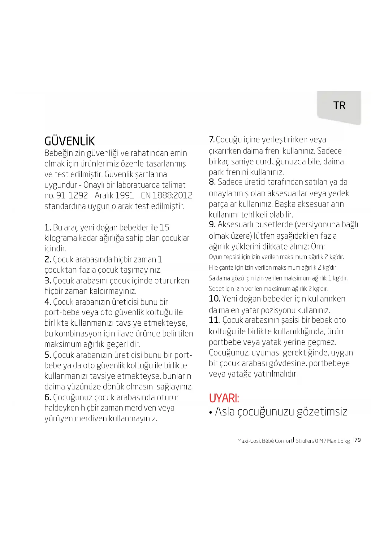 Portbebe ile birlikte verilenin dışında ilave bir şilte eklemeyin. Kullanım sırasında taşıma kolları çocuk arabasının gövdesinden ayrılmış olmalıdır. Çevre Bu ürünü artık kullanmayacağınızda çevreyi korumak amacıyla ürünü yerel kurallara uygun olarak çöp çeşidine göre ayırarak atmanızı rica ederiz. Sorular Lütfen ülkenizdeki distribütörü ile temas kurun veya web sitemizi ziyaret edin.Bunu yaparken lütfen aşağıdaki bilgileri hazır tutun: - Seri numarası - Çocuğunuzun yaşı (boyu) ve kilosu. Taşıma ve Nakliye Esnasında Dikkat Edilmesi Gereken Hususlar: Ürün orijinal ambalaj/kolisinde muhafaza edilmelidir. Satın aldığınız ürünün orijinal kolisi ile birlikte aracınıza teslim edilmesini istiyorsanız, ürünün orijinal ambalajının/ kolisinin kapalı ve hasar görmemiş olduğundan emin olunuz. Ürünler nakliye ve taşıma esnasında kutu üzerinde belirtilen taşıma yönü dikkate alınarak taşınmalıdır. Ürünleri yüksek dereceli sıcaklıklardan, ateşten ve darbelerden koruyunuz, ıslak ve rutubetli ortamlarda muhafaza etmeyiniz. Garanti 24 aylık garantimiz tasarım, mühendislik, üretim ve ürün performansımızın kalitesine olan güvenimizi yansıtmaktadır. Bu ürünün, bu ürün için geçerli olan Avrupa güvenlik gereksinimleri ve kalite standartlarına uygun olarak üretildiğini ve satın alındığı tarihte malzeme ve işçilik açısından kusuru olmadığını garanti ederiz. Burada belirtilen koşullar altında, bu garanti bu ürünün Dorel Grup şirketlerinden biri, yetkili ithalatçısı veya onların anlaşmalı bayisi tarafından satıldığı ülkelerdeki tüketiciler tarafından talep edilebilir. 24 aylık garantimiz normal koşullarda ve kullanım kılavuzuna uygun olarak kullanıldığında, ilk son kullanıcı tarafından orijinal satın alım tarihinden itibaren 24 aylık süre boyunca, malzeme ve işçilik açısından tüm üretim kusurlarınıMaxi-Cosi, Bébé Confort