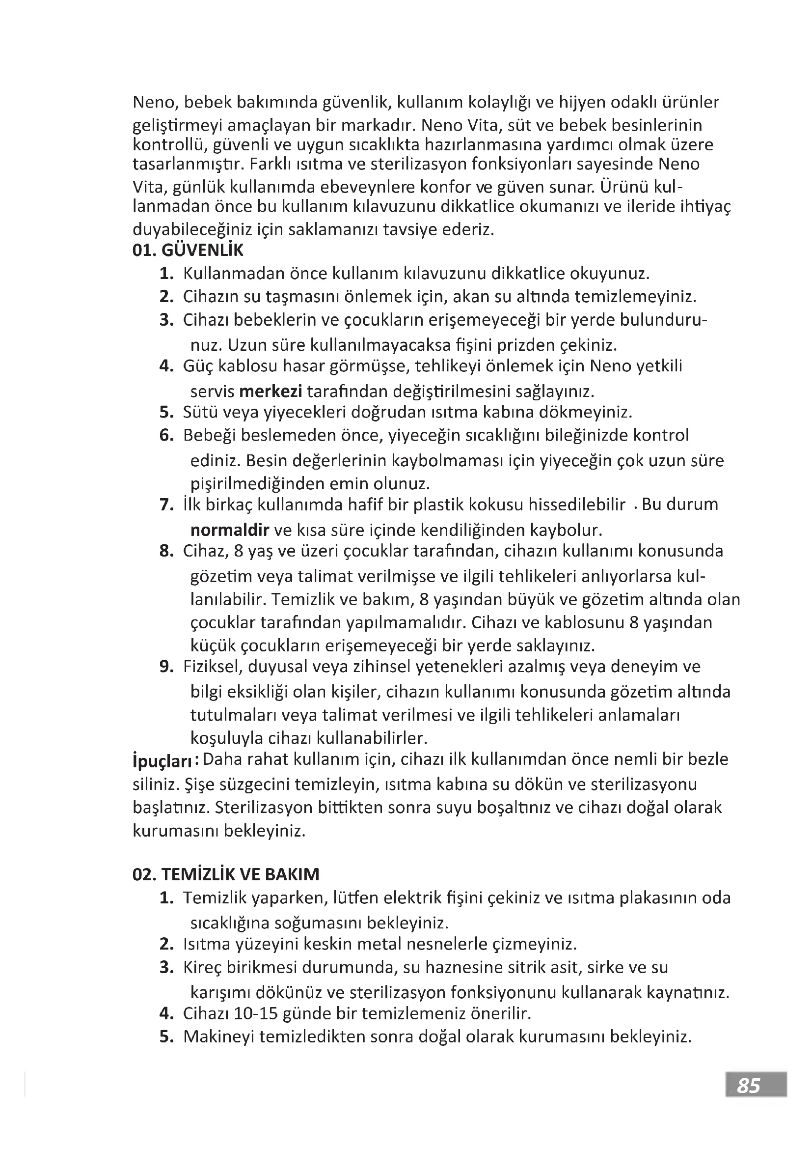 УПАТСТВО ЗА УПОТРЕБА Sayın Müşterimiz, Neno Vita ürününü tercih eğiniz için teşekkür ederiz.85 Neno, bebek bakımında güvenlik, kullanım kolaylığı ve hijyen odaklı ürünler gelişrmeyi amaçlayan bir markadır. Neno Vita, süt ve bebek besinlerinin kontrollü, güvenli ve uygun sıcaklıkta hazırlanmasına yardımcı olmak üzere tasarlanmışr. Farklı ısıtma ve sterilizasyon fonksiyonları sayesinde Neno Vita, günlük kullanımda ebeveynlere konfor ve güven sunar. Ürünü kul- lanmadan önce bu kullanım kılavuzunu dikkatlice okumanızı ve ileride ihyaç duyabileceğiniz için saklamanızı tavsiye ederiz.