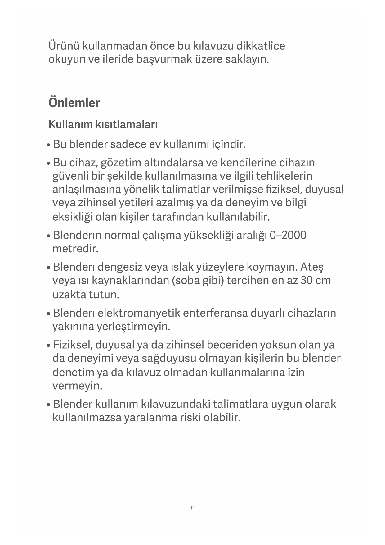 - Fiziksel, duyusal ya da zihinsel beceriden yoksun olan ya da deneyimi veya sağduyusu olmayan kişilerin bu blenderı denetim ya da kılavuz olmadan kullanmalarına izin vermeyin.