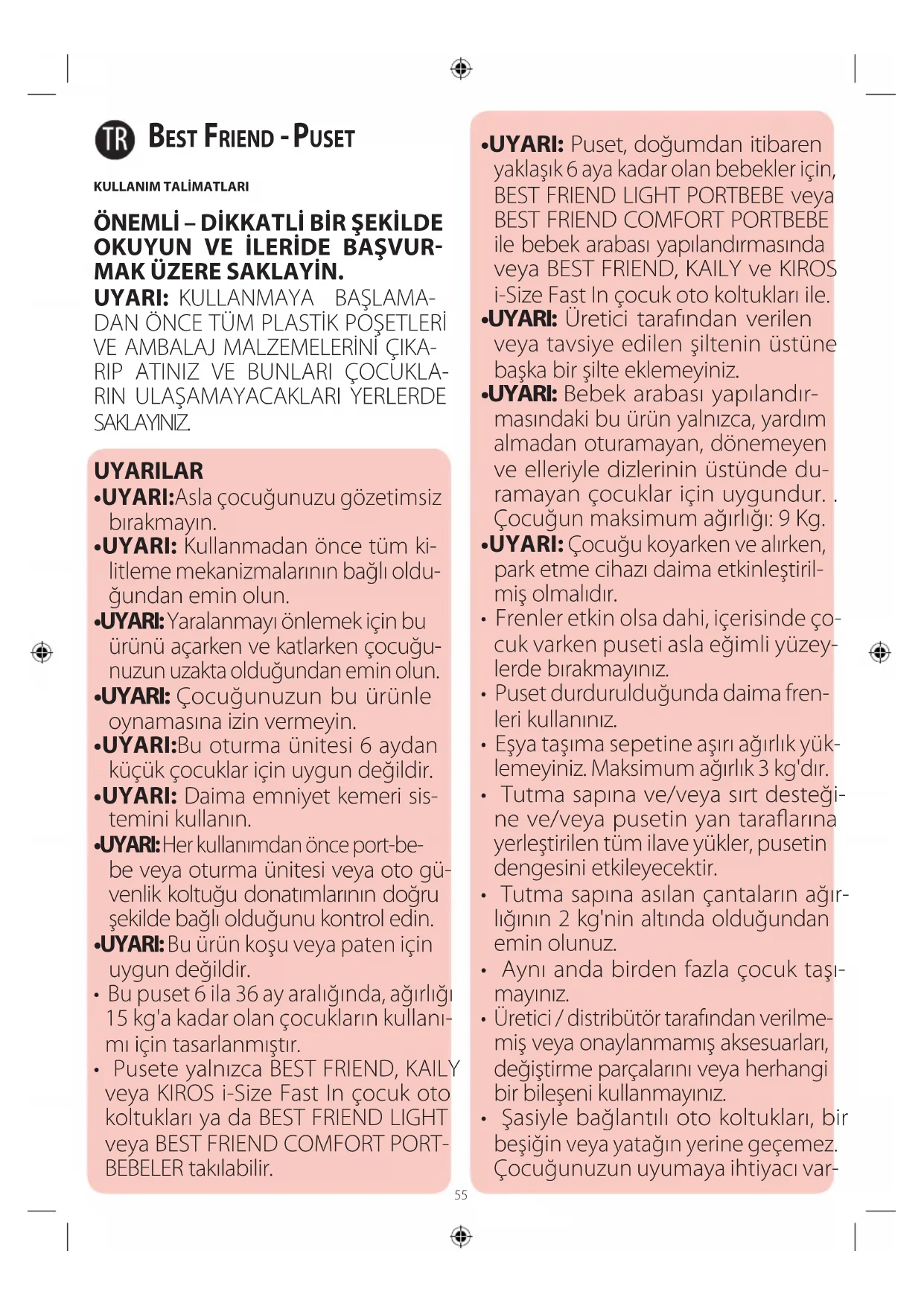 - Pusete yalnızca BEST FRIEND, KAILY veya KIROS i-Size Fast In çocuk oto koltukları ya da BEST FRIEND LIGHT veya BEST FRIEND COMFORT PORT- BEBELER takılabilir.