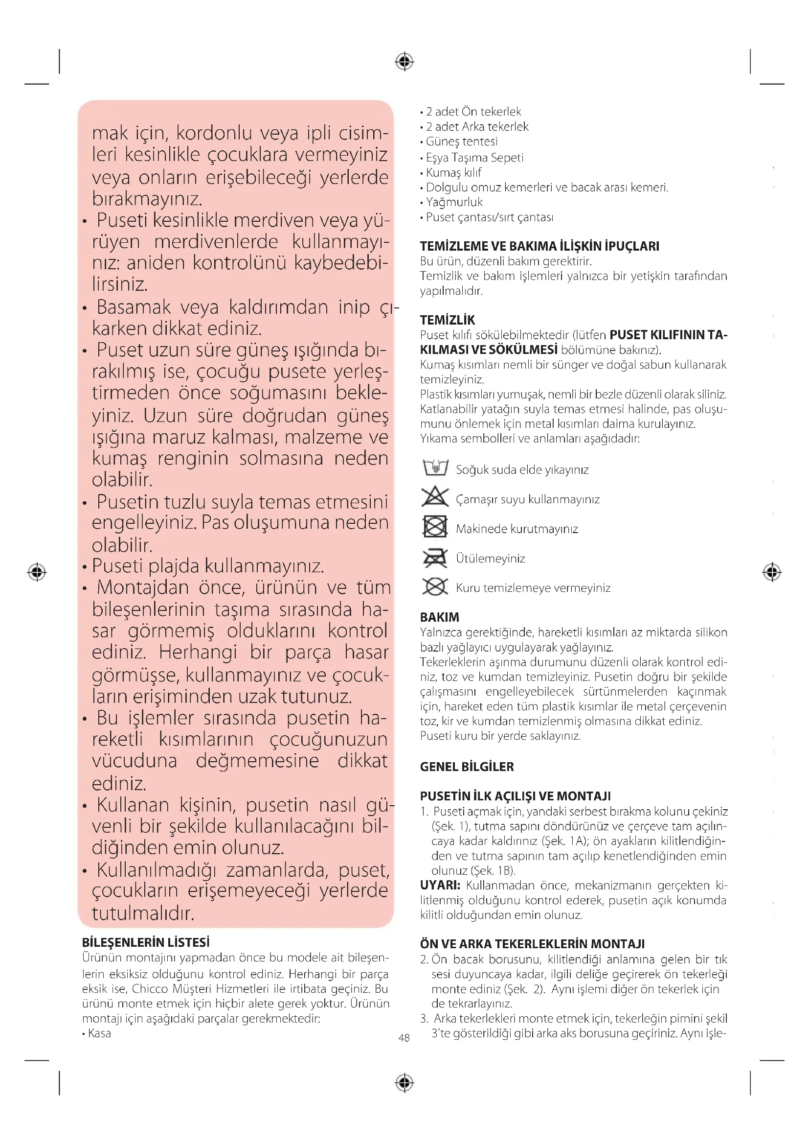 Puset kılıfı sökülebilmektedir (lütfen PUSET KILIFININ TA- KILMASI VE SÖKÜLMESİ bölümüne bakınız). Kumaş kısımları nemli bir sünger ve doğal sabun kullanarak temizleyiniz. Plastik kısımları yumuşak, nemli bir bezle düzenli olarak siliniz. Katlanabilir yatağın suyla temas etmesi halinde, pas oluşu- munu önlemek için metal kısımları daima kurulayınız. Yıkama sembolleri ve anlamları aşağıdadır: Soğuk suda elde yıkayınız Çamaşır suyu kullanmayınız Makinede kurutmayınız Ütülemeyiniz Kuru temizlemeye vermeyiniz BAKIM Yalnızca gerektiğinde, hareketli kısımları az miktarda silikon bazlı yağlayıcı uygulayarak yağlayınız. Tekerleklerin aşınma durumunu düzenli olarak kontrol edi- niz, toz ve kumdan temizleyiniz. Pusetin doğru bir şekilde çalışmasını engelleyebilecek sürtünmelerden kaçınmak için, hareket eden tüm plastik kısımlar ile metal çerçevenin toz, kir ve kumdan temizlenmiş olmasına dikkat ediniz. Puseti kuru bir yerde saklayınız.