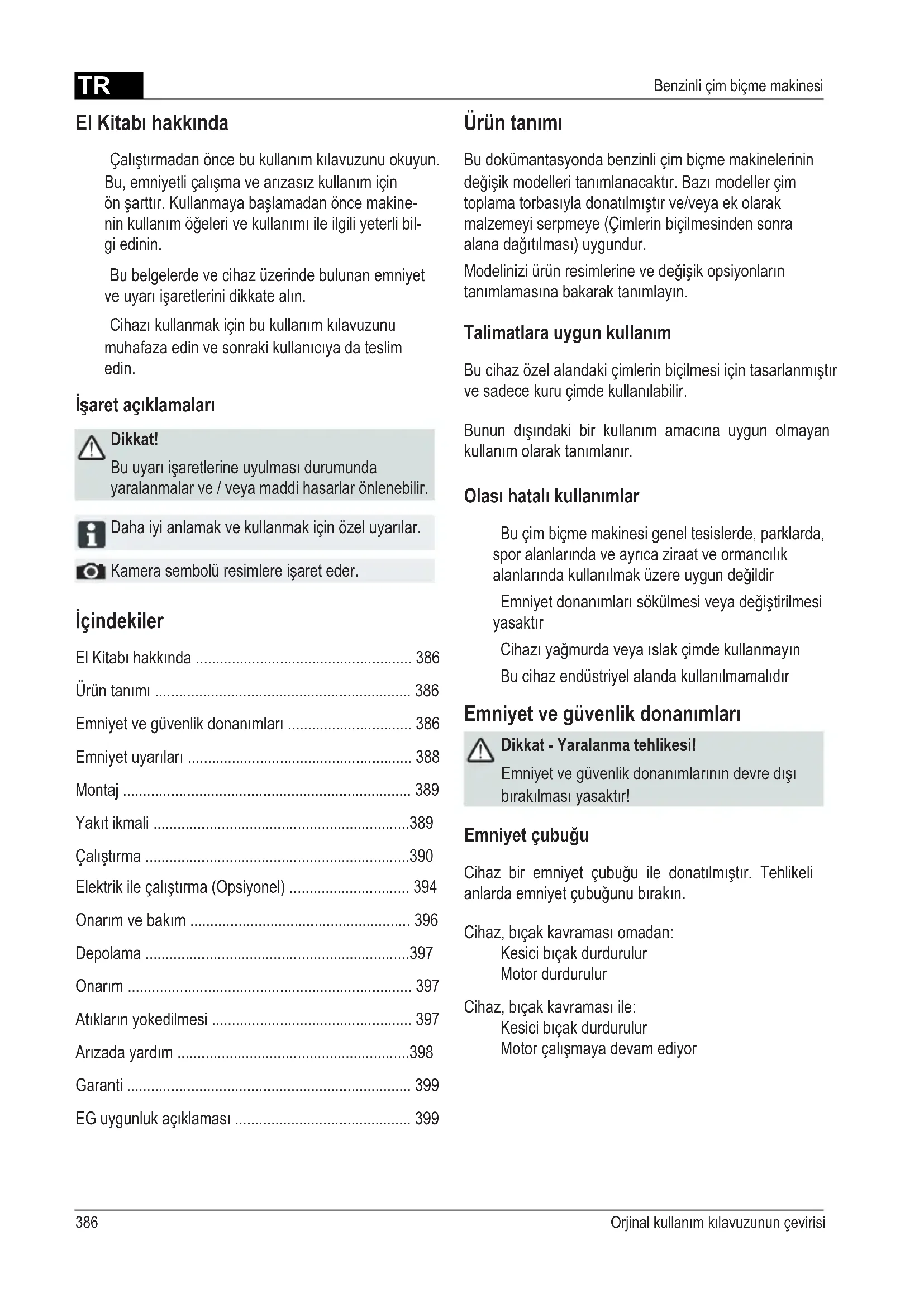 - EG uygunluk açıklaması El Kitabı hakkında Çalıştırmadan önce bu kullanım kılavuzunu okuyun. Bu, emniyetli çalışma ve arızasız kullanım için ön şarttır. Kullanmaya başlamadan önce makine- nin kullanım öğeleri ve kullanımı ile ilgili yeterli bil- gi edinin. Bu belgelerde ve cihaz üzerinde bulunan emniyet ve uyarı işaretlerini dikkate alın. Cihazı kullanmak için bu kullanım kılavuzunu muhafaza edin ve sonraki kullanıcıya da teslim edin. İşaret açıklamaları Dikkat! Bu uyarı işaretlerine uyulması durumunda yaralanmalar ve / veya maddi hasarlar önlenebilir. Daha iyi anlamak ve kullanmak için özel uyarılar. Kamera sembolü resimlere işaret eder. Ürün tanımı Bu dokümantasyonda benzinli çim biçme makinelerinin değişik modelleri tanımlanacaktır. Bazı modeller çim toplama torbasıyla donatılmıştır ve/veya ek olarak malzemeyi serpmeye (Çimlerin biçilmesinden sonra alana dağıtılması) uygundur. Modelinizi ürün resimlerine ve değişik opsiyonların tanımlamasına bakarak tanımlayın. Talimatlara uygun kullanım Bu cihaz özel alandaki çimlerin biçilmesi için tasarlanmıştır ve sadece kuru çimde kullanılabilir. Bunun dışındaki bir kullanım amacına uygun olmayan kullanım olarak tanımlanır. Olası hatalı kullanımlar Bu çim biçme makinesi genel tesislerde, parklarda, spor alanlarında ve ayrıca ziraat ve ormancılık alanlarında kullanılmak üzere uygun değildir Emniyet donanımları sökülmesi veya değiştirilmesi yasaktır Cihazı yağmurda veya ıslak çimde kullanmayın Bu cihaz endüstriyel alanda kullanılmamalıdır Emniyet ve güvenlik donanımları Dikkat - Yaralanma tehlikesi! Emniyet ve güvenlik donanımlarının devre dışı bırakılması yasaktır! Emniyet çubuğu Cihaz bir emniyet çubuğu ile donatılmıştır. Tehlikeli anlarda emniyet çubuğunu bırakın. Cihaz, bıçak kavraması omadan: Kesici bıçak durdurulur Motor durdurulur Cihaz, bıçak kavraması ile: Kesici bıçak durdurulur Motor çalışmaya devam ediyorTR 387470 591_c 1 Çalıştırma ipi 9 Kesme yüksekliği ayarı* 2 Start, Stop* 10 Bıçak kavraması* 3 Tekerlek tahriki* 11 Vario tahriki* 4 Emniyet çubuğu 12 Kullanım kılavuzu 5 Ergonomik yükseklik ayarı* 13 Dışarı atma parçası* 6 Dolum seviyesi göstergesi* 14 Kapak* 7 Engelleyici kapak* 15 Serpme kiti* 8 Çim toplama torbası* * Modele göre Cihazdaki semboller Dikkat! Kullanırken çok dikkatli olun. Kesme ünitesinde çalışma yapmadan önce buji soketini çıkarın. Çalıştırmadan önce kullanım kılavuzunu okuyun! Motor frenini açma. Üçüncü şahısları tehlikeli bölgeden uzaklaştırın! Tekerlek tahrikini çalıştırma. Ellerinizi ve ayaklarınızı kesme ünitesinden uzak tutun! p. 399