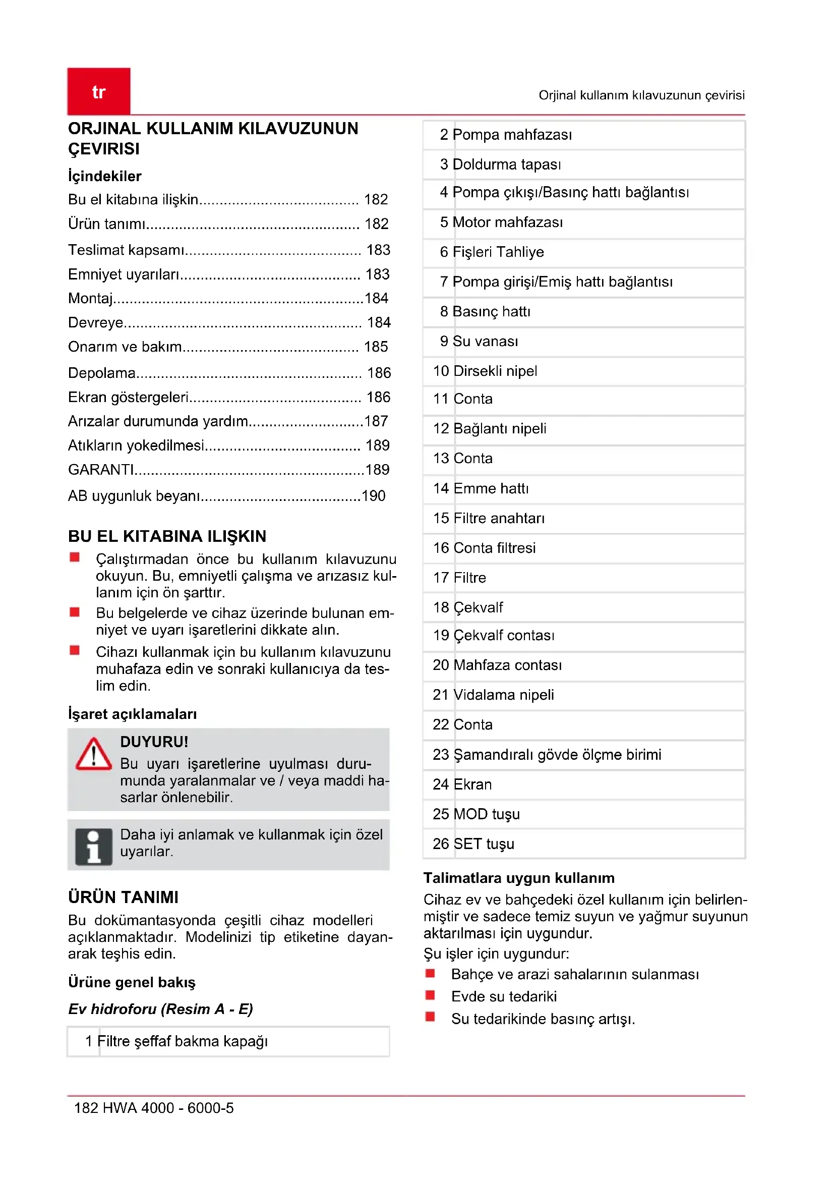 Bu dokümantasyonda çeşitli cihaz modelleri açıklanmaktadır. Modelinizi tip etiketine dayan- arak teşhis edin. Ürüne genel bakış Ev hidroforu (Resim A - E) 1 Filtre şeffaf bakma kapağı 2 Pompa mahfazası 3 Doldurma tapası 4 Pompa çıkışı/Basınç hattı bağlantısı 5 Motor mahfazası 6 Fişleri Tahliye 7 Pompa girişi/Emiş hattı bağlantısı 8 Basınç hattı 9 Su vanası 10 Dirsekli nipel 11 Conta 12 Bağlantı nipeli 13 Conta 14 Emme hattı 15 Filtre anahtarı 16 Conta filtresi 17 Filtre 18 Çekvalf 19 Çekvalf contası 20 Mahfaza contası 21 Vidalama nipeli 22 Conta 23 Şamandıralı gövde ölçme birimi 24 Ekran 25 MOD tuşu 26 SET tuşu Talimatlara uygun kullanım Cihaz ev ve bahçedeki özel kullanım için belirlen- miştir ve sadece temiz suyun ve yağmur suyunun aktarılması için uygundur. Şu işler için uygundur: Bahçe ve arazi sahalarının sulanması Evde su tedariki Su tedarikinde basınç artışı.Ürün tanımı 477296_c 183 ADVICE Su tedarikinin basınç artışında yerel yö- netmelikler dikkate alınmalıdır. Bilgileri sıhhi tesisatçınızdan alabilirsiniz. Olası hatalı kullanım Ev hidroforu aşağıdakilerin aktarılması için uygun değildir: kum içeren su, tuzlu su ve tekstil ve kağıt par- çaları içeren kirli su agresif, aşındırıcı, patlayıcı veya gazlaşan ki- myasallar veya sıvılar 35°C üzerinde sıvılar. ADVICE Cihaz, gıda maddeleri ve içecekler için suyun aktarılmasında kullanılmamalıdır. Cihaz daimi kullanım için uygun değildir. TESLIMAT KAPSAMI Cihaz, filtre kapağı anahtarı, dirsekli nipel ve iş- letme kılavuzuyla birlikte işletmeye hazır bir halde teslim edilir. İşlev Tanımlanan cihazda otomatik çalışan bir pompa söz konusudur. Pompa basınca bağlı olarak açılır ve kapanır (teknik bilgilere bakın). Çekme yeri açılırsa, pompa suyu pompa girişi (7) üzerinden emer ve basınç hattı bağlantısı (4) üzerinden çekme yerine aktarır. Pompa çekme yerinin kapatılmasından yaklaşık 20 saniye sonra otomatik olarak kapanır. Termik koruma Cihaz, motoru aşırı ısınma durumunda kapatan bir termik koruma şalteri ile donatılmıştır. Yakl.
