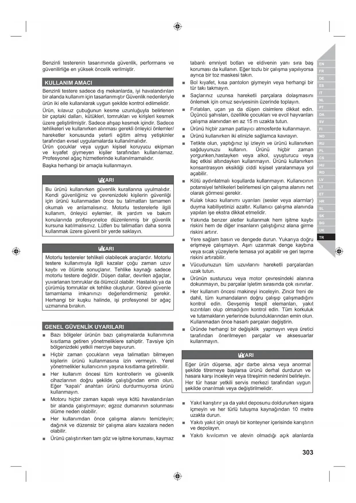 – CE işaretli olmalı ve EN 166 (güvenlik gözlükleri için) veya EN 1731’e (tel örgü vizörler için) uygun olmalıdır Eldivenler – EN381-7 uyumlu CE markalı olmalıdır Bacak koruma (çatlak) – EN381-5 uyumlu, CE markalı olmalı ve eksiksiz koruma sağlamalıdır. Motorlu testere emniyet çizmeleri – EN ISO 20345:2004 ile uyumlu olmalı ve EN 381- 3 uyumu belirtmek için motorlu testere gösterir bir plakayla işaretlenmelidir. (Zemin düzse ve tökezlenme ve ağaçaltı çalılara takılma riski düşükse, geçici kullanıcılar koruyucu tozluklara sahip, çelik burunlu EN 381-9 uyumlu emniyet çizmesi kullanabilir) Üst beden koruması için motorlu testere ceketleri – EN 381-11’ye uygun ve CE işaretli olmalıdır MONTAJ UYARI Herhangi bir parça eksik ya da hasarlıysa o parçaları değiştirmeden ürünü çalıştırmayın. Bu uyarıya dikkat etmemek ciddi yaralanma ile sonuçlanabilir. TESTERE ZİNCİRİ VE KILAVUZ ÇUBUĞUNUN MONTAJI (bkz. sayfa 317 - 319)