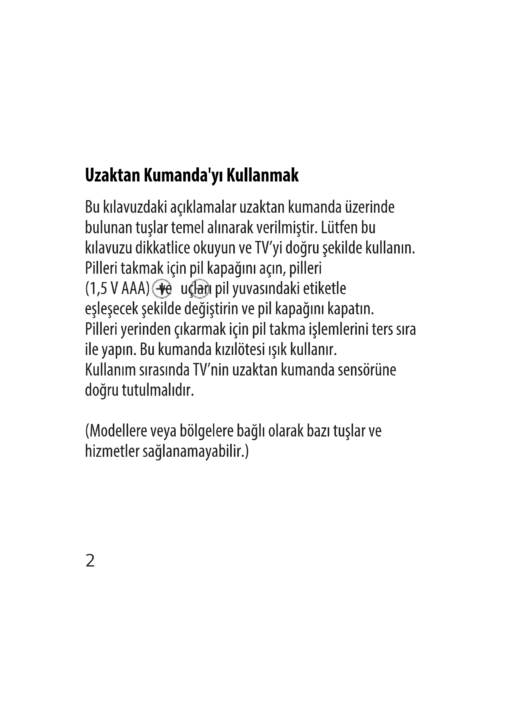 Standart Kumanda2 Uzaktan Kumanda'yı Kullanmak Bu kılavuzdaki açıklamalar uzaktan kumanda üzerinde bulunan tuşlar temel alınarak verilmiştir. Lütfen bu kılavuzu dikkatlice okuyun ve TV’yi doğru şekilde kullanın. Pilleri takmak için pil kapağını açın, pilleri (1,5V AAA) ve uçları pil yuvasındaki etiketle eşleşecek şekilde değiştirin ve pil kapağını kapatın. Pilleri yerinden çıkarmak için pil takma işlemlerini ters sıra ile yapın. Bu kumanda kızılötesi ışık kullanır. Kullanım sırasında TV’nin uzaktan kumanda sensörüne doğru tutulmalıdır. (Modellere veya bölgelere bağlı olarak bazı tuşlar ve hizmetler sağlanamayabilir.) Tuşu kullanmak için tuşa 1 saniyeden uzun süreyle basılı tutun. (Güç) TV'yi açar ya da kapatır. (Giriş) Giriş kaynağını değiştirir.