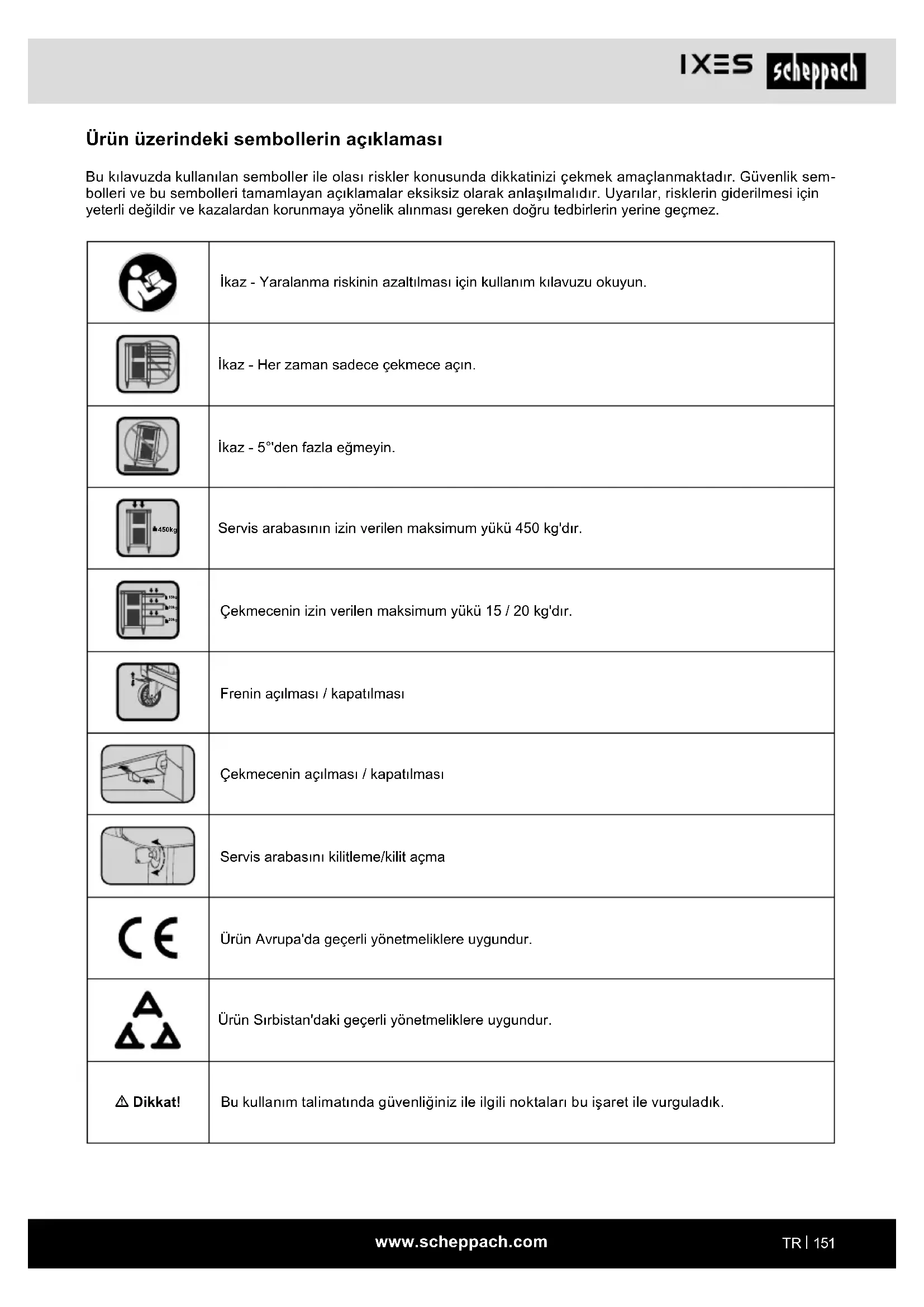Ürün üzerindeki sembollerin açıklaması Bu kılavuzda kullanılan semboller ile olası riskler konusunda dikkatinizi çekmek amaçlanmaktadır. Güvenlik sem- bolleri ve bu sembolleri tamamlayan açıklamalar eksiksiz olarak anlaşılmalıdır. Uyarılar, risklerin giderilmesi için yeterli değildir ve kazalardan korunmaya yönelik alınması gereken doğru tedbirlerin yerine geçmez. İkaz - Yaralanma riskinin azaltılması için kullanım kılavuzu okuyun. İkaz - Her zaman sadece çekmece açın. İkaz - 5°'den fazla eğmeyin. 450kg Servis arabasının izin verilen maksimum yükü 450 kg'dır. 15kg 20kg 20kg Çekmecenin izin verilen maksimum yükü 15 / 20 kg'dır. Frenin açılması / kapatılması Çekmecenin açılması / kapatılması Servis arabasını kilitleme/kilit açma Ürün Avrupa'da geçerli yönetmeliklere uygundur. Ürün Sırbistan'daki geçerli yönetmeliklere uygundur. m Dikkat! Bu kullanım talimatında güvenliğiniz ile ilgili noktaları bu işaret ile vurguladık.www.scheppach.com
