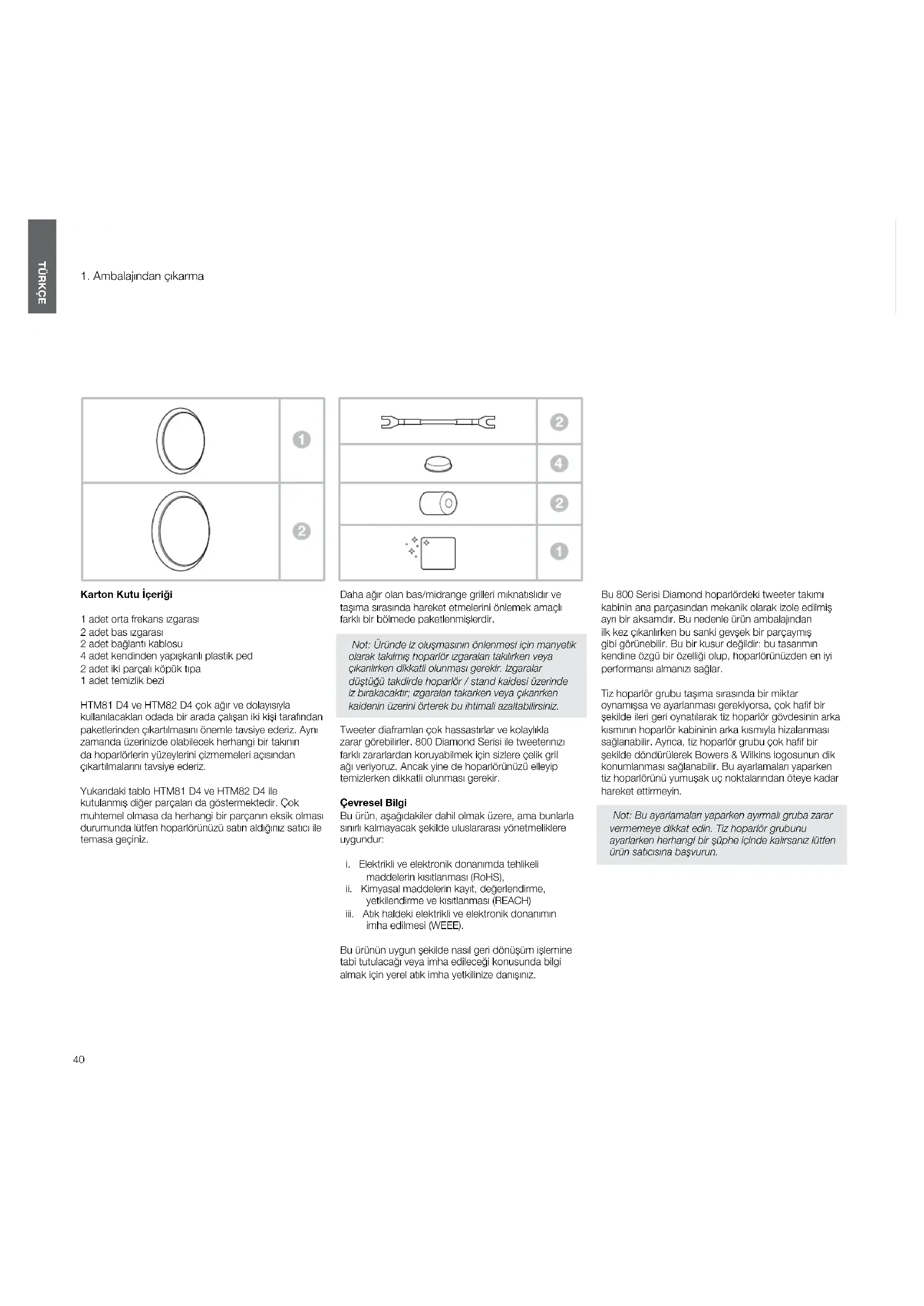 Karton Kutu İçeriği 1 adet orta frekans ızgarası 2 adet bas ızgarası 2 adet bağlantı kablosu 4 adet kendinden yapışkanlı plastik ped 2 adet iki parçalı köpük tıpa 1 adet temizlik bezi HTM81 D4 ve HTM82 D4 çok ağır ve dolayısıyla kullanılacakları odada bir arada çalışan iki kişi tarafından paketlerinden çıkartılmasını önemle tavsiye ederiz. Aynı zamanda üzerinizde olabilecek herhangi bir takının da hoparlörlerin yüzeylerini çizmemeleri açısından çıkartılmalarını tavsiye ederiz. Yukarıdaki tablo HTM81 D4 ve HTM82 D4 ile kutulanmış diğer parçaları da göstermektedir. Çok muhtemel olmasa da herhangi bir parçanın eksik olması durumunda lütfen hoparlörünüzü satın aldığınız satıcı ile temasa geçiniz. Daha ağır olan bas/midrange grilleri mıknatıslıdır ve taşıma sırasında hareket etmelerini önlemek amaçlı farklı bir bölmede paketlenmişlerdir. Not:Üründeizoluşmasınınönlenmesiiçinmanyetik olaraktakılmışhoparlörızgaralarıtakılırkenveya çıkarılırkendikkatliolunmasıgerekir.Izgaralar düştüğütakdirdehoparlör/standkaidesiüzerinde izbırakacaktır;ızgaralarıtakarkenveyaçıkarırken kaideninüzeriniörterekbuihtimaliazaltabilirsiniz. Tweeter diaframları çok hassastırlar ve kolaylıkla zarar görebilirler. 800 Diamond Serisi ile tweeterınızı farklı zararlardan koruyabilmek için sizlere çelik gril ağı veriyoruz. Ancak yine de hoparlörünüzü elleyip temizlerken dikkatli olunması gerekir. Çevresel Bilgi Bu ürün, aşağıdakiler dahil olmak üzere, ama bunlarla sınırlı kalmayacak şekilde uluslararası yönetmeliklere uygundur:
