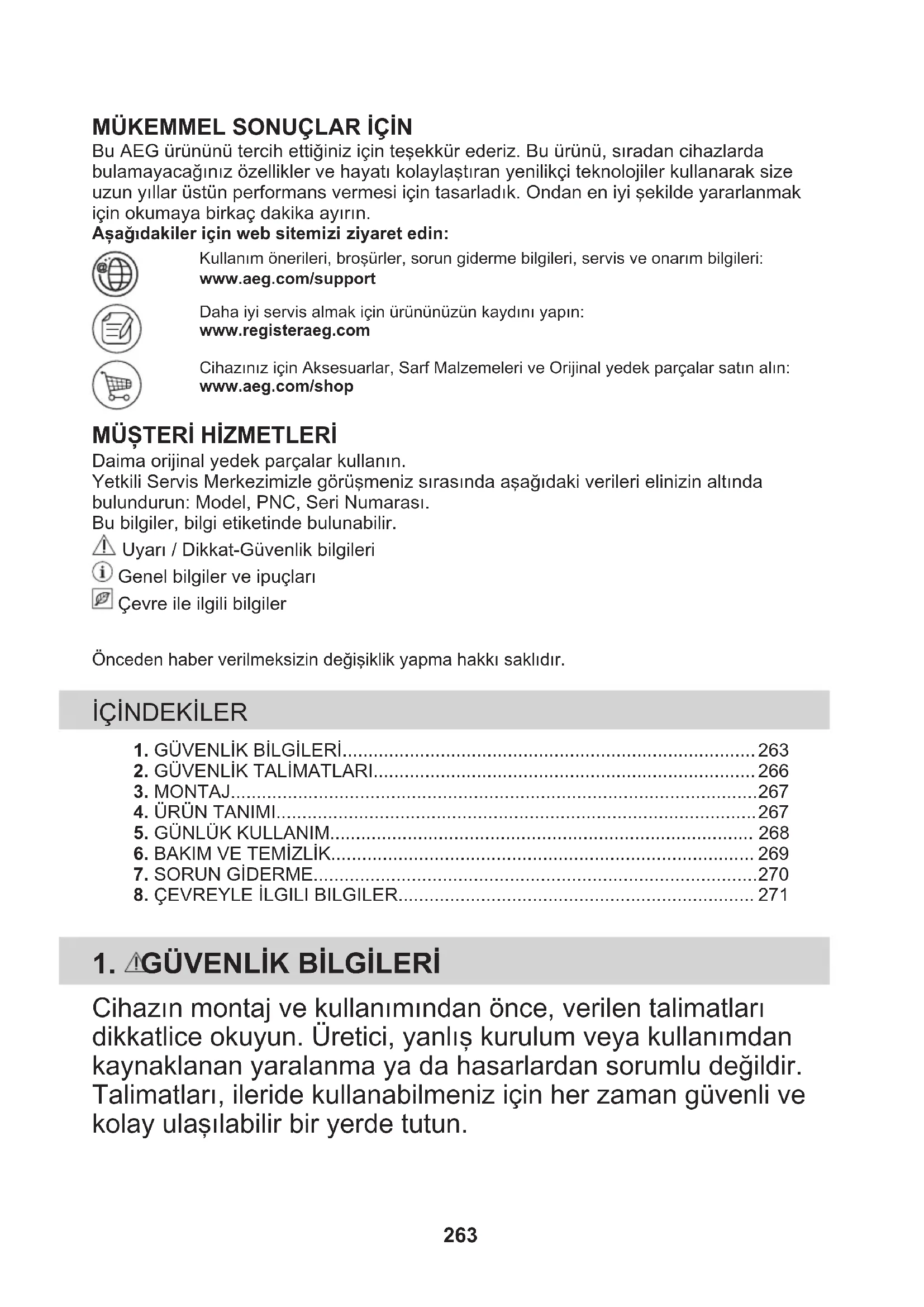 Bu AEG ürününü tercih ettiğiniz için teşekkür ederiz. Bu ürünü, sıradan cihazlardabulamayacağınız özellikler ve hayatı kolaylaştıran yenilikçi teknolojiler kullanarak sizeuzun yıllar üstün performans vermesi için tasarladık. Ondan en iyi şekilde yararlanmakiçin okumaya birkaç dakika ayırın.Aşağıdakiler için web sitemizi ziyaret edin:Kullanım önerileri, broşürler, sorun giderme bilgileri, servis ve onarım bilgileri:www.aeg.com/supportDaha iyi servis almak için ürününüzün kaydını yapın:www.registeraeg.comCihazınız için Aksesuarlar, Sarf Malzemeleri ve Orijinal yedek parçalar satın alın:www.aeg.com/shop