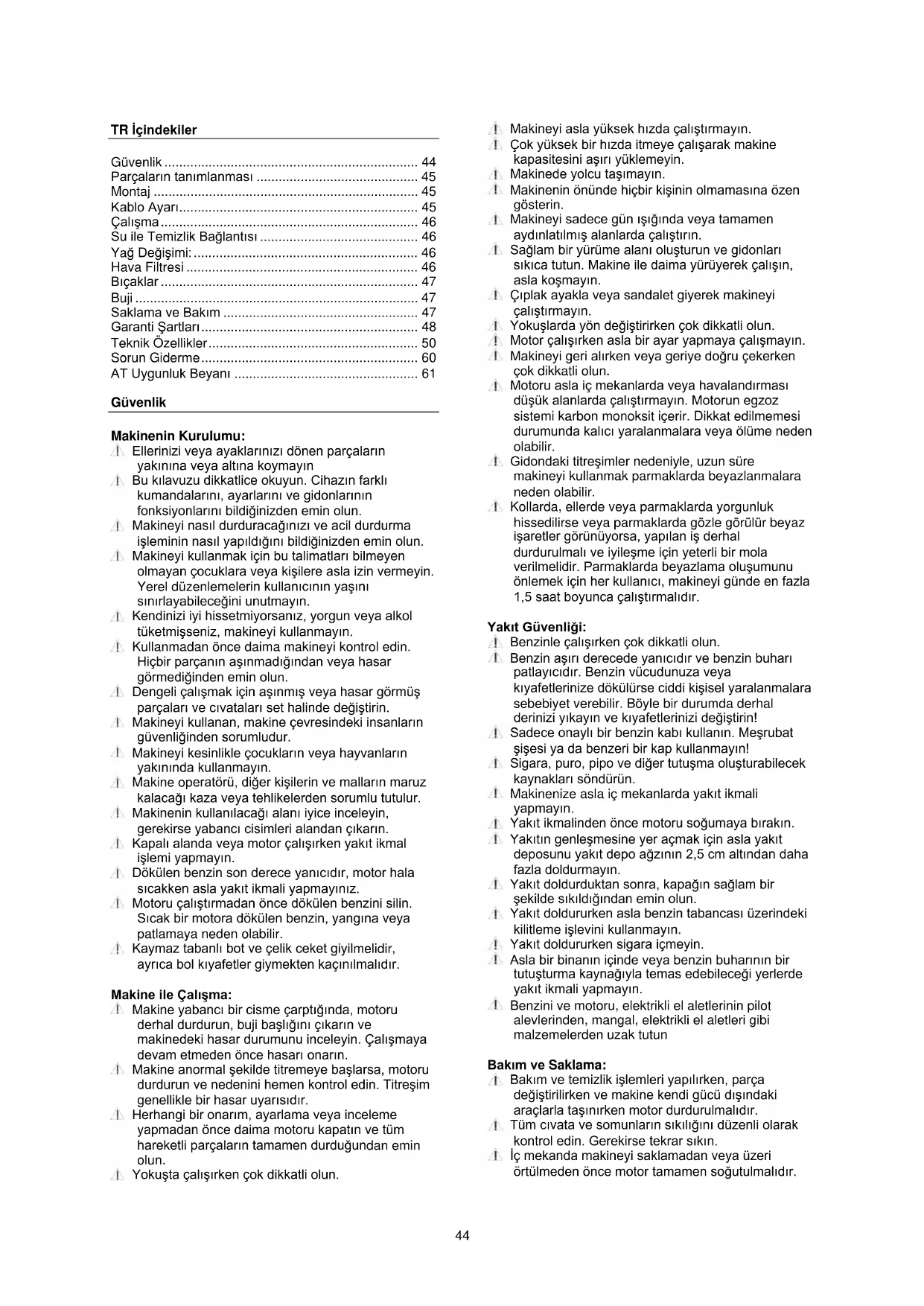 - Altre condizioni dove Texas non può essere ritenuta responsabile. Se un caso sia un reclamo in garanzia o meno viene determinato in ciascun caso da un centro di assistenza autorizzato. La tua ricevuta è la tua nota di garanzia, ecco perché dovrebbe essere conservata. RICORDA: L’acquisto di parti di ricambio così come qualsiasi richiesta di riparazione in garanzia, art. numero (es. 900662XX), anno e numero di serie dovrebbero sempre essere registrati. Può essere trovato sull’etichetta CE situata nella parte posteriore del piatto di taglio dietro il motore! *Ci riserviamo il diritto di cambiare le condizioni e non ci assumiamo alcuna responsabilità per eventuali errori di stampa44 TR İçindekiler Güvenlik ..................................................................... 44 Parçaların tanımlanması ............................................ 45 Montaj ........................................................................ 45 Kablo Ayarı ................................................................. 45 Çalışma ...................................................................... 46 Su ile Temizlik Bağlantısı ........................................... 46 Yağ Değişimi: ............................................................. 46 Hava Filtresi ............................................................... 46 Bıçaklar ...................................................................... 47 Buji ............................................................................. 47 Saklama ve Bakım ..................................................... 47 Garanti Şartları ........................................................... 48 Teknik Özellikler ......................................................... 50 Sorun Giderme ........................................................... 60 AT Uygunluk Beyanı .................................................. 61 Güvenlik Makinenin Kurulumu: Ellerinizi veya ayaklarınızı dönen parçaların yakınına veya altına koymayın Bu kılavuzu dikkatlice okuyun. Cihazın farklı kumandalarını, ayarlarını ve gidonlarının fonksiyonlarını bildiğinizden emin olun. Makineyi nasıl durduracağınızı ve acil durdurma işleminin nasıl yapıldığını bildiğinizden emin olun. Makineyi kullanmak için bu talimatları bilmeyen olmayan çocuklara veya kişilere asla izin vermeyin. Yerel düzenlemelerin kullanıcının yaşını sınırlayabileceğini unutmayın. Kendinizi iyi hissetmiyorsanız, yorgun veya alkol tüketmişseniz, makineyi kullanmayın. Kullanmadan önce daima makineyi kontrol edin. Hiçbir parçanın aşınmadığından veya hasar görmediğinden emin olun. Dengeli çalışmak için aşınmış veya hasar görmüş parçaları ve cıvataları set halinde değiştirin. Makineyi kullanan, makine çevresindeki insanların güvenliğinden sorumludur. Makineyi kesinlikle çocukların veya hayvanların yakınında kullanmayın. Makine operatörü, diğer kişilerin ve malların maruz kalacağı kaza veya tehlikelerden sorumlu tutulur. Makinenin kullanılacağı alanı iyice inceleyin, gerekirse yabancı cisimleri alandan çıkarın. Kapalı alanda veya motor çalışırken yakıt ikmal işlemi yapmayın. Dökülen benzin son derece yanıcıdır, motor hala sıcakken asla yakıt ikmali yapmayınız. Motoru çalıştırmadan önce dökülen benzini silin. Sıcak bir motora dökülen benzin, yangına veya patlamaya neden olabilir. Kaymaz tabanlı bot ve çelik ceket giyilmelidir, ayrıca bol kıyafetler giymekten kaçınılmalıdır. Makine ile Çalışma: Makine yabancı bir cisme çarptığında, motoru derhal durdurun, buji başlığını çıkarın ve makinedeki hasar durumunu inceleyin. Çalışmaya devam etmeden önce hasarı onarın. Makine anormal şekilde titremeye başlarsa, motoru durdurun ve nedenini hemen kontrol edin. Titreşim genellikle bir hasar uyarısıdır. Herhangi bir onarım, ayarlama veya inceleme yapmadan önce daima motoru kapatın ve tüm hareketli parçaların tamamen durduğundan emin olun. Yokuşta çalışırken çok dikkatli olun. Makineyi asla yüksek hızda çalıştırmayın. Çok yüksek bir hızda itmeye çalışarak makine kapasitesini aşırı yüklemeyin. Makinede yolcu taşımayın. Makinenin önünde hiçbir kişinin olmamasına özen gösterin. Makineyi sadece gün ışığında veya tamamen aydınlatılmış alanlarda çalıştırın. Sağlam bir yürüme alanı oluşturun ve gidonları sıkıca tutun. Makine ile daima yürüyerek çalışın, asla koşmayın. Çıplak ayakla veya sandalet giyerek makineyi çalıştırmayın. Yokuşlarda yön değiştirirken çok dikkatli olun. Motor çalışırken asla bir ayar yapmaya çalışmayın. Makineyi geri alırken veya geriye doğru çekerken çok dikkatli olun. Motoru asla iç mekanlarda veya havalandırması düşük alanlarda çalıştırmayın. Motorun egzoz sistemi karbon monoksit içerir. Dikkat edilmemesi durumunda kalıcı yaralanmalara veya ölüme neden olabilir. Gidondaki titreşimler nedeniyle, uzun süre makineyi kullanmak parmaklarda beyazlanmalara neden olabilir. Kollarda, ellerde veya parmaklarda yorgunluk hissedilirse veya parmaklarda gözle görülür beyaz işaretler görünüyorsa, yapılan iş derhal durdurulmalı ve iyileşme için yeterli bir mola verilmelidir. Parmaklarda beyazlama oluşumunu önlemek için her kullanıcı, makineyi günde en fazla 1,5 saat boyunca çalıştırmalıdır. Yakıt Güvenliği: Benzinle çalışırken çok dikkatli olun. Benzin aşırı derecede yanıcıdır ve benzin buharı patlayıcıdır. Benzin vücudunuza veya kıyafetlerinize dökülürse ciddi kişisel yaralanmalara sebebiyet verebilir. Böyle bir durumda derhal derinizi yıkayın ve kıyafetlerinizi değiştirin! Sadece onaylı bir benzin kabı kullanın. Meşrubat şişesi ya da benzeri bir kap kullanmayın! Sigara, puro, pipo ve diğer tutuşma oluşturabilecek kaynakları söndürün. Makinenize asla i