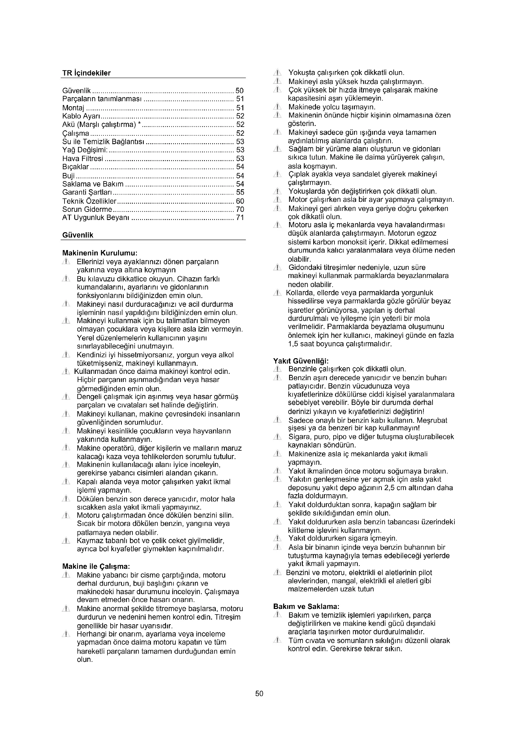- AT Uygunluk Beyanı Güvenlik Makinenin Kurulumu: Ellerinizi veya ayaklarınızı dönen parçaların yakınına veya altına koymayın Bu kılavuzu dikkatlice okuyun. Cihazın farklı kumandalarını, ayarlarını ve gidonları nın fonksiyonlarını bildiğinizden emin olun. Makineyi nasıl durduracağınızı ve acil durdurma işleminin nasıl yapıldığını bildiğinizden emin olun. Makineyi kullanmak için bu talimatları bilmeyen olmayan çocuklara veya kişilere asla izin vermeyin. Yerel düzenlemelerin kullanıcının yaşını sınırlayabileceğini unutmayın. Kendinizi iyi hissetmiyorsanız, yorgun veya alkol tüketmişseniz, makineyi kullanmayın. Kullanmadan önce daima makineyi kontrol edin. Hiçbir parçanın aşınmadığından veya hasar görmediğinden emin olun. Dengeli çalışmak için aşınmış veya hasar görmüş parçaları ve cıvataları set halinde değiştirin. Makineyi kullanan, makine çevresindeki insanların güvenliğinden sorumludur. Makineyi kesinlikle çocukların veya hayvanların yakınında kullanmayın. Makine operatörü, diğer kişilerin ve malların maruz kalacağı kaza veya tehlikelerden sorumlu tutulur. Makinenin kullanılacağı alanı iyice inceleyin, gerekirse yabancı cisimleri alandan çıkarın. Kapalı alanda veya motor çalışırken yakıt ikmal işlemi yapmayın. Dökülen benzin son derece yanıcıdır, motor hala sıcakken asla yakıt ikmali yapmayınız. Motoru çalıştırmadan önce dökülen benzini silin. Sıcak bir motora dökülen benzin, yangına veya patlamaya neden olabilir. Kaymaz tabanlı bot ve çelik ceket giyilmelidir, ayrıca bol kıyafetler giymekten kaçınılmalıdır. Makine ile Çalışma: Makine yabancı bir cisme çarptığında, motoru derhal durdurun, buji başlığını çıkarın ve makinedeki hasar durumunu inceleyin. Çalışmaya devam etmeden önce hasarı onarın. Makine anormal şekilde titremeye başlarsa, motoru durdurun ve nedenini hemen kontrol edin. Titreşim genellikle bir hasar uyarısıdır. Herhangi bir onarım, ayarlama veya inceleme yapmadan önce daima motoru kapatın ve tüm hareketli parçaları n tamamen durduğundan emin olun. Yokuşta çalışırken çok dikkatli olun. Makineyi asla yüksek hızda çalıştırmayın. Çok yüksek bir hızda itmeye çalışarak makine kapasitesini aşırı yüklemeyin. Makinede yolcu taşımayın. Makinenin önünde hiçbir kişinin olmamasına özen gösterin. Makineyi sadece gün ışığında veya tamamen aydınlatılmış alanlarda çalıştırın. Sağlam bir yürüme alanı oluşturun ve gidonları sıkıca tutun. Makine ile daima yürüyerek çalışın, asla koşmayın. Çıplak ayakla veya sandalet giyerek makineyi çalıştırmayın. Yokuşlarda yön değiştirirken çok dikkatli olun. Motor çalışırken asla bir ayar yapmaya çalışmayın. Makineyi geri alırken veya geriye doğru çekerken çok dikkatli olun. Motoru asla iç mekanlarda veya havalandırması düşük alanlarda çalıştırmayın. Motorun egzoz sistemi karbon monoksit içerir. Dikkat edilmemesi durumunda kalıcı yaralanmalara veya ölüme neden olabilir. Gidondaki titreşimler nedeniyle, uzun süre makineyi kullanmak parmaklarda beyazlanmalara neden olabilir. Kollarda, ellerde veya parmaklarda yorgunluk hissedilirse veya parmaklarda gözle görülür beyaz işaretler görünüyorsa, yapılan iş derhal durdurulmalı ve iyileşme için yeterli bir mola verilmelidir. Parmaklarda beyazlama oluşumunu önlemek için her kullanıcı, makineyi günde en fazla 1,5 saat boyunca çalıştırmalıdır. Yakıt Güvenliği: Benzinle çalışırken çok dikkatli olun. Benzin aşırı derecede yanıcıdır ve benzin buharı patlayıcıdır. Benzin vücudunuza veya kıyafetlerinize dökülürse ciddi kişisel yaralanmalara sebebiyet verebilir. Böyle bir durumda derhal derinizi yıkayın ve kıyafetlerinizi değiştirin! Sadece onaylı bir benzin kabı kullanın. Meşrubat şişesi ya da benzeri bir kap kullanmayın! Sigara, puro, pipo ve diğer tutuşma oluşturabilecek kaynakları söndürün. Makinenize asla iç mekanlarda yakıt ikmali yapmayın. Yakıt ikmalinden önce motoru soğumaya bırakın. Yakıtın genleşmesine yer açmak için asla yakıt deposunu yakıt depo ağzının 2,5 cm altından daha fazla doldurmayın. Yakıt doldurduktan sonra, kapağın sağlam bir şekilde sıkıldığından emin olun. Yakıt doldururken asla benzin tabancası üzerindeki kilitleme işlevini kullanmayın. Yakıt doldururken sigara içmeyin. Asla bir binanın içinde veya benzin buharının bir tutuşturma kaynağıyla temas edebileceği yerlerde yakıt ikmali yapmayın. Benzini ve motoru, elektrikli el aletlerinin pilot alevlerinden, mangal, elektrikli el aletleri gibi malzemelerden uzak tutun Bakım ve Saklama: Bakım ve temizlik işlemleri yapılırken, parça değiştirilirken ve makine kendi gücü dışındaki araçlarla taşınırken motor durdurulmalıdır. Tüm cıvata ve somunların sıkılığını düzenli olarak kontrol edin. Gerekirse tekrar sıkın.51 İç mekanda makineyi saklamadan veya üzeri örtülmeden önce motor tamamen soğutulmalıdır. Makine bir süre kullanılmayacak ise, lütfen bu kılavuzdaki talimatlara okuyun. Güvenlik ve talimat etiketlerini koruyun ve gerektiğinde değiştirin. Sadece orijinal yedek parçalar veya aksesuarlar kullanın. Orijinal parçalar veya aksesuarlar kullanılmıyorsa, makine garanti kapsamından çıkmıştır. Muhtelif Bilgiler: Motora ilk kullanımınızdan önce yağ doldurulmamıştır. Her zaman çalıştırmadan önce motor yağı seviyesini kontrol edin Gidona monte edilmiş debriyaj kablosu gibi fabrikada takılan kontrol cihazları çıkarılmamalı veya açıkta bırakılmamalıdır. Yakıt deposunu sadece açık havada boşaltı n. Benzin son derece yanıcıdır ve benzin buharı patlayıcıdır. Makineyi taşırken düzgün bir şekilde sabitlendiğinden emin olun. p. 71