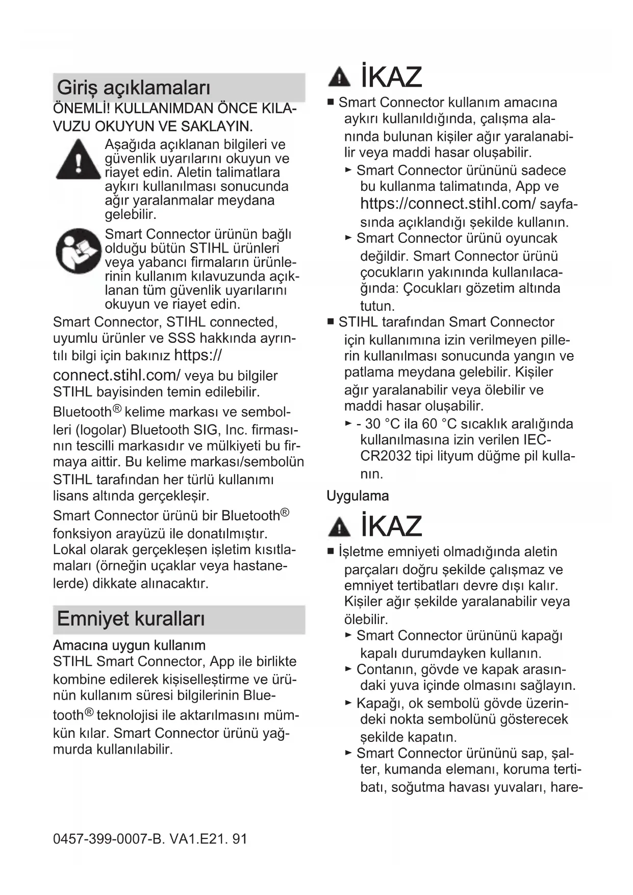 VUZU OKUYUN VE SAKLAYIN. Aşağıda açıklanan bilgileri ve güvenlik uyarılarını okuyun ve riayet edin. Aletin talimatlara aykırı kullanılması sonucunda ağır yaralanmalar meydana gelebilir. Smart Connector ürünün bağlı olduğu bütün STIHL ürünleri veya yabancı firmaların ürünle‐ rinin kullanım kılavuzunda açık‐ lanan tüm güvenlik uyarılarını okuyun ve riayet edin. Smart Connector, STIHL connected, uyumlu ürünler ve SSS hakkında ayrın‐ tılı bilgi için bakınız https:// connect.stihl.com/ veya bu bilgiler STIHL bayisinden temin edilebilir. Bluetooth