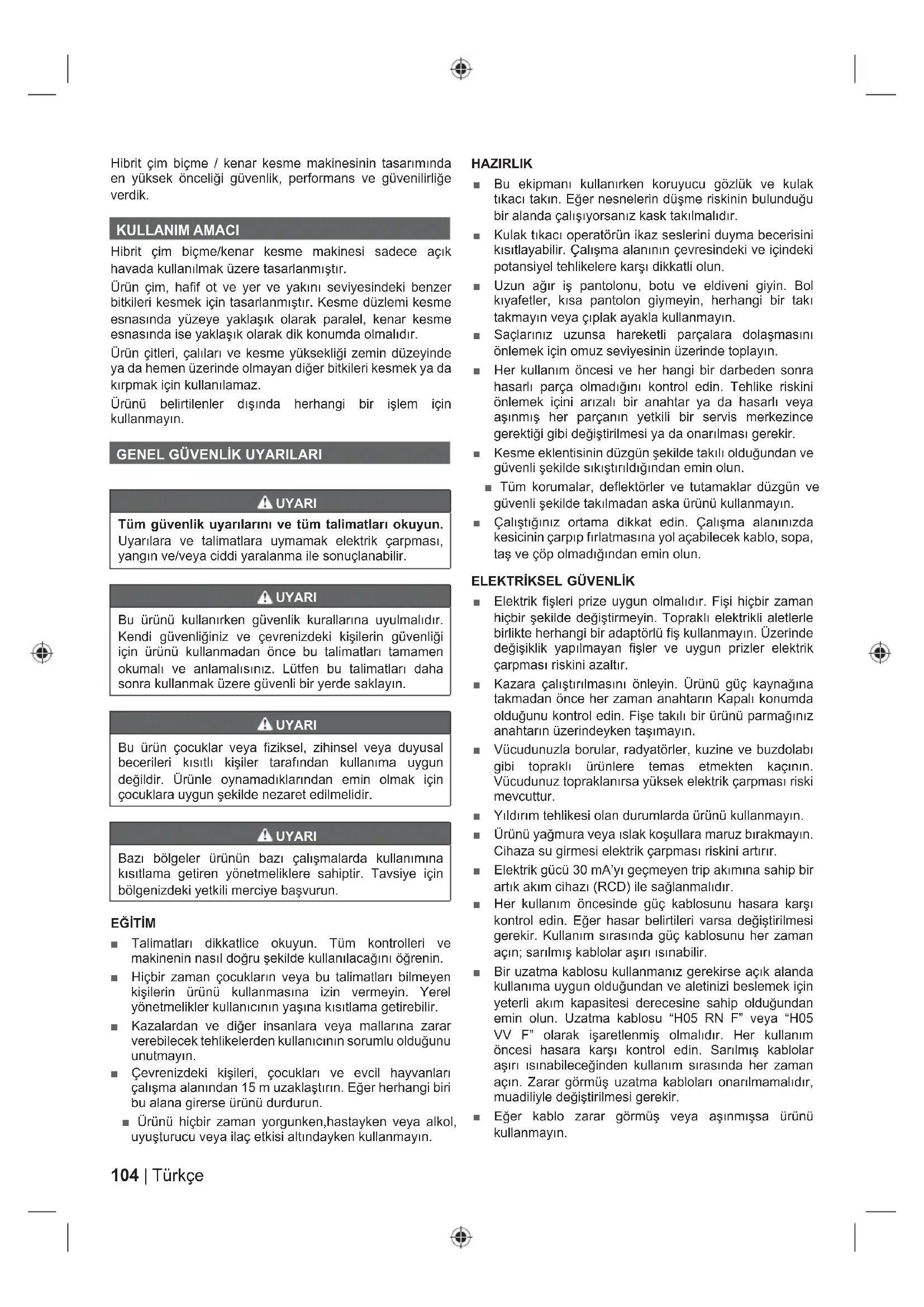 Попередження104 | Türkçe Hibrit çim biçme / kenar kesme makinesinin tasarımında en yüksek önceliği güvenlik, performans ve güvenilirliğe verdik. KULLANIM AMACI Hibrit çim biçme/kenar kesme makinesi sadece açık havada kullanılmak üzere tasarlanmıştır. Ürün çim, hafi f ot ve yer ve yakını seviyesindeki benzer bitkileri kesmek için tasarlanmıştır. Kesme düzlemi kesme esnasında yüzeye yaklaşık olarak paralel, kenar kesme esnasında ise yaklaşık olarak dik konumda olmalıdır. Ürün çitleri, çalıları ve kesme yüksekliği zemin düzeyinde ya da hemen üzerinde olmayan diğer bitkileri kesmek ya da kırpmak için kullanılamaz. Ürünü belirtilenler dışında herhangi bir işlem için kullanmayın.