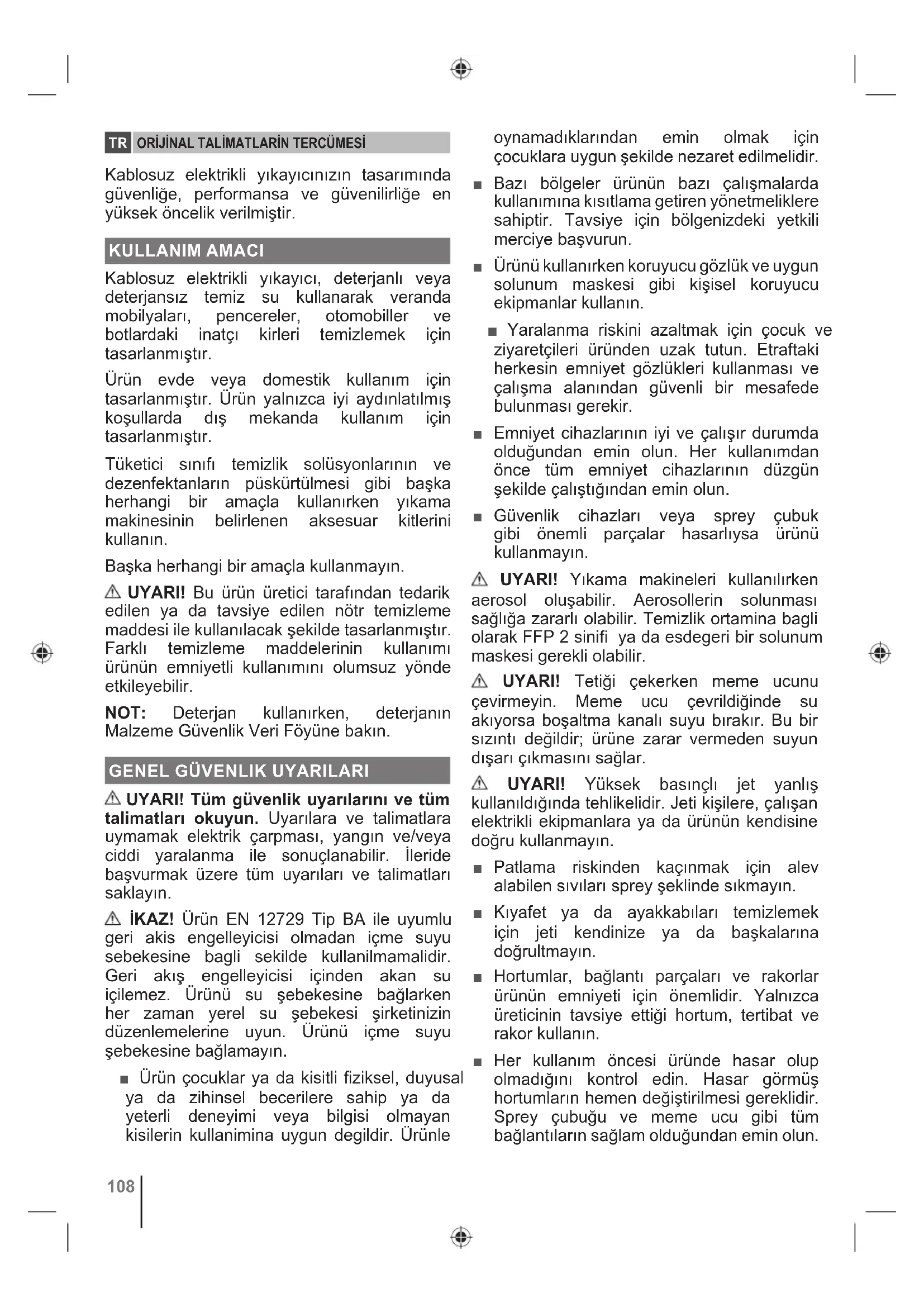 TRTR ORİJİNAL TALİMATLARİN TERCÜMESİ Kablosuz elektrikli yıkayıcınızın tasarımında güvenliğe, performansa ve güvenilirliğe en yüksek öncelik verilmiştir. KULLANIM AMACI Kablosuz elektrikli yıkayıcı, deterjanlı veya deterjansız temiz su kullanarak veranda mobilyaları, pencereler, otomobiller ve botlardaki inatçı kirleri temizlemek için tasarlanmıştır. Ürün evde veya domestik kullanım için tasarlanmıştır. Ürün yalnızca iyi aydınlatılmış koşullarda dış mekanda kullanım için tasarlanmıştır. Tüketici sınıfı temizlik solüsyonlarının ve dezenfektanların püskürtülmesi gibi başka herhangi bir amaçla kullanırken yıkama makinesinin belirlenen aksesuar kitlerini kullanın. Başka herhangi bir amaçla kullanmayın. UYARI! Bu ürün üretici tarafından tedarik edilen ya da tavsiye edilen nötr temizleme maddesi ile kullanılacak şekilde tasarlanmıştır. Farklı temizleme maddelerinin kullanımı ürünün emniyetli kullanımını olumsuz yönde etkileyebilir. NOT: Deterjan kullanırken, deterjanın Malzeme Güvenlik Veri Föyüne bakın.