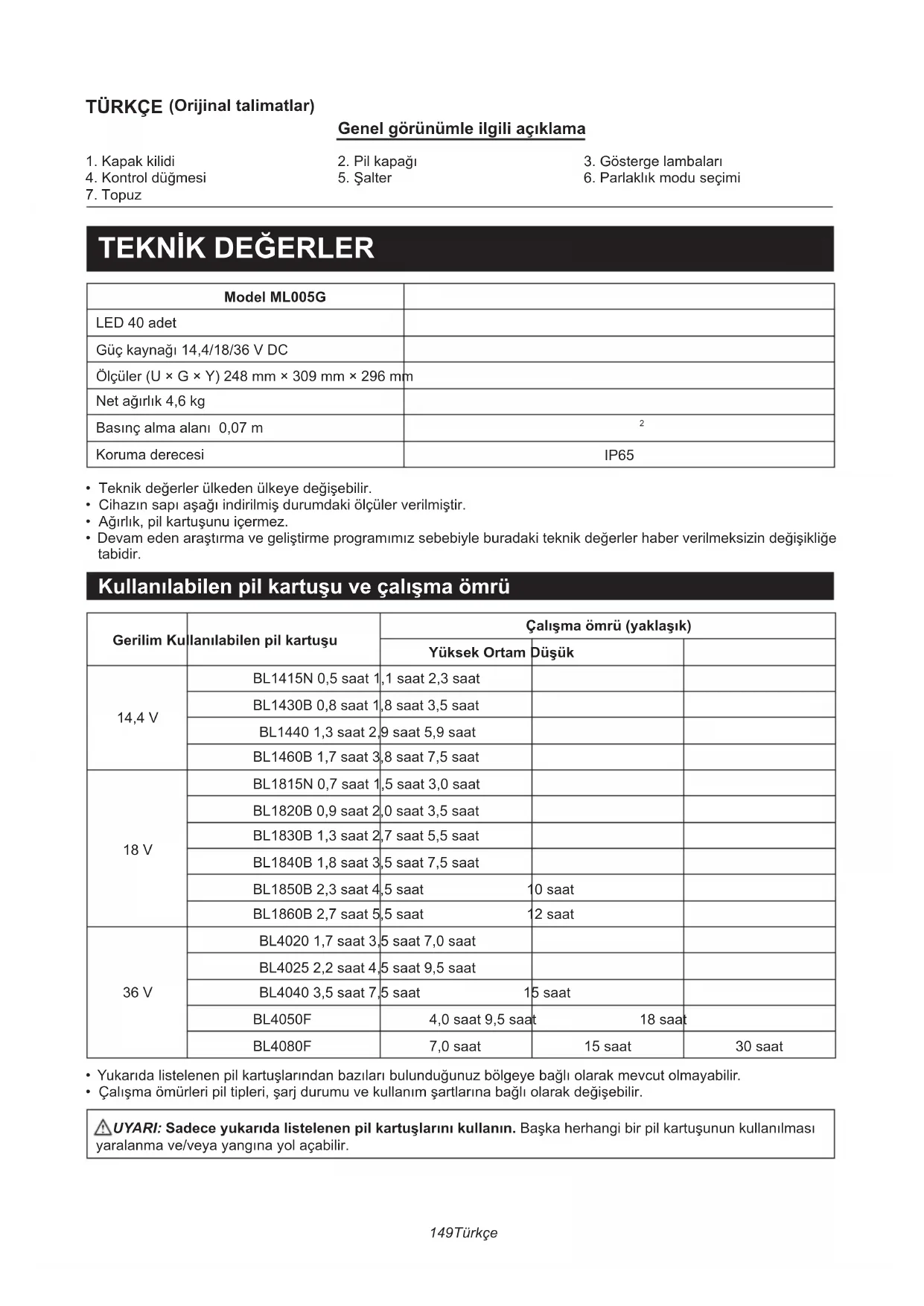 - Devam eden araştırma ve geliştirme programımız sebebiyle buradaki teknik değerler haber verilmeksizin değişikliğe tabidir. Kullanılabilen pil kartuşu ve çalışma ömrü Gerilim Kullanılabilen pil kartuşu Çalışma ömrü (yaklaşık) Yüksek Ortam Düşük 14,4 V BL1415N 0,5 saat 1,1 saat 2,3 saat BL1430B 0,8 saat 1,8 saat 3,5 saat BL1440 1,3 saat 2,9 saat 5,9 saat BL1460B 1,7 saat 3,8 saat 7,5 saat 18 V BL1815N 0,7 saat 1,5 saat 3,0 saat BL1820B 0,9 saat 2,0 saat 3,5 saat BL1830B 1,3 saat 2,7 saat 5,5 saat BL1840B 1,8 saat 3,5 saat 7,5 saat BL1850B 2,3 saat 4,5 saat 10 saat BL1860B 2,7 saat 5,5 saat 12 saat 36 V BL4020 1,7 saat 3,5 saat 7,0 saat BL4025 2,2 saat 4,5 saat 9,5 saat BL4040 3,5 saat 7,5 saat 15 saat BL4050F 4,0 saat 9,5 saat 18 saat BL4080F 7,0 saat 15 saat 30 saat