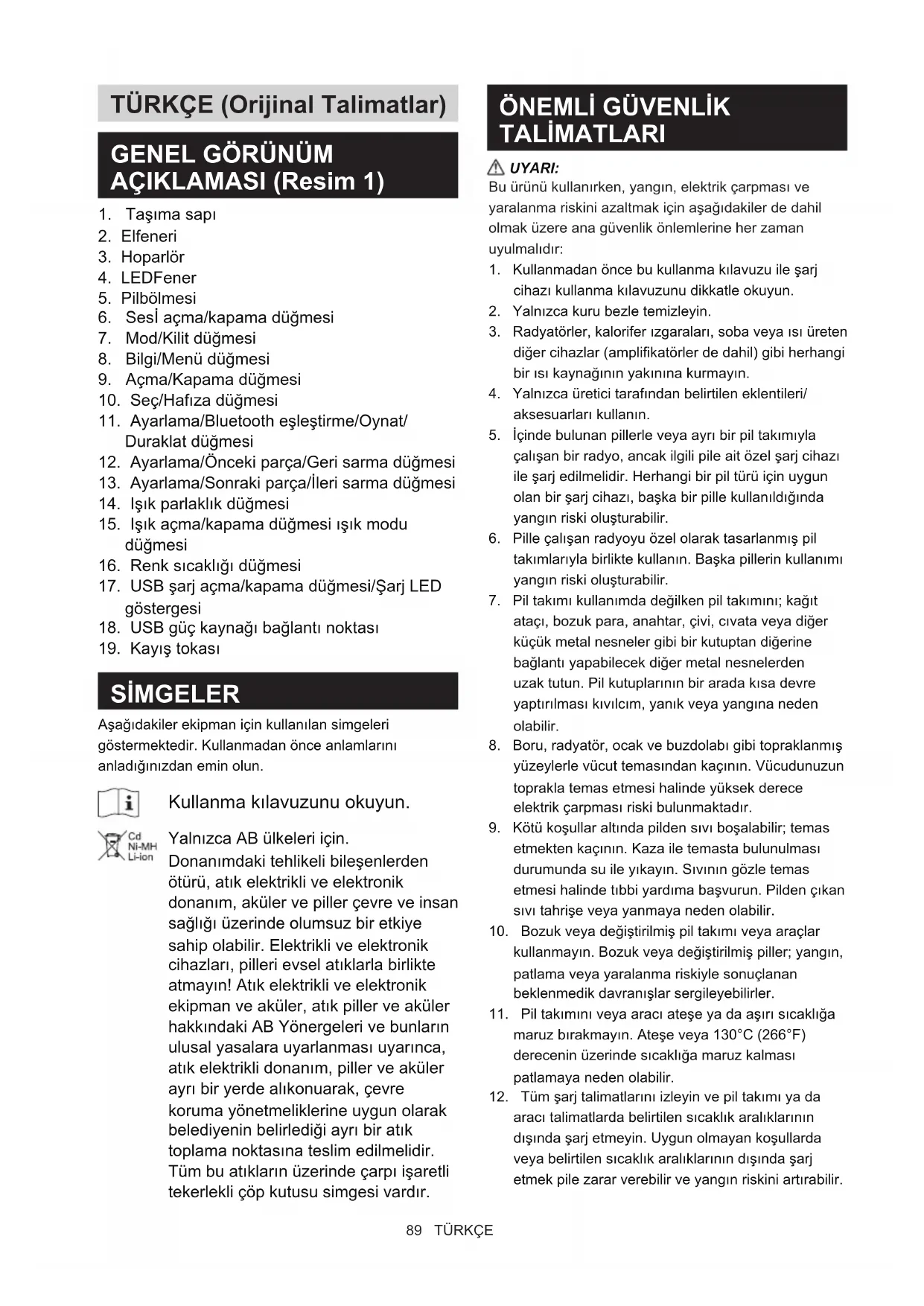 1. Kullanmadan önce bu kullanma kılavuzu ile şarj