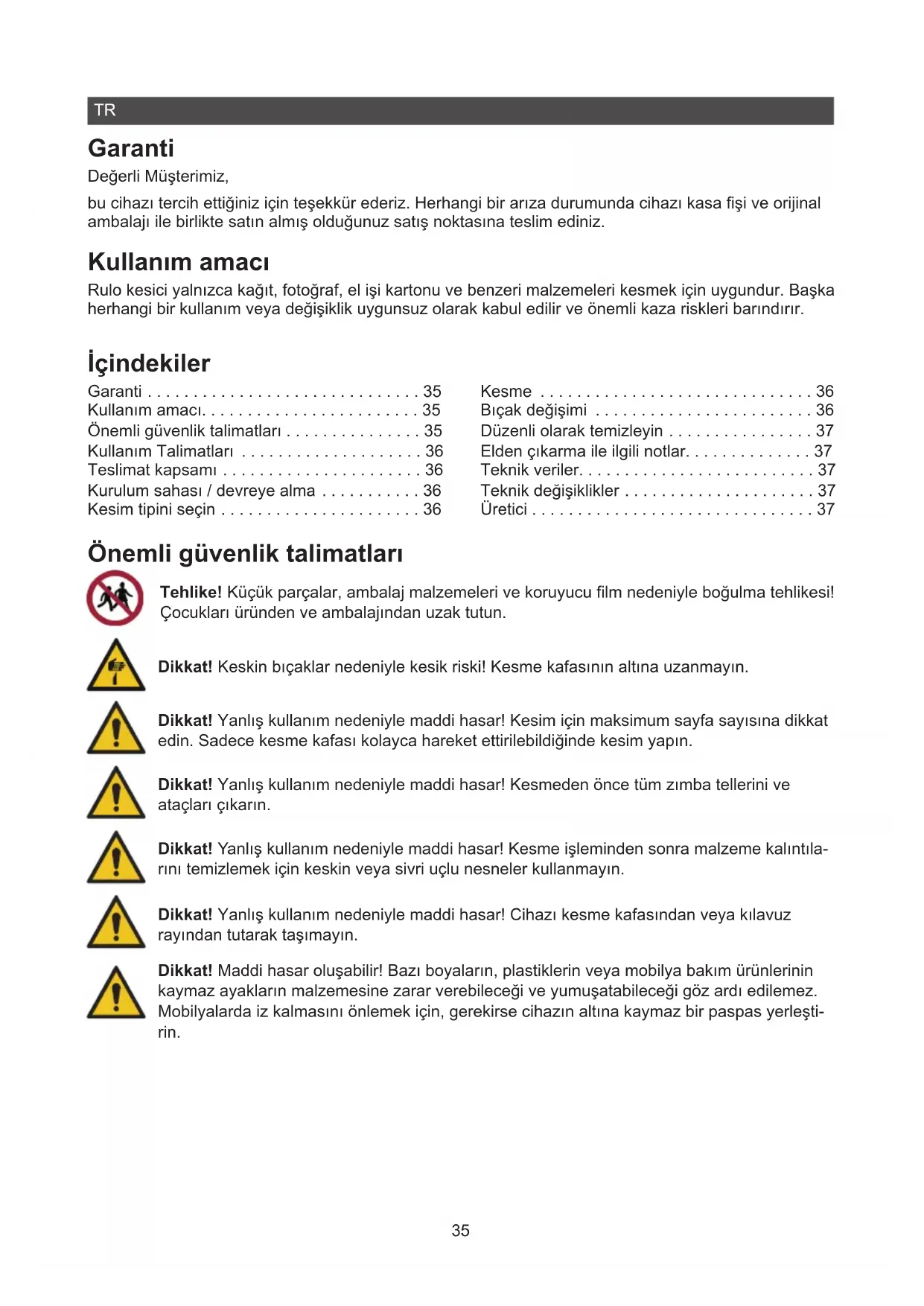 - Garanti Değerli Müşterimiz, bu cihazı tercih ettiğiniz için teşekkür ederiz. Herhangi bir arıza durumunda cihazı kasa fişi ve orijinal ambalajı ile birlikte satın almış olduğunuz satış noktasına teslim ediniz. Kullanım amacı Rulo kesici yalnızca kağıt, fotoğraf, el işi kartonu ve benzeri malzemeleri kesmek için uygundur. Başka herhangi bir kullanım veya değişiklik uygunsuz olarak kabul edilir ve önemli kaza riskleri barındırır. İçindekiler Garanti p. 35