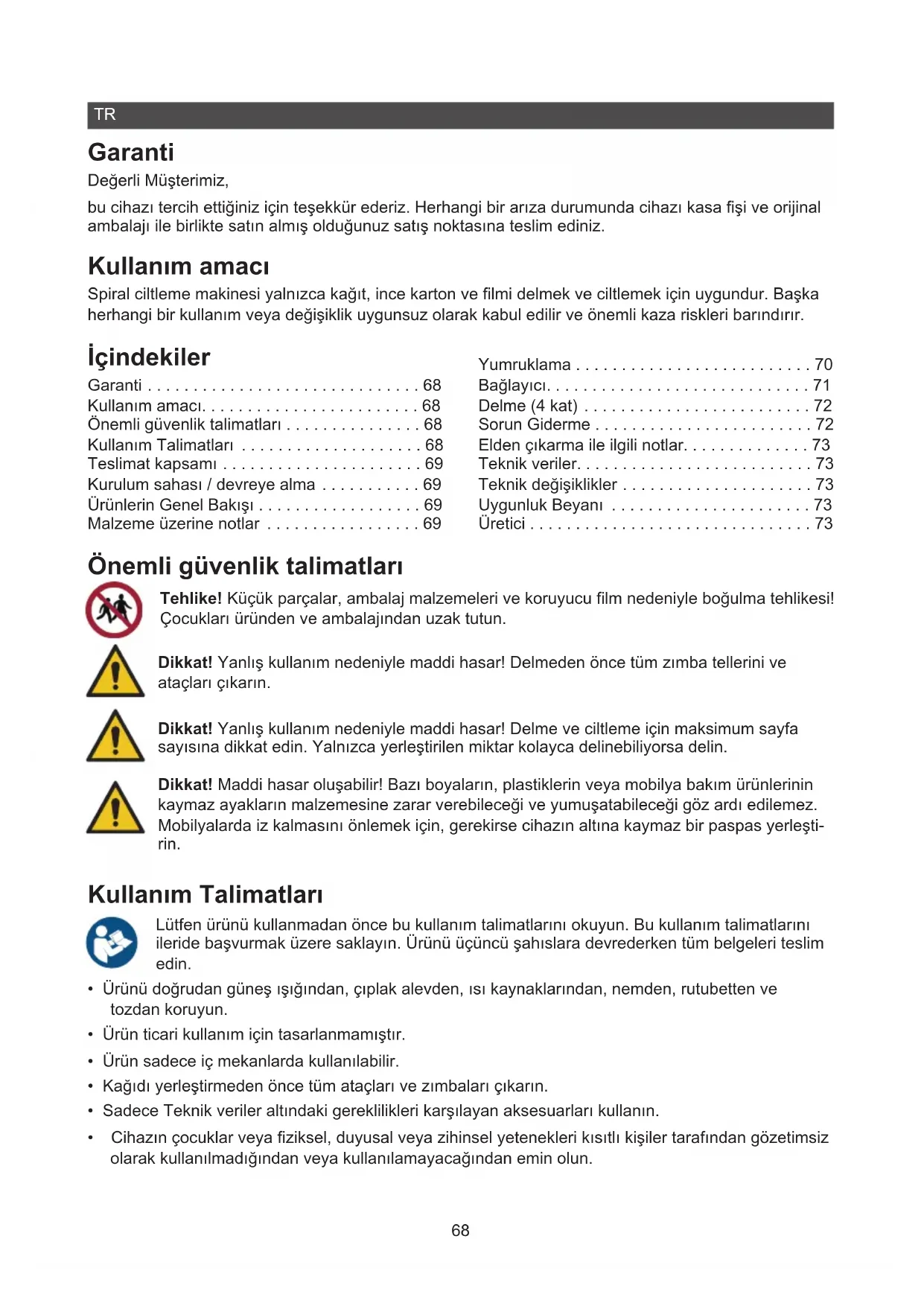 - Garanti Değerli Müşterimiz, bu cihazı tercih ettiğiniz için teşekkür ederiz. Herhangi bir arıza durumunda cihazı kasa fişi ve orijinal ambalajı ile birlikte satın almış olduğunuz satış noktasına teslim ediniz. Kullanım amacı Spiral ciltleme makinesi yalnızca kağıt, ince karton ve filmi delmek ve ciltlemek için uygundur. Başka herhangi bir kullanım veya değişiklik uygunsuz olarak kabul edilir ve önemli kaza riskleri barındırır. İçindekiler Garanti p. 68