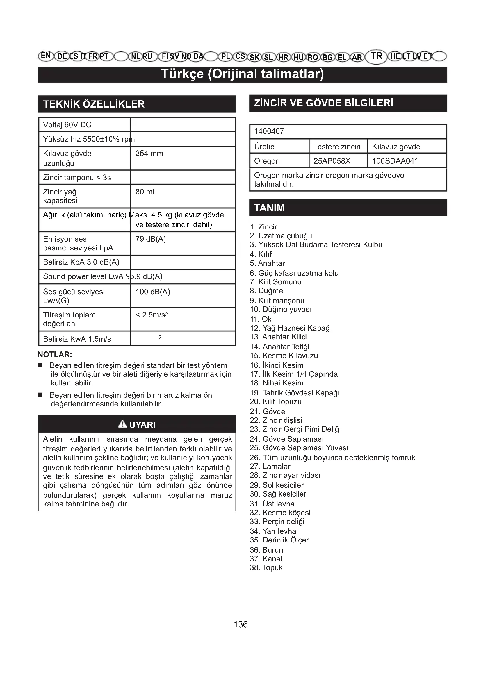 Voltaj 60V DCYüksüz hız 5500±10% rpmKılavuz gövdeuzunluğu254 mmZincir tamponu < 3sZincir yağkapasitesi80 mlAğırlık (akü takımı hariç) Maks. 4.5 kg (kılavuz gövde ve testere zinciri dahil)Emisyon sesbasıncı seviyesi LpA79 dB(A)Belirsiz KpA 3.0 dB(A)Sound power level LwA 95.9 dB(A)Ses gücü seviyesi LwA(G)100 dB(A)Titreşim toplamdeğeri ah< 2.5m/s Belirsiz KwA 1.5m/s NOTLAR: Beyan edilen titreşim değeri standart bir test yöntemi ile ölçülmüştür ve bir aleti diğeriyle karşılaştırmak için kullanılabilir. Beyan edilen titreşim değeri bir maruz kalma ön değerlendirmesinde kullanılabilir. UYARI Aletin kullanımı sırasında meydana gelen gerçek titreşim değerleri yukarıda belirtilenden farklı olabilir ve aletin kullanım şekline bağlıdır; ve kullanıcıyı koruyacak güvenlik tedbirlerinin belirlenebilmesi (aletin kapatıldığı ve tetik süresine ek olarak boşta çalıştığı zamanlar gibi çalışma döngüsünün tüm adımları göz önünde bulundurularak) gerçek kullanım koşullarına maruz kalma tahminine bağlıdır. ZİNCİR VE GÖVDE BİLGİLERİ Üretici Testere zinciri Kılavuz gövde Oregon 25AP058X 100SDAA041Oregon marka zincir oregon marka gövdeye takılmalıdır. TANIM 1. Zincir2. Uzatma çubuğu3. Yüksek Dal Budama Testeresi Kulbu4. Kılıf5. Anahtar6. Güç kafası uzatma kolu7. Kilit Somunu8. Düğme9. Kilit manşonu10. Düğme yuvası11. Ok12. Yağ Haznesi Kapağı13. Anahtar Kilidi14. Anahtar Tetiği15. Kesme Kılavuzu16. İkinci Kesim17. İlk Kesim 1/4 Çapında18. Nihai Kesim19. Tahrik Gövdesi Kapağı20. Kilit Topuzu21. Gövde22. Zincir dişlisi23. Zincir Gergi Pimi Deliği24. Gövde Saplaması25. Gövde Saplaması Yuvası26. Tüm uzunluğu boyunca desteklenmiş tomruk27. Lamalar28. Zincir ayar vidası29. Sol kesiciler30. Sağ kesiciler31. Üst levha32. Kesme köşesi33. Perçin deliği34. Yan levha35. Derinlik Ölçer36. Burun37. Kanal38. Topuk 136Türkçe (Orijinal talimatlar)