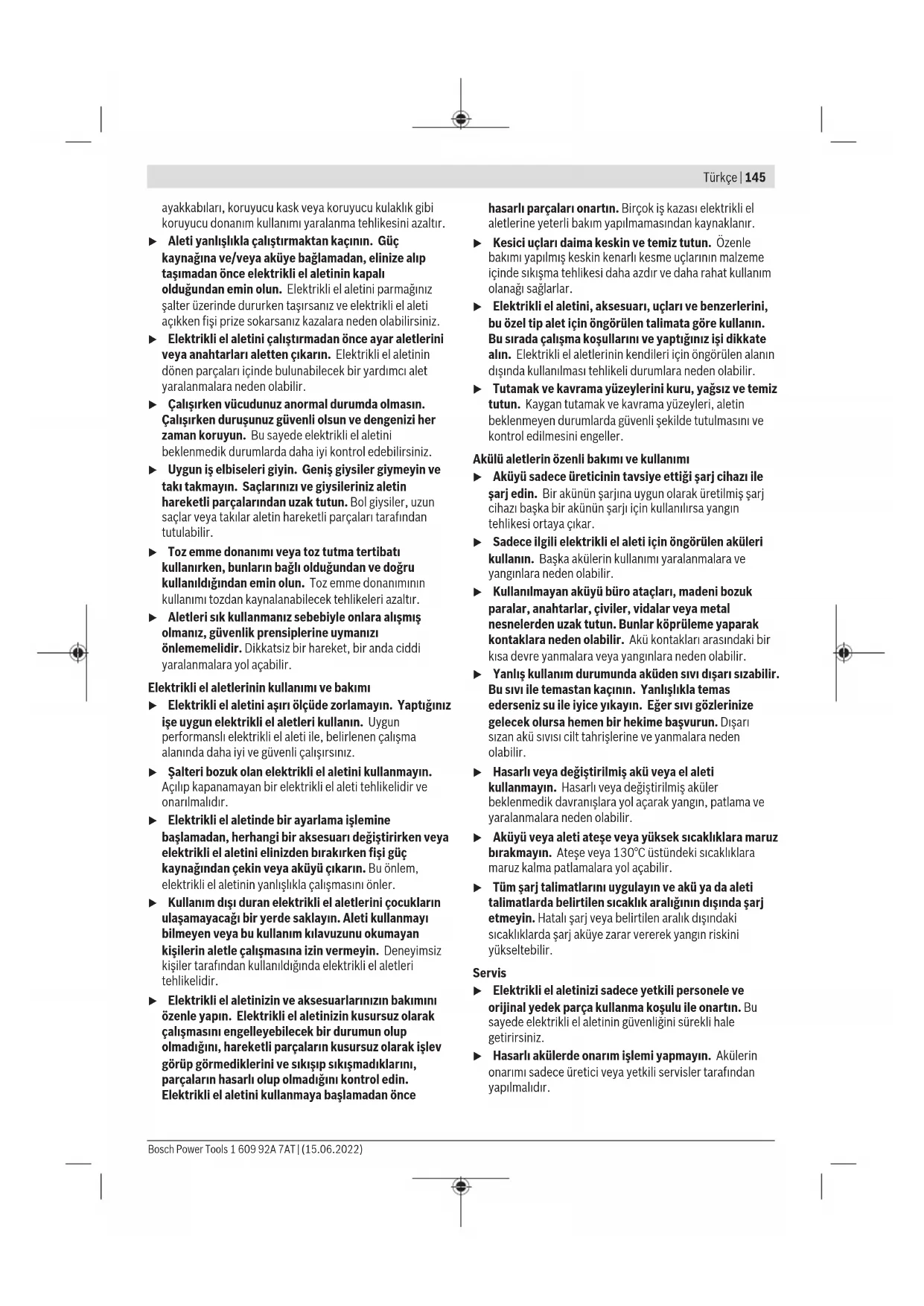 Τα ηλεκτρικά εργαλεία, οι μπαταρίες, τα εξαρτή- ματα και οι συσκευασίες πρέπει να ανακυκλώνο- νται με τρόπο φιλικό προς το περιβάλλον. Μην ρίχνετε τα ηλεκτρικά εργαλεία και τις μπατα- ρίες στα απορρίμματα του σπιτιού σας! Μόνο για χώρες τηςΕΕ: Σύμφωνα με την Ευρωπαϊκή οδηγία 2012/19/ΕΕ σχετικά με τις παλιές ηλεκτρικές και ηλεκτρονικές συσκευές και τη μετα- φορά της οδηγίας αυτής σε εθνικό δίκαιο τα άχρηστα ηλεκτρι- κά εργαλεία και σύμφωνα με την Ευρωπαϊκή οδηγία 2006/66/ΕΚ οι χαλασμένες ή χρησιμοποιημένες μπαταρίες πρέπει να συλλέγονται ξεχωριστά, για να ανακυκλωθούν με τρόπο φιλικό προς το περιβάλλον. Σε περίπτωση μη ενδεδειγμένης απόσυρσης οι ηλεκτρικές και ηλεκτρονικές συσκευές λόγω ενδεχομένης παρουσίας επικίν- δυνων ουσιών μπορούν να έχουν επιβλαβείς επιπτώσεις στο περιβάλλον και στην ανθρώπινη υγεία. Μπαταρίες/Επαναφορτιζόμενες μπαταρίες: Li-Ion: Προσέξτε παρακαλώ τις υποδείξεις στην ενότητα Μεταφορά (βλέπε «Μεταφορά», Σελίδα144). Türkçe Güvenlik talimatı Elektrikli el aletleri için genel güvenlik uyarıları UYARI Bu elektrikli el aletiyle birlikte gelen tüm güvenlik uyarılarını, talimatları, resim ve açıklamaları okuyun. Aşağıda bulunan talimatlara uyulmaması halinde elektrik çarpmalarına, yangınlara ve/veya ağır yaralanmalara neden olabilir. Bütün uyarıları ve talimat hükümlerini ileride kullanmak üzere saklayın. Uyarı ve talimat hükümlerinde kullanılan "elektrikli el aleti" terimi, akım şebekesine bağlı (elektrikli) aletlerle akü ile çalışan aletleri (akülü) kapsamaktadır. Çalışma yeri güvenliği u Çalıştığınız yeri temiz tutun ve iyi aydınlatın. Dağınık veya karanlık alanlar kazalara davetiye çıkarır. u Yakınında patlayıcı maddeler, yanıcı sıvı, gaz veya tozların bulunduğu yerlerde elektrikli el aleti ile çalışmayın. Elektrikli el aletleri, toz veya buharların tutuşmasına neden olabilecek kıvılcımlar çıkarırlar. u Elektrikli el aleti ile çalışırken çocukları ve etraftaki kişileri uzakta tutun. Dikkatiniz dağılacak olursa aletin kontrolünü kaybedebilirsiniz. Elektrik Güvenliği u Elektrikli el aletinin fişi prize uymalıdır. Fişi hiçbir zaman değiştirmeyin. Korumalı (topraklanmış) elektrikli el aletleri ile birlikte adaptör fiş kullanmayın. Değiştirilmemiş fiş ve uygun priz elektrik çarpma tehlikesini azaltır. u Borular, kalorifer petekleri, ısıtıcılar ve buzdolapları gibi topraklanmış yüzeylerle vücudunuzun temas etmesinden kaçının. Vücudunuz topraklandığı anda büyük bir elektrik çarpma tehlikesi ortaya çıkar. u Elektrikli el aletlerini yağmur altında veya nemli ortamlarda bırakmayın. Suyun elektrikli el aleti içine sızması elektrik çarpma tehlikesini artırır. u Kabloya zarar vermeyin. Elektrikli el aletini kablosundan tutarak taşımayın, kabloyu kullanarak çekmeyin veya kablodan çekerek fişi çıkarmayın. Kabloyu ateş, yanıcı ve/veya keskin ve hareket eden maddelerden uzak tutun. Hasarlı veya dolaşmış kablo elektrik çarpma tehlikesini artırır. u Bir elektrikli el aleti ile açık havada çalışırken mutlaka açık havada kullanılmaya uygun uzatma kablosu kullanın. Açık havada kullanılmaya uygun uzatma kablosunun kullanılması elektrik çarpma tehlikesini azaltır. u Elektrikli el aletinin nemli ortamlarda çalıştırılması şartsa mutlaka kaçak akım koruma rölesi kullanın. Kaçak akım koruma rölesi şalterinin kullanımı elektrik çarpma tehlikesini azaltır. Kişilerin Güvenliği u Dikkatli olun, ne yaptığınıza dikkat edin, elektrikli el aleti ile işinizi makul bir tempo ve yöntemle yürütün. Yorgunsanız, kullandığınız hapların, ilaçların veya alkolün etkisinde iseniz elektrikli el aletini kullanmayın. Elektrikli el aletini kullanırken bir anki dikkatsizlik önemli yaralanmalara neden olabilir. u Daima kişisel koruyucu donanım kullanın. Daima koruyucu gözlük kullanın. Elektrikli el aletinin türü ve kullanımına uygun olarak; toz maskesi, kaymayan iş 1 609 92A 7AT | (15.06.2022) Bosch Power ToolsTürkçe | 145 ayakkabıları, koruyucu kask veya koruyucu kulaklık gibi koruyucu donanım kullanımı yaralanma tehlikesini azaltır. u Aleti yanlışlıkla çalıştırmaktan kaçının. Güç kaynağına ve/veya aküye bağlamadan, elinize alıp taşımadan önce elektrikli el aletinin kapalı olduğundan emin olun. Elektrikli el aletini parmağınız şalter üzerinde dururken taşırsanız ve elektrikli el aleti açıkken fişi prize sokarsanız kazalara neden olabilirsiniz. u Elektrikli el aletini çalıştırmadan önce ayar aletlerini veya anahtarları aletten çıkarın. Elektrikli el aletinin dönen parçaları içinde bulunabilecek bir yardımcı alet yaralanmalara neden olabilir. u Çalışırken vücudunuz anormal durumda olmasın. Çalışırken duruşunuz güvenli olsun ve dengenizi her zaman koruyun. Bu sayede elektrikli el aletini beklenmedik durumlarda daha iyi kontrol edebilirsiniz. u Uygun iş elbiseleri giyin. Geniş giysiler giymeyin ve takı takmayın. Saçlarınızı ve giysileriniz aletin hareketli parçalarından uzak tutun. Bol giysiler, uzun saçlar veya takılar aletin hareketli parçala