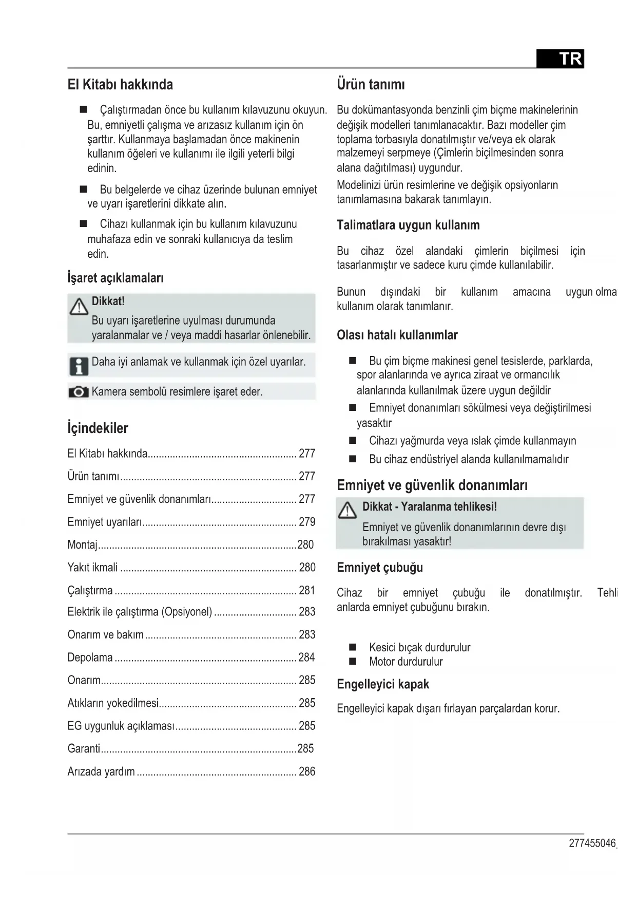 - Прпверетегоножот Припречкикоинесенаведенивооваатабелаиликоиштонеможетесамитедагиотстраните,Ве молимедасеобратитевонашатаслужбазаодносисокорисниците.TR 277455046_e İçindekiler ElKitabıhakkında ...................................................... 277 Ürüntanımı ................................................................ 277 Emniyetvegüvenlikdonanımları ............................... 277 Emniyetuyarıları ........................................................ 279 Montaj ........................................................................ 280 Yakıtikmali ................................................................ 280 Çalıştırma .................................................................. 281 Elektrikileçalıştırma(Opsiyonel) .............................. 283 Onarımvebakım ....................................................... 283 Depolama .................................................................. 284 Onarım ....................................................................... 285 Atıklarınyokedilmesi .................................................. 285 EGuygunlukaçıklaması ............................................ 285 Garanti ....................................................................... 285 Arızadayardım .......................................................... 286 El Kitabı hakkında Çalıştırmadanöncebukullanımkılavuzunuokuyun. Bu,emniyetliçalışmavearızasızkullanımiçinön şarttır.Kullanmayabaşlamadanöncemakinenin kullanımöğelerivekullanımıileilgiliyeterlibilgi edinin. Bu belgelerde ve cihaz üzerinde bulunan emniyet veuyarıişaretlerinidikkatealın. Cihazıkullanmakiçinbukullanımkılavuzunu muhafazaedinvesonrakikullanıcıyadateslim edin. İşaret açıklamaları Dikkat! Buuyarıişaretlerineuyulmasıdurumunda yaralanmalar ve / veya maddi hasarlar önlenebilir. Dahaiyianlamakvekullanmakiçinözeluyarılar. Kamerasembolüresimlereişareteder. Ürün tanımı Bu dokümantasyonda benzinli çim biçme makinelerinin değişikmodelleritanımlanacaktır.Bazımodellerçim toplamatorbasıyladonatılmıştırve/veyaekolarak malzemeyi serpmeye (Çimlerin biçilmesinden sonra alanadağıtılması)uygundur. Modeliniziürünresimlerinevedeğişikopsiyonların tanımlamasınabakaraktanımlayın. Talimatlara uygun kullanım Bu cihaz özel alandaki çimlerin biçilmesi için tasarlanmıştırvesadecekuruçimdekullanılabilir. Bunun dışındaki bir kullanım amacına uygunolmayan kullanımolaraktanımlanır. Olası hatalı kullanımlar Bu çim biçme makinesi genel tesislerde, parklarda, sporalanlarındaveayrıcaziraatveormancılık alanlarındakullanılmaküzereuygundeğildir Emniyetdonanımlarısökülmesiveyadeğiştirilmesi yasaktır Cihazıyağmurdaveyaıslakçimdekullanmayın Bucihazendüstriyelalandakullanılmamalıdır Emniyet ve güvenlik donanımları Dikkat - Yaralanma tehlikesi! Emniyetvegüvenlikdonanımlarınındevredışı bırakılmasıyasaktır! Emniyet çubuğu Cihaz bir emniyet çubuğu ile donatılmıştır. Tehlikeli anlardaemniyetçubuğunubırakın. Kesicibıçakdurdurulur Motor durdurulur Engelleyici kapak Engelleyicikapakdışarıfırlayanparçalardankorur.TR Orjinal kullanım kılavuzunun çevirisi