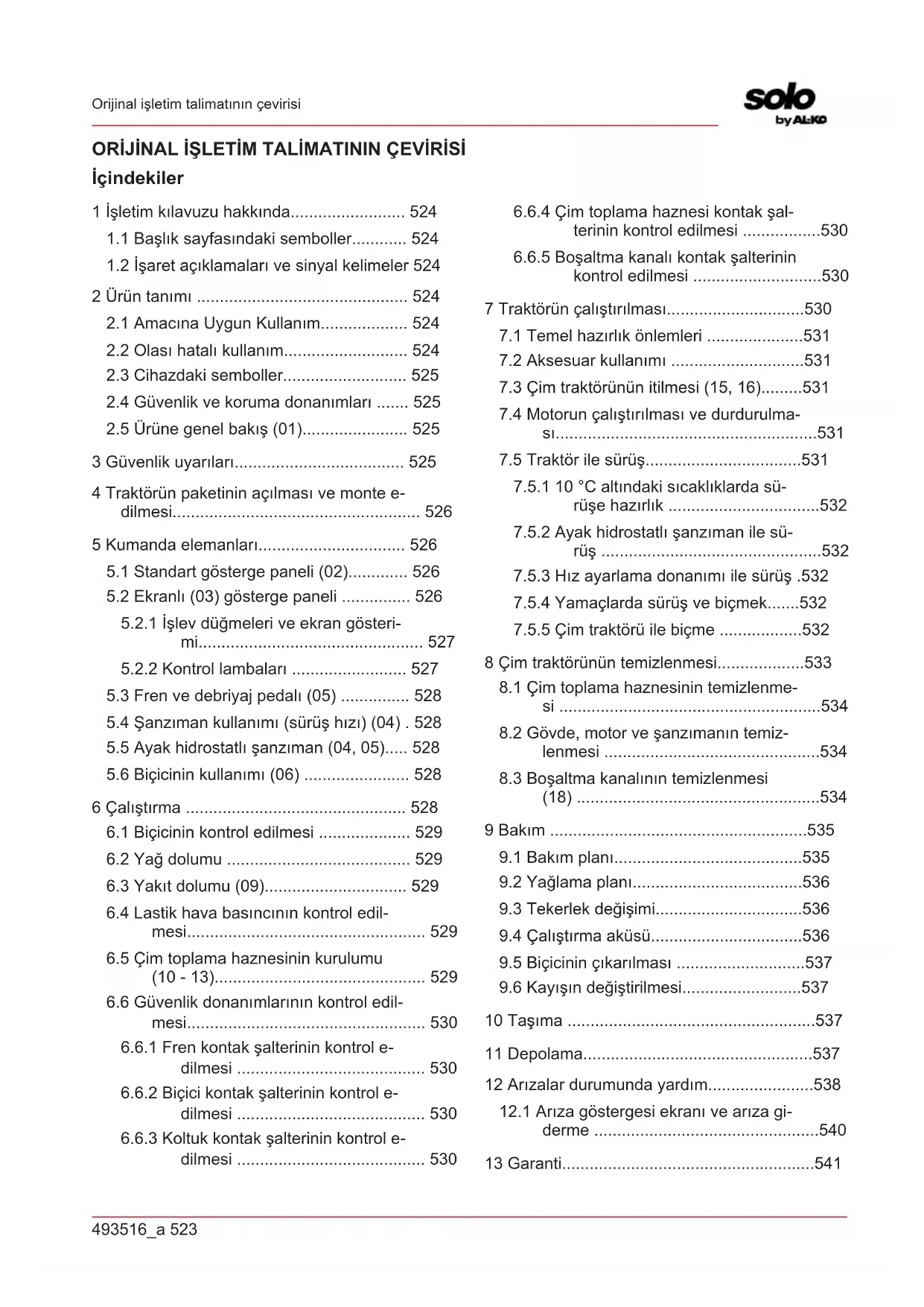 3 Güvenlik uyarıları..................................... 525 4 Traktörün paketinin açılması ve monte e- dilmesi...................................................... 526 5 Kumanda elemanları................................ 526