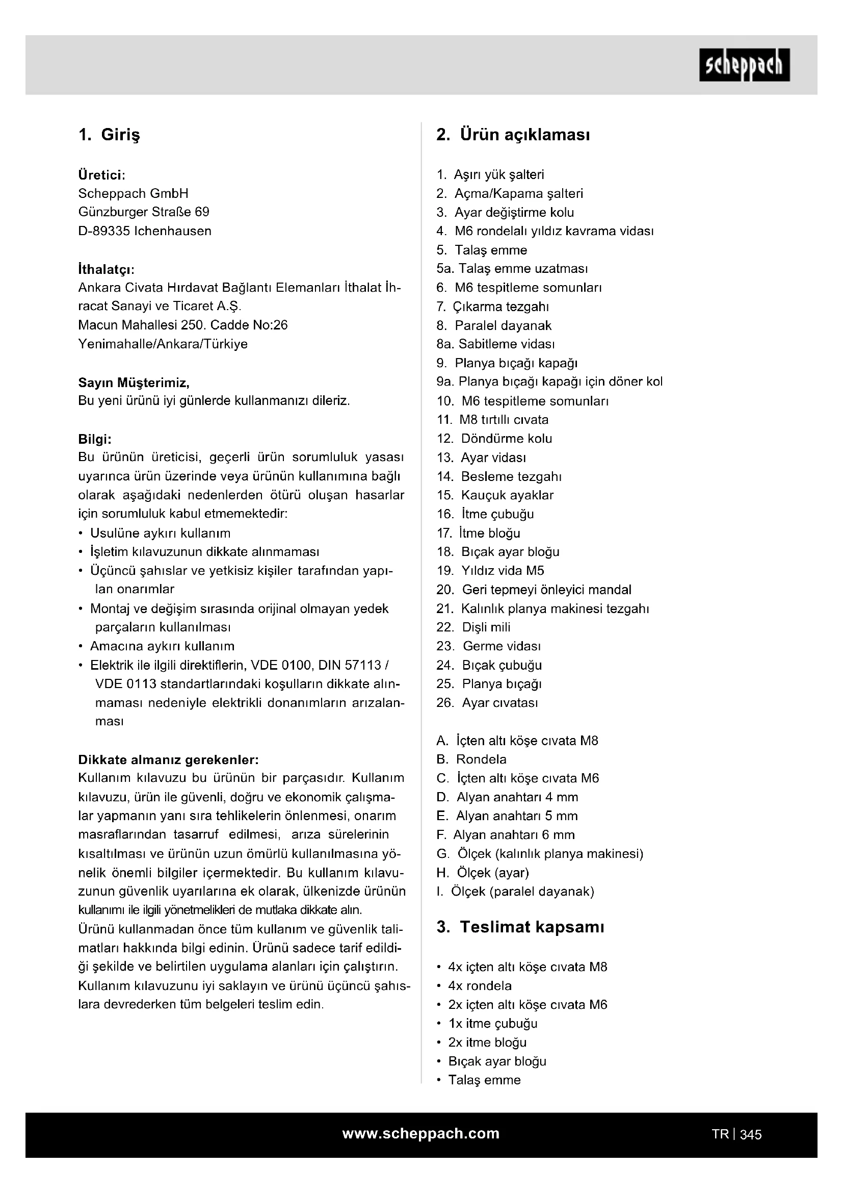 Üretici: Scheppach GmbH Günzburger Straße 69 D-89335 Ichenhausen İthalatçı: Ankara Civata Hırdavat Bağlantı Elemanları İthalat İh- racat Sanayi ve Ticaret A.Ş. Macun Mahallesi 250. Cadde No:26 Yenimahalle/Ankara/Türkiye Sayın Müşterimiz, Bu yeni ürünü iyi günlerde kullanmanızı dileriz. Bilgi: Bu ürünün üreticisi, geçerli ürün sorumluluk yasası uyarınca ürün üzerinde veya ürünün kullanımına bağlı olarak aşağıdaki nedenlerden ötürü oluşan hasarlar için sorumluluk kabul etmemektedir: