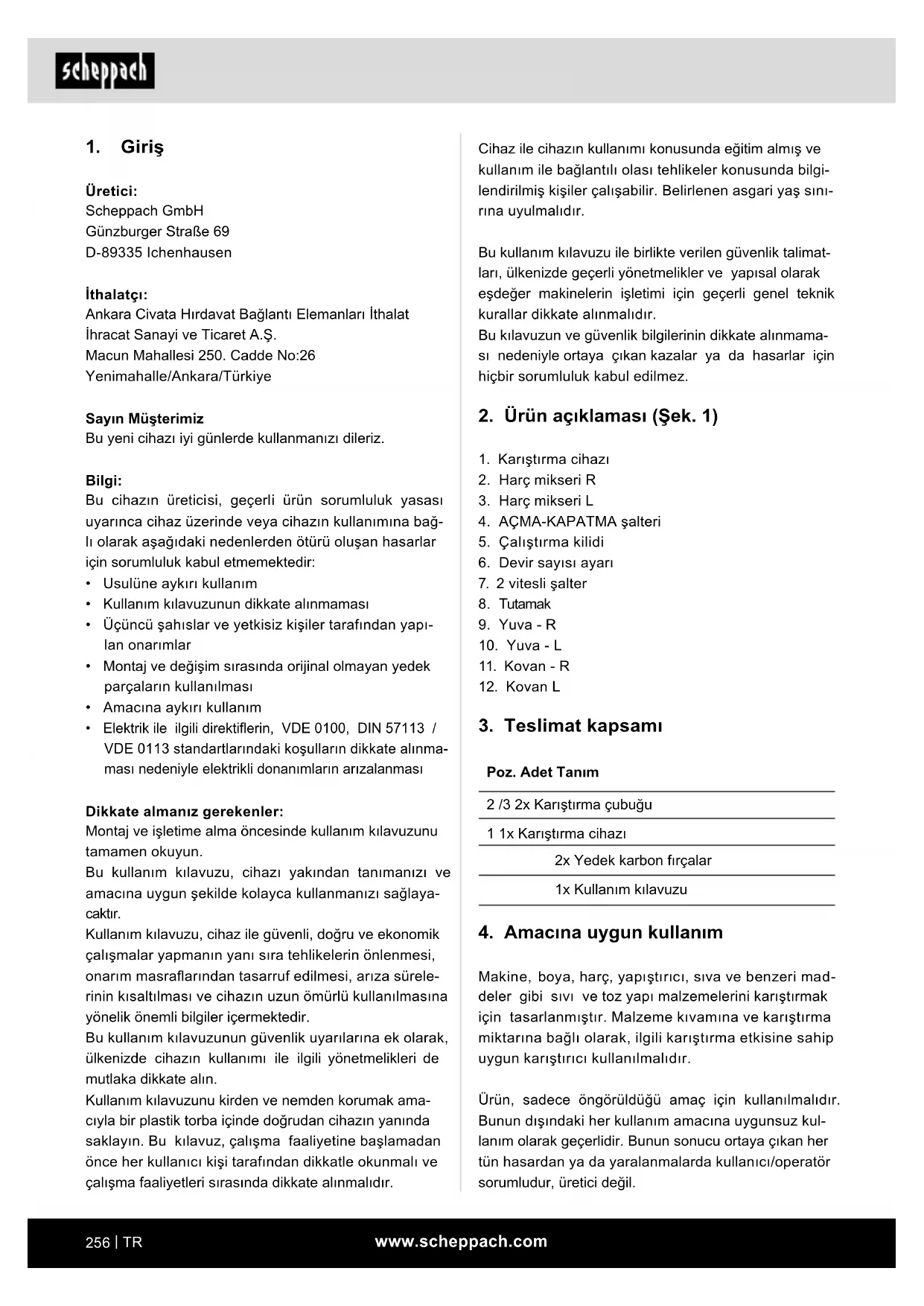 - Elektrik ile ilgili direktierin, VDE 0100, DIN 57113 / VDE 0113 standartlarındaki koşulların dikkate alınma- ması nedeniyle elektrikli donanımların arızalanması Dikkate almanız gerekenler: Montaj ve işletime alma öncesinde kullanım kılavuzunu tamamen okuyun. Bu kullanım kılavuzu, cihazı yakından tanımanızı ve amacına uygun şekilde kolayca kullanmanızı sağlaya- caktır. Kullanım kılavuzu, cihaz ile güvenli, doğru ve ekonomik çalışmalar yapmanın yanı sıra tehlikelerin önlenmesi, onarım masraarından tasarruf edilmesi, arıza sürele- rinin kısaltılması ve cihazın uzun ömürlü kullanılmasına yönelik önemli bilgiler içermektedir. Bu kullanım kılavuzunun güvenlik uyarılarına ek olarak, ülkenizde cihazın kullanımı ile ilgili yönetmelikleri de mutlaka dikkate alın. Kullanım kılavuzunu kirden ve nemden korumak ama- cıyla bir plastik torba içinde doğrudan cihazın yanında saklayın. Bu kılavuz, çalışma faaliyetine başlamadan önce her kullanıcı kişi tarafından dikkatle okunmalı ve çalışma faaliyetleri sırasında dikkate alınmalıdır.www.scheppach.com