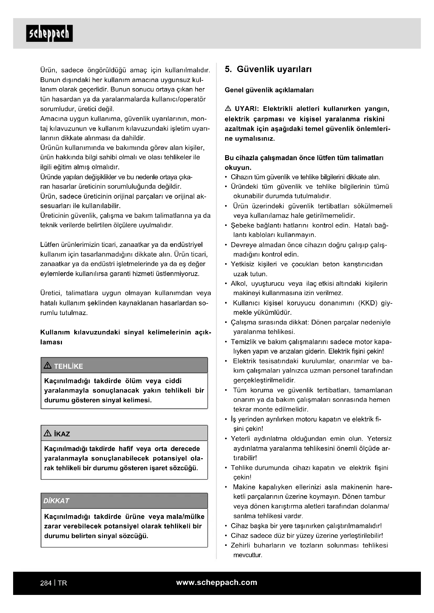 m DİKKAT! Sağlık ve yaralanma tehlikesi! Tozun solunması sağlığa zarar verebilir. Koruyucu el- diven olmadan çimentoya veya katkı maddelerine do- kunmayın. - Solunum maskesi takın. - Koruyucu eldiven giyin ve asla çalışan karıştırma tamburuna uzanmayın. m UYARI! Devrilme tehlikesi mevcuttur! Doldurmadan önce beton karıştırıcının sabit olduğun- dan emin olun. - Beton karıştırıcı sadece sağlam, düz (devrilme- yen) bir yüzey üzerinde çalıştırın. - Doldurma sırasında veya tambur çalışırken beton karıştırıcıyı hareket ettirmeyin. - Beton karıştırıcı sadece sağlam, düz (devrilme- yen) bir yüzey üzerinde çalıştırın.