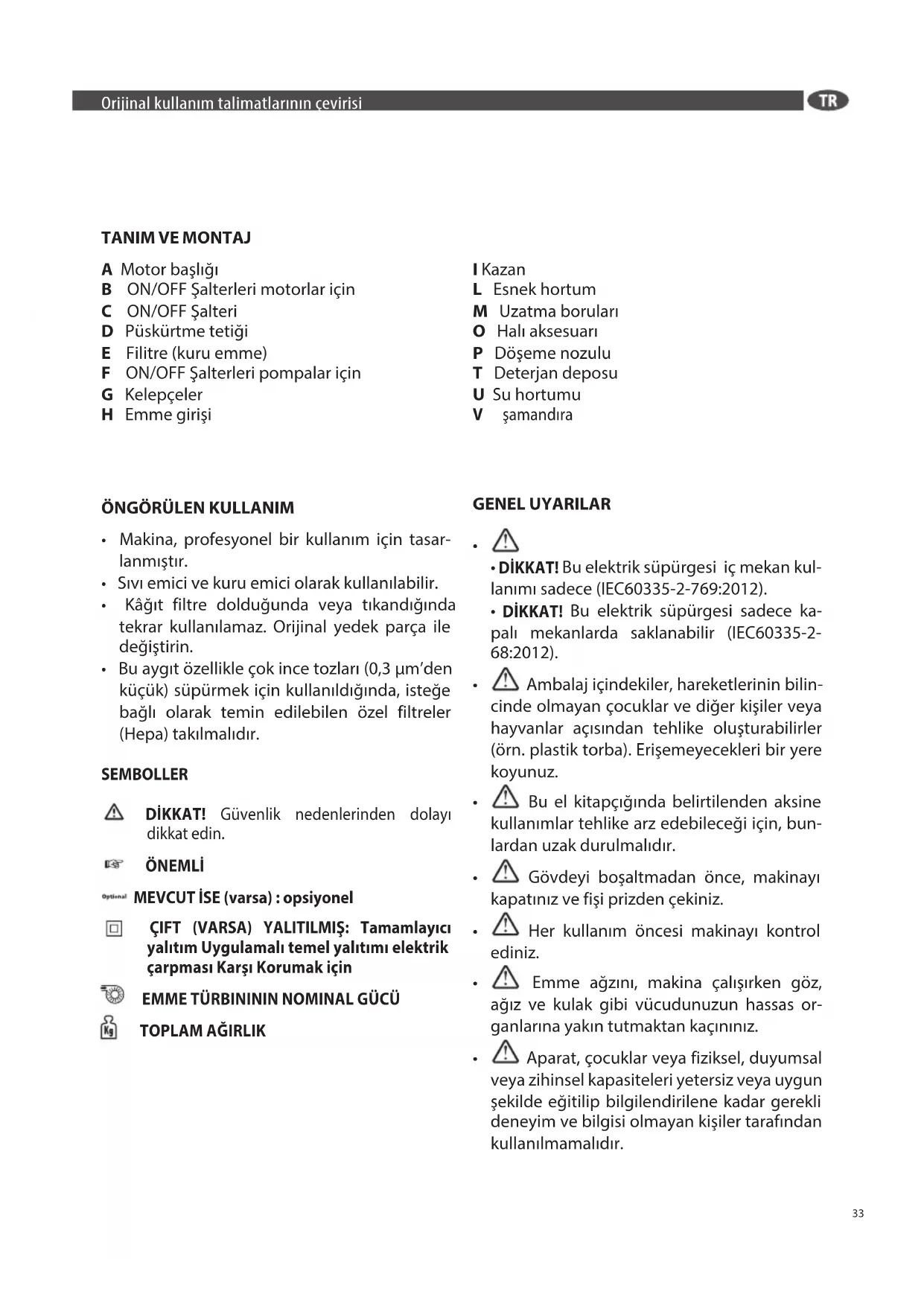 - Bu aygıt özellkle çok nce tozları (0,3 m’den küçük) süpürmek çn kullanıldığında, steğe bağlı olarak temn edleblen özel fltreler (Hepa) takılmalıdır. SEMBOLLER DİKKAT! Güvenlik nedenlerinden dolayı dikkat edin. ÖNEMLİ MEVCUT İSE (varsa) : opsiyonel ÇIFT (VARSA) YALITILMIŞ: Tamamlayıcı yalıtım Uygulamalı temel yalıtımı elektrik çarpması Karşı Korumak için