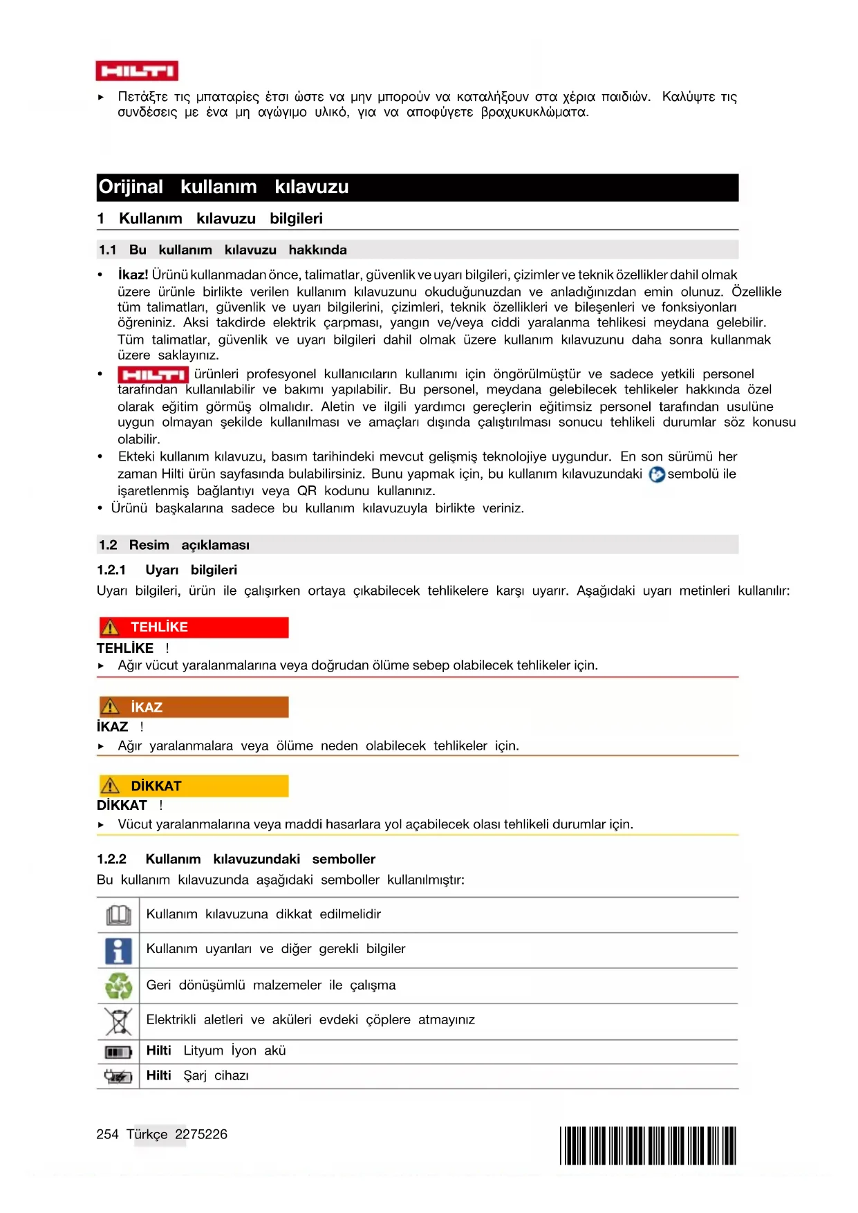 Bu kullanım kılavuzunda aşağıdaki semboller kullanılmıştır: Kullanım kılavuzuna dikkat edilmelidir Kullanım uyarıları ve diğer gerekli bilgiler Geri dönüşümlü malzemeler ile çalışma Elektrikli aletleri ve aküleri evdeki çöplere atmayınız Hilti Lityum İyon akü Hilti Şarj cihazı*2275226* 2275226 Türkçe 255