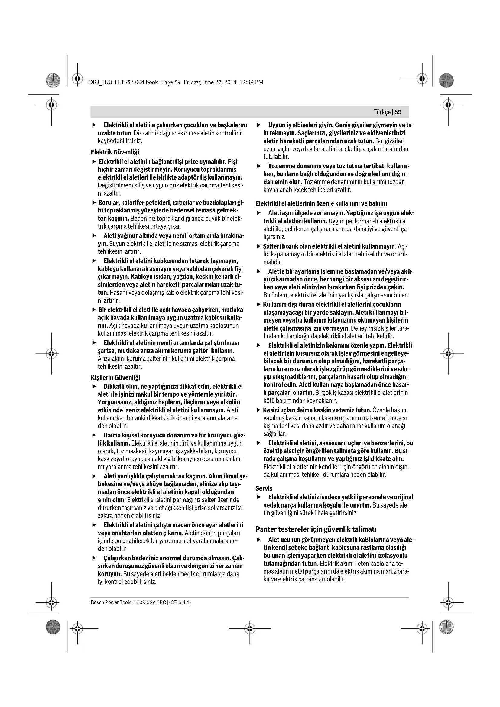 Μόνο για χώρες της ΕΕ: Τηρούμε το δικαίωμα αλλαγών. Türkçe Güvenlik Talimatı Elektrikli El Aletleri İçin Genel Uyarı Talimatı Bütün uyarıları ve talimat hükümlerini oku- yun. Açıklanan uyarılara ve talimat hükümlerine uyulmadığı takdirde elektrik çarpmalarına, yangınlara ve/veya ağır yaralanmalara neden olunabilir. Bütün uyarıları ve talimat hükümlerini ileride kullanmak üzere saklayın. Uyarı ve talimat hükümlerinde kullanılan “Elektrikli El Aleti” kavramı, akım şebekesine bağlı (şebeke bağlantı kablosu ile) aletlerle akü ile çalışan aletleri (akım şebekesine bağlantısı ol- mayan aletler) kapsamaktadır. Çalışma yeri güvenliği Çalıştığınız yeri temiz tutun ve iyi aydınlatın. Çalıştığınız yer düzensiz ise ve iyi aydınlatılmamışsa kazalar ortaya çı- kabilir. Yakınında patlayıcı maddeler, yanıcı sıvı, gaz veya toz- ların bulunduğu yerlerde elektrikli el aleti ile çalışma- yın. Elektrikli el aletleri, toz veya buharların tutuşmasına neden olabilecek kıvılcımlar çıkarırlar. Σύμφωνα με την Κοινοτική Οδηγία 2012/19/EE σχετικά με τις παλαιές ηλεκτρικές και ηλεκτρονικές συσκευές και τη μεταφορά της οδηγίας αυτής σε εθνικό δίκαιο δεν είναι πλέον υποχρεωτικό τα άχρηστα ηλεκτρικά εργαλεία να συλλέγονται ξεχωριστά για να ανακυκλωθούν με τρόπο φιλικό προς το περιβάλλον. UYARI OBJ_BUCH-1352-004.book Page 58 Friday, June 27, 2014 12:39 PMTürkçe | 59 Bosch Power Tools 1 609 92A 0RC | (27.6.14) Elektrikli el aleti ile çalışırken çocukları ve başkalarını uzakta tutun. Dikkatiniz dağılacak olursa aletin kontrolünü kaybedebilirsiniz. Elektrik Güvenliği Elektrikli el aletinin bağlantı fişi prize uymalıdır. Fişi hiçbir zaman değiştirmeyin. Koruyucu topraklanmış elektrikli el aletleri ile birlikte adaptör fiş kullanmayın. Değiştirilmemiş fiş ve uygun priz elektrik çarpma tehlikesi- ni azaltır. Borular, kalorifer petekleri, ısıtıcılar ve buzdolapları gi- bi topraklanmış yüzeylerle bedensel temasa gelmek- ten kaçının. Bedeniniz topraklandığı anda büyük bir elek- trik çarpma tehlikesi ortaya çıkar. Aleti yağmur altında veya nemli ortamlarda bırakma- yın. Suyun elektrikli el aleti içine sızması elektrik çarpma tehlikesini artırır. Elektrikli el aletini kablosundan tutarak taşımayın, kabloyu kullanarak asmayın veya kablodan çekerek fişi çıkarmayın. Kabloyu ısıdan, yağdan, keskin kenarlı ci- simlerden veya aletin hareketli parçalarından uzak tu- tun. Hasarlı veya dolaşmış kablo elektrik çarpma tehlikesi- ni artırır. Bir elektrikli el aleti ile açık havada çalışırken, mutlaka açık havada kullanılmaya uygun uzatma kablosu kulla- nın. Açık havada kullanılmaya uygun uzatma kablosunun kullanılması elektrik çarpma tehlikesini azaltır. Elektrikli el aletinin nemli ortamlarda çalıştırılması şartsa, mutlaka arıza akımı koruma şalteri kullanın. Arıza akımı koruma şalterinin kullanımı elektrik çarpma tehlikesini azaltır. Kişilerin Güvenliği Dikkatli olun, ne yaptığınıza dikkat edin, elektrikli el aleti ile işinizi makul bir tempo ve yöntemle yürütün. Yorgunsanız, aldığınız hapların, ilaçların veya alkolün etkisinde iseniz elektrikli el aletini kullanmayın. Aleti kullanırken bir anki dikkatsizlik önemli yaralanmalara ne- den olabilir. Daima kişisel koruyucu donanım ve bir koruyucu göz- lük kullanın. Elektrikli el aletinin türü ve kullanımına uygun olarak; toz maskesi, kaymayan iş ayakkabıları, koruyucu kask veya koruyucu kulaklık gibi koruyucu donanım kullanı- mı yaralanma tehlikesini azalttır. Aleti yanlışlıkla çalıştırmaktan kaçının. Akım ikmal şe- bekesine ve/veya aküye bağlamadan, elinize alıp taşı- madan önce elektrikli el aletinin kapalı olduğundan emin olun. Elektrikli el aletini parmağınız şalter üzerinde dururken taşırsanız ve alet açıkken fişi prize sokarsanız ka- zalara neden olabilirsiniz. Elektrikli el aletini çalıştırmadan önce ayar aletlerini veya anahtarları aletten çıkarın. Aletin dönen parçaları içinde bulunabilecek bir yardımcı alet yaralanmalara ne- den olabilir. Çalışırken bedeniniz anormal durumda olmasın. Çalı- şırken duruşunuz güvenli olsun ve dengenizi her zaman koruyun. Bu sayede aleti beklenmedik durumlarda daha iyi kontrol edebilirsiniz. Uygun iş elbiseleri giyin. Geniş giysiler giymeyin ve ta- kı takmayın. Saçlarınızı, giysileriniz ve eldivenlerinizi aletin hareketli parçalarından uzak tutun. Bol giysiler, uzun saçlar veya takılar aletin hareketli parçaları tarafından tutulabilir. Toz emme donanımı veya toz tutma tertibatı kullanır- ken, bunların bağlı olduğundan ve doğru kullanıldığın- dan emin olun. Toz emme donanımının kullanımı tozdan kaynalanabilecek tehlikeleri azaltır. Elektrikli el aletlerinin özenle kullanımı ve bakımı Aleti aşırı ölçede zorlamayın. Yaptığınız işe uygun elek- trikli el aletleri kullanın. Uygun performanslı elektrikli el aleti ile, belirlenen çalışma alanında daha iyi ve güvenli ça- lışırsınız. Şalteri bozuk olan elektrikli el aletini kullanmayın. Açı- lıp kapanamayan bir elektrikli el aleti tehlikelidir ve onarıl- malıdır. Alette bir ayarlama işlemine başlamadan ve/veya akü- yü çıkarmadan önce, herhangi bir aksesuarı değiştirir- ken veya aleti elinizden bırakırken fişi prizden çekin. Bu önlem, elektrikli el aletinin yanlışlıkla çalışmasını önler. Kullanım dışı duran elektrikli el aletlerini çocukların ulaşamayacağı bir yerde saklayın. Aleti kullanmayı bil- meyen veya 