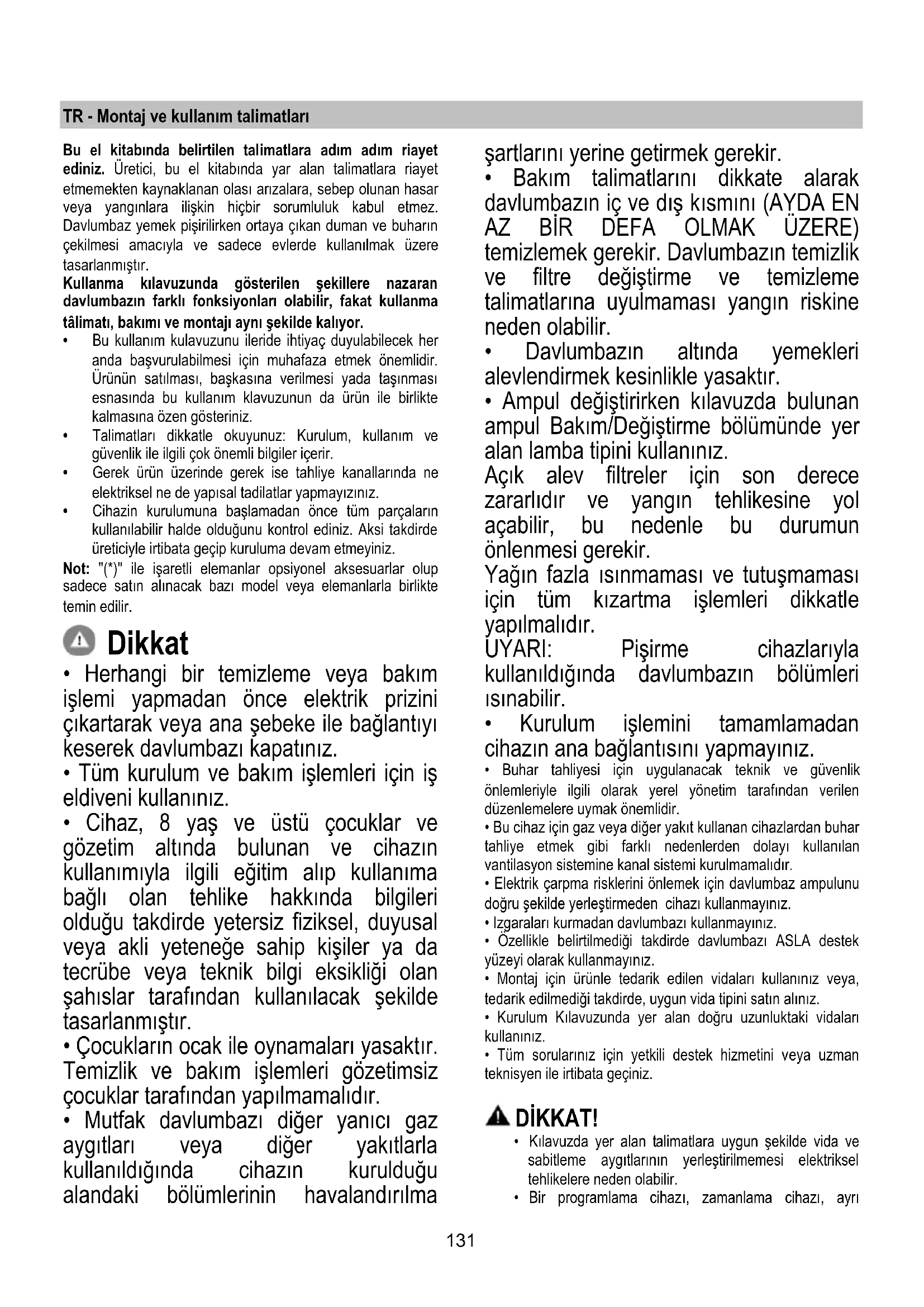 ćete prasak). Ako vam ne bude funkcionirala rasvjeta, prekontrolirajte jeste li pravilno stavili usisavanja prije nego što pozovete tehnički servis131 TR - Montaj ve kullanım talimatları Bu el kitabında belirtilen talimatlara adım adım riayet ediniz. Üretici, bu el kitabında yar alan talimatlara riayet etmemekten kaynaklanan olası arızalara, sebep olunan hasar veya yangınlara ilişkin hiçbir sorumluluk kabul etmez. Davlumbaz yemek pişirilirken ortaya çıkan duman ve buharın çekilmesi amacıyla ve sadece evlerde kullanılmak üzere tasarlanmıştır. Kullanma kılavuzunda gösterilen şekillere nazaran davlumbazın farklı fonksiyonları olabilir, fakat kullanma tâlimatı, bakımı ve montajı aynı şekilde kalıyor.