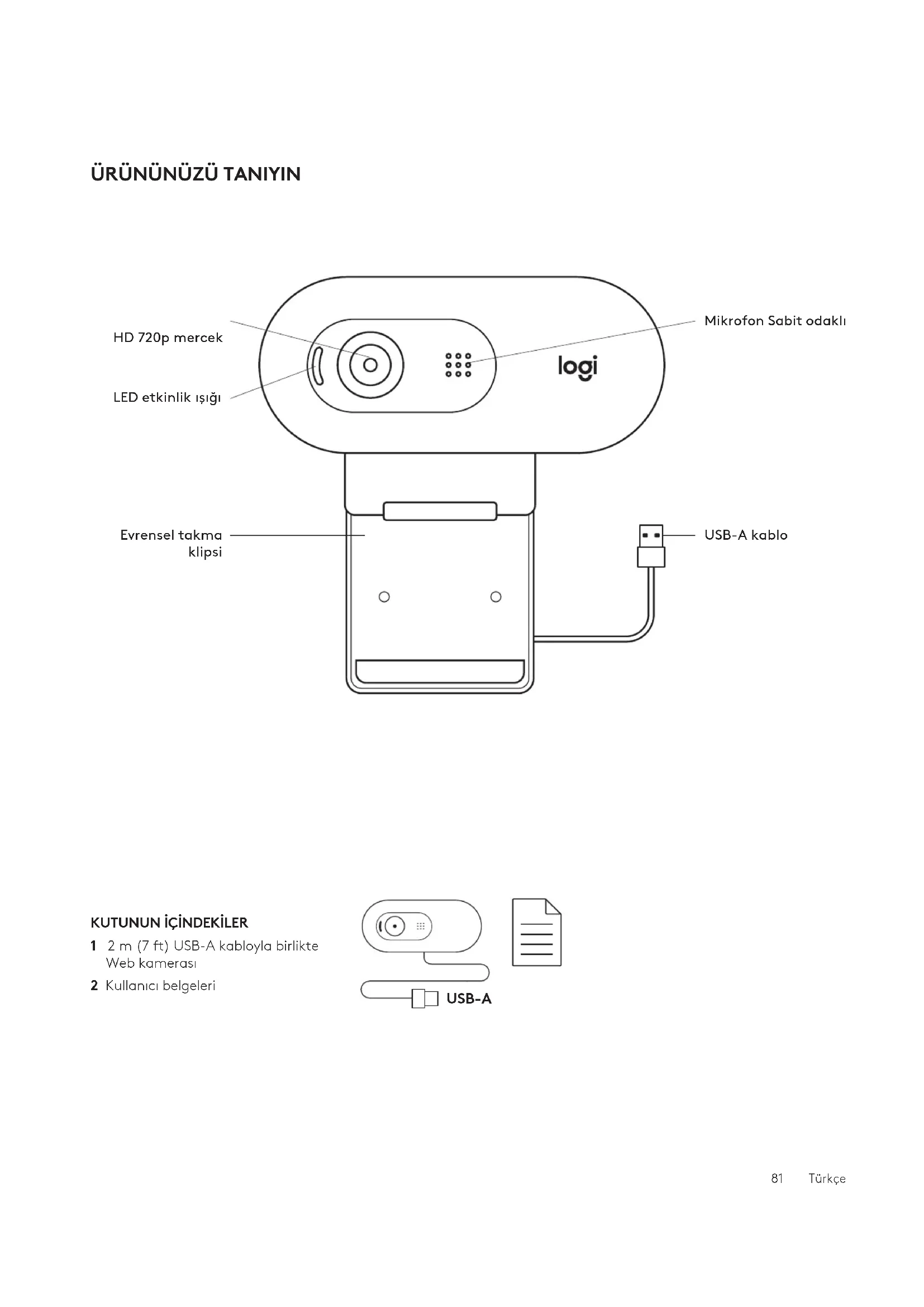 Web kamerası br uygulama tarafından kullanıldığında LED etknlk ışığı yanar. 2 Evrensel montaj klps ucunun, chazınızın arkasıyla aynı hzada olduğundan emn olarak web kamerasını ayarlayın. 3 Kendnz kamera çerçevesnn çne alacak şeklde webkamerasını yukarı/aşağı ayarlayarak en y konuma getrn. 82 TürkçeSABİT MONTAJ KLİPSİ İLE BİRLİKTE: Yükseklk x Genşlk x Dernlk: 31,91 mm (1,26 nç) x 72,91 mm (2,87 nç) x 66,64 mm (2,62 nç) Ağırlık: 75 g (2,65 ons) BOYUTLAR www.logitech.com/support/C505e © 2020 Logitech, Logi ve Logitech logosu, ABD ve diğer ülkelerde Logitech Europe S.A.’nın ve/veya bağlı kuruluşlarının ticari veya tescilli ticari markalarıdır. Logitech bu kılavuzda bulunabilecek hatalar için hiçbir sorumluluk kabul etmez. Burada bulunan bilgiler önceden haber verilmeksizin değiştirilebilir.USB-A