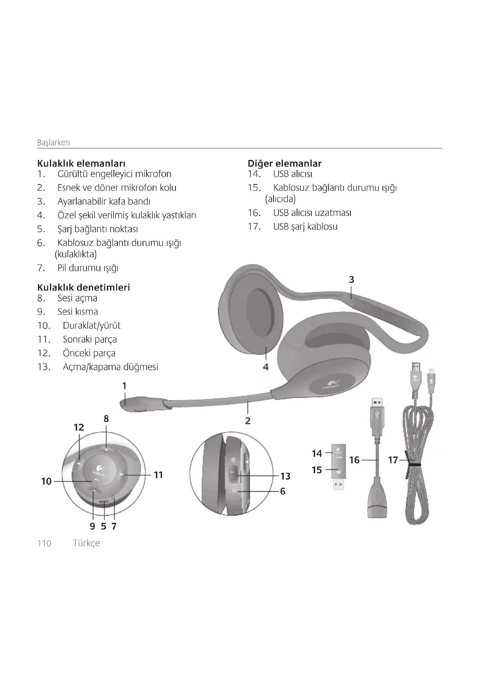 Kulaklıkelemanları 1. Gürültü engelleyici mikrofon 2. Esnek ve döner mikrofon kolu 3. Ayarlanabilir kafa bandı 4. Özel şekil verilmiş kulaklık yastıkları 5. Şarj bağlantı noktası 6. Kablosuz bağlantı durumu ışığı (kulaklıkta) 7. Pil durumu ışığı Kulaklıkdenetimleri 8. Sesi açma 9. Sesi kısma 10. Duraklat/yürüt 11. Sonraki parça 12. Önceki parça 13. Açma/kapama düğmesi Diğerelemanlar 14. USB alıcısı 15. Kablosuz bağlantı durumu ışığı (alıcıda) 16. USB alıcısı uzatması 17. USB şarj kablosuTürkçe 111 Logitech
