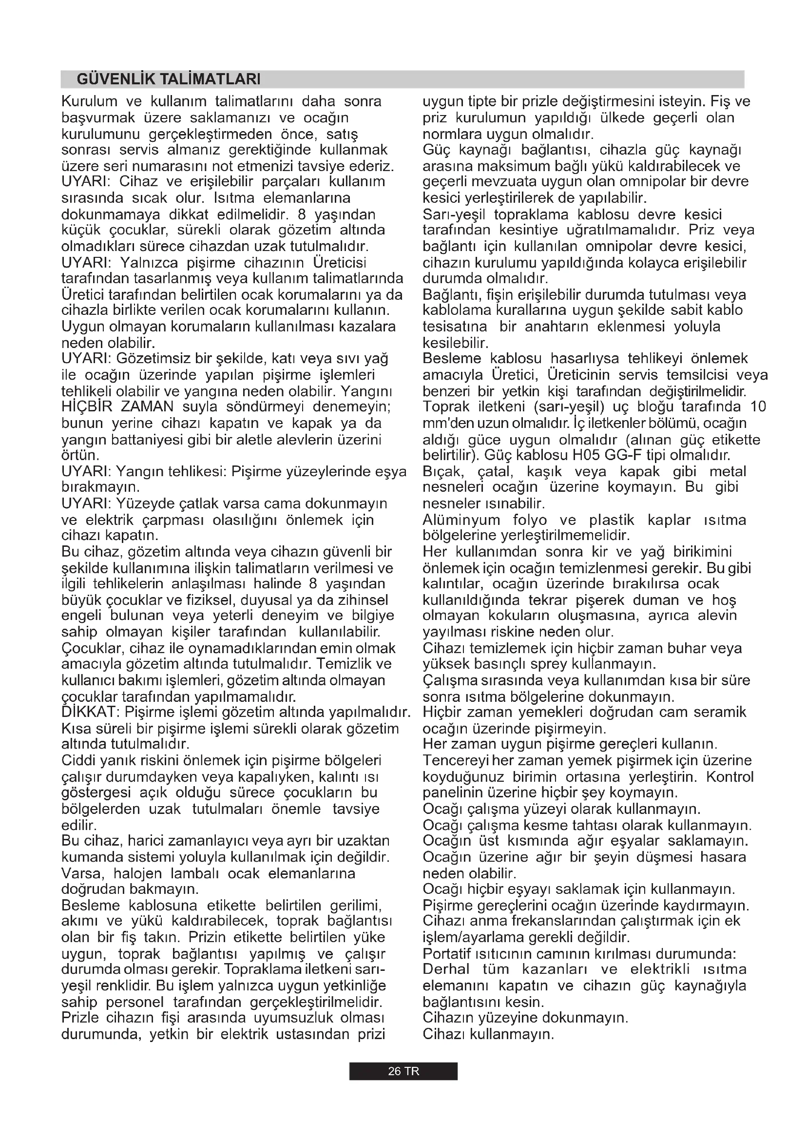 Do czyszczenia płyty nigdy nie należy używać środków ściernych, środków zawierających substancje żrące, wybielające lub kwasy. Należy również unikać stosowania substancji kwaśnych lub alkalicznych (sok z cytryny, ocet itp.) do części emaliowanych, lakierowanych lub wykonanych ze stali nierdzewnej. Palniki można czyścić wodą z mydłem. Aby przywrócić ich oryginalny blask, należy stosować domowy płyn do czyszczenia stali nierdzewnej. Po wyczyszczeniu, palniki należy wysuszyć i umieścić na płycie. Przed przystąpieniem do czyszczenia, należy upewnić się, że płyta wystygła. Wyjąc wtyczkę z gniazdka zasilania lub (w przypadku podłączenie bezpośredniego) wyłączyć zasilanie elektryczne. Podczas czyszczenia emaliowanych, lakierowanych lub chromowanych części, należy używać ciepłej wody z mydłem lub detergentu nie zawierającego substancji żrących. Do czyszczenie części ze stali nierdzewnej, należy używać odpowiedniego roztworu czyszczącego. Istotne jest, aby palniki były umieszczone dokładnie na swoim miejscu. OSTRZEŻENIE Do czyszczenia płyt gazowych nie wolno używać oczyszczaczy parowych.” Chromowane ruszty i palniki maja tendencję do ciemnienia w miarę ich używania. Jest to zjawisko normalne i nieuchronne, w żadnym stopniu jednak nie pogarszające funkcjonalności płyty gazowej. Chromowane ruszty i palniki W każdym bądź razie, są one dostępne w naszym centrum serwisowym jako części zamienne.26 TR Kurulum ve kullanım talimatlarını daha sonra başvurmak üzere saklamanızı ve ocağın kurulumunu gerçekleştirmeden önce, satış sonrası servis almanız gerektiğinde kullanmak üzere seri numarasını not etmenizi tavsiye ederiz. UYARI: Yalnızca pişirme cihazının Üreticisi tarafından tasarlanmış veya kullanım talimatlarında Üretici tarafından belirtilen ocak korumalarını ya da cihazla birlikte verilen ocak korumalarını kullanın. Uygun olmayan korumaların kullanılması kazalara neden olabilir. UYARI: Gözetimsiz bir şekilde, katı veya sıvı yağ ile ocağın üzerinde yapılan pişirme işlemleri tehlikeli olabilir ve yangına neden olabilir. Yangını HİÇBİR ZAMAN suyla söndürmeyi denemeyin; bunun yerine cihazı kapatın ve kapak ya da yangın battaniyesi gibi bir aletle alevlerin üzerini örtün. UYARI: Yangın tehlikesi: Pişirme yüzeylerinde eşya bırakmayın. UYARI: Yüzeyde çatlak varsa cama dokunmayın ve elektrik çarpması olasılığını önlemek için cihazı kapatın. UYARI: Cihaz ve erişilebilir parçaları kullanım sırasında sıcak olur. Isıtma elemanlarına dokunmamaya dikkat edilmelidir. 8 yaşından küçük çocuklar, sürekli olarak gözetim altında olmadıkları sürece cihazdan uzak tutulmalıdır. DİKKAT: Pişirme işlemi gözetim altında yapılmalıdır. Kısa süreli bir pişirme işlemi sürekli olarak gözetim altında tutulmalıdır. Ciddi yanık riskini önlemek için pişirme bölgeleri çalışır durumdayken veya kapalıyken, kalıntı ısı göstergesi açık olduğu sürece çocukların bu bölgelerden uzak tutulmaları önemle tavsiye edilir. Bu cihaz, harici zamanlayıcı veya ayrı bir uzaktan kumanda sistemi yoluyla kullanılmak için değildir. Varsa, halojen lambalı ocak elemanlarına doğrudan bakmayın. Besleme kablosuna etikette belirtilen gerilimi, akımı ve yükü kaldırabilecek, toprak bağlantısı olan bir fiş takın. Prizin etikette belirtilen yüke uygun, toprak bağlantısı yapılmış ve çalışır durumda olması gerekir. Topraklama iletkeni sarı- yeşil renklidir. Bu işlem yalnızca uygun yetkinliğe sahip personel tarafından gerçekleştirilmelidir. Prizle cihazın fişi arasında uyumsuzluk olması durumunda, yetkin bir elektrik ustasından prizi Bu cihaz, gözetim altında veya cihazın güvenli bir şekilde kullanımına ilişkin talimatların verilmesi ve ilgili tehlikelerin anlaşılması halinde 8 yaşından büyük çocuklar ve fiziksel, duyusal ya da zihinsel engeli bulunan veya yeterli deneyim ve bilgiye sahip olmayan kişiler tarafından kullanılabilir. Çocuklar, cihaz ile oynamadıklarından emin olmak amacıyla gözetim altında tutulmalıdır. Temizlik ve kullanıcı bakımı işlemleri, gözetim altında olmayan çocuklar tarafından yapılmamalıdır.