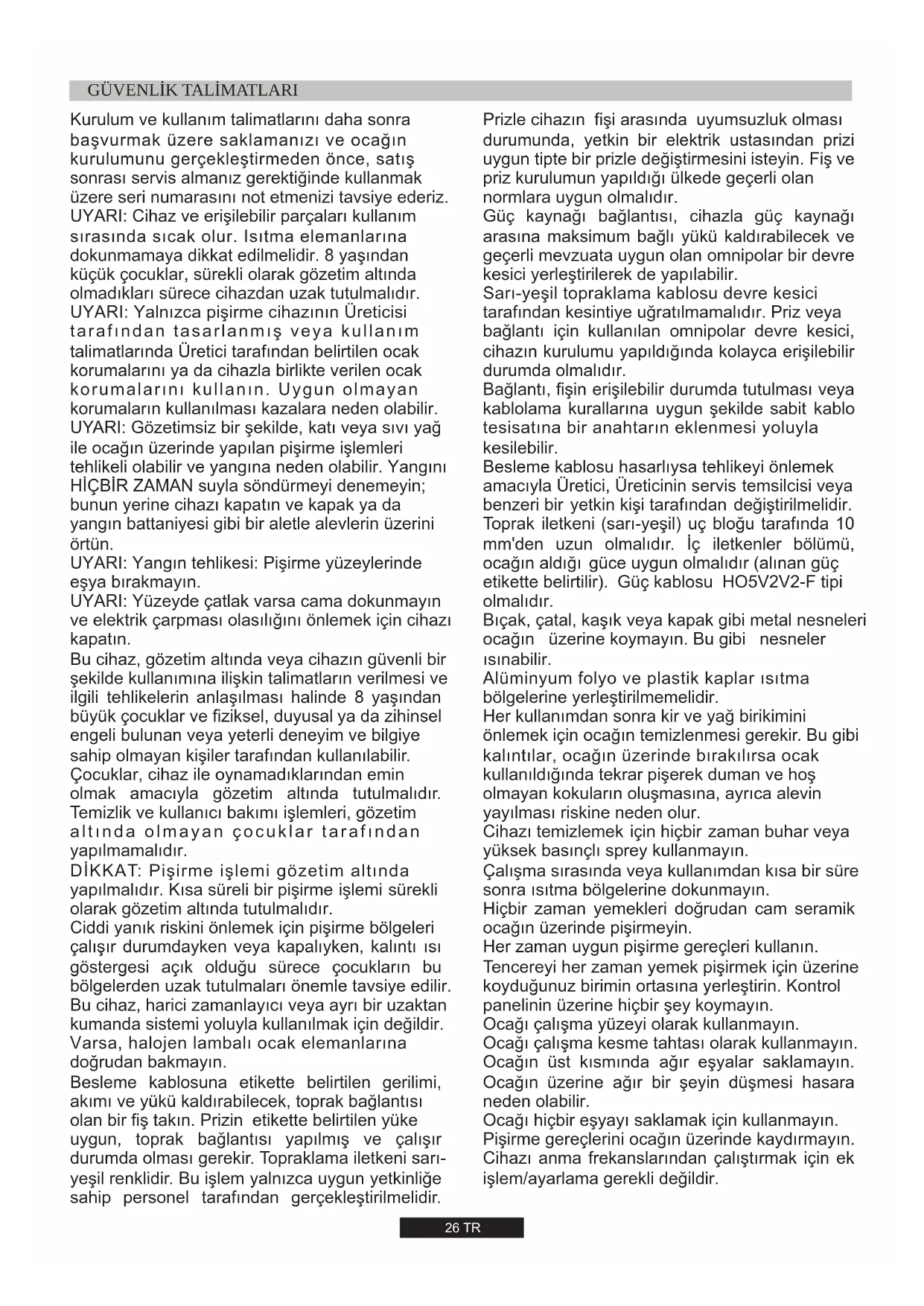 - gdy kupuje się nowe urządzenie, zużyte można zwrócić do sprzedawcy, który musi je przyjąć bezpłatnie, na zasadzie zamiany jeden za jeden, o ile urządzenie to jest tego samego rodzaju i ma takie same funkcje, jak urządzenie dostarczone. Płyta palnika Palnik Type FFD Aux 1kW Sr 1,75 kW R 2,7 kW Dc 4 kW Mono Nominalne ciepło wejściowe G20/20 mbar G30/28-30 mbar Klasa instalacji Napięcie / Częstotliwość V / Hz Moc elektryczna pobierana Zapłon elektryczny Wymiary produktu UR 3,5 kW26 TR Kurulum ve kullanım talimatlarını daha sonra başvurmak üzere saklamanızı ve ocağın kurulumunu gerçekleştirmeden önce, satış sonrası servis almanız gerektiğinde kullanmak üzere seri numarasını not etmenizi tavsiye ederiz. UYARI: Cihaz ve erişilebilir parçaları kullanım sırasında sıcak olur. Isıtma elemanlarına dokunmamaya dikkat edilmelidir. 8 yaşından küçük çocuklar, sürekli olarak gözetim altında olmadıkları sürece cihazdan uzak tutulmalıdır. UYARI: Yalnızca pişirme cihazının Üreticisi tarafından tasarlanmış veya kullanım talimatlarında Üretici tarafından belirtilen ocak korumalarını ya da cihazla birlikte verilen ocak korumalarını kullanın. Uygun olmayan korumaların kullanılması kazalara neden olabilir. UYARI: Gözetimsiz bir şekilde, katı veya sıvı yağ ile ocağın üzerinde yapılan pişirme işlemleri tehlikeli olabilir ve yangına neden olabilir. Yangını HİÇBİR ZAMAN suyla söndürmeyi denemeyin; bunun yerine cihazı kapatın ve kapak ya da yangın battaniyesi gibi bir aletle alevlerin üzerini örtün. UYARI: Yangın tehlikesi: Pişirme yüzeylerinde eşya bırakmayın. UYARI: Yüzeyde çatlak varsa cama dokunmayın ve elektrik çarpması olasılığını önlemek için cihazı kapatın. Bu cihaz, gözetim altında veya cihazın güvenli bir şekilde kullanımına ilişkin talimatların verilmesi ve ilgili tehlikelerin anlaşılması halinde 8 yaşından büyük çocuklar ve fiziksel, duyusal ya da zihinsel engeli bulunan veya yeterli deneyim ve bilgiye sahip olmayan kişiler tarafından kullanılabilir. Çocuklar, cihaz ile oynamadıklarından emin olmak amacıyla gözetim altında tutulmalıdır. Temizlik ve kullanıcı bakımı işlemleri, gözetim altında olmayan çocuklar tarafından yapılmamalıdır. DİKKAT: Pişirme işlemi gözetim altında yapılmalıdır. Kısa süreli bir pişirme işlemi sürekli olarak gözetim altında tutulmalıdır. Ciddi yanık riskini önlemek için pişirme bölgeleri çalışır durumdayken veya kapalıyken, kalıntı ısı göstergesi açık olduğu sürece çocukların bu bölgelerden uzak tutulmaları önemle tavsiye edilir. Bu cihaz, harici zamanlayıcı veya ayrı bir uzaktan kumanda sistemi yoluyla kullanılmak için değildir. Varsa, halojen lambalı ocak elemanlarına doğrudan bakmayın. Besleme kablosuna etikette belirtilen gerilimi, akımı ve yükü kaldırabilecek, toprak bağlantısı olan bir fiş takın. Prizin etikette belirtilen yüke uygun, toprak bağlantısı yapılmış ve çalışır durumda olması gerekir. Topraklama iletkeni sarı- yeşil renklidir. Bu işlem yalnızca uygun yetkinliğe sahip personel tarafından gerçekleştirilmelidir.