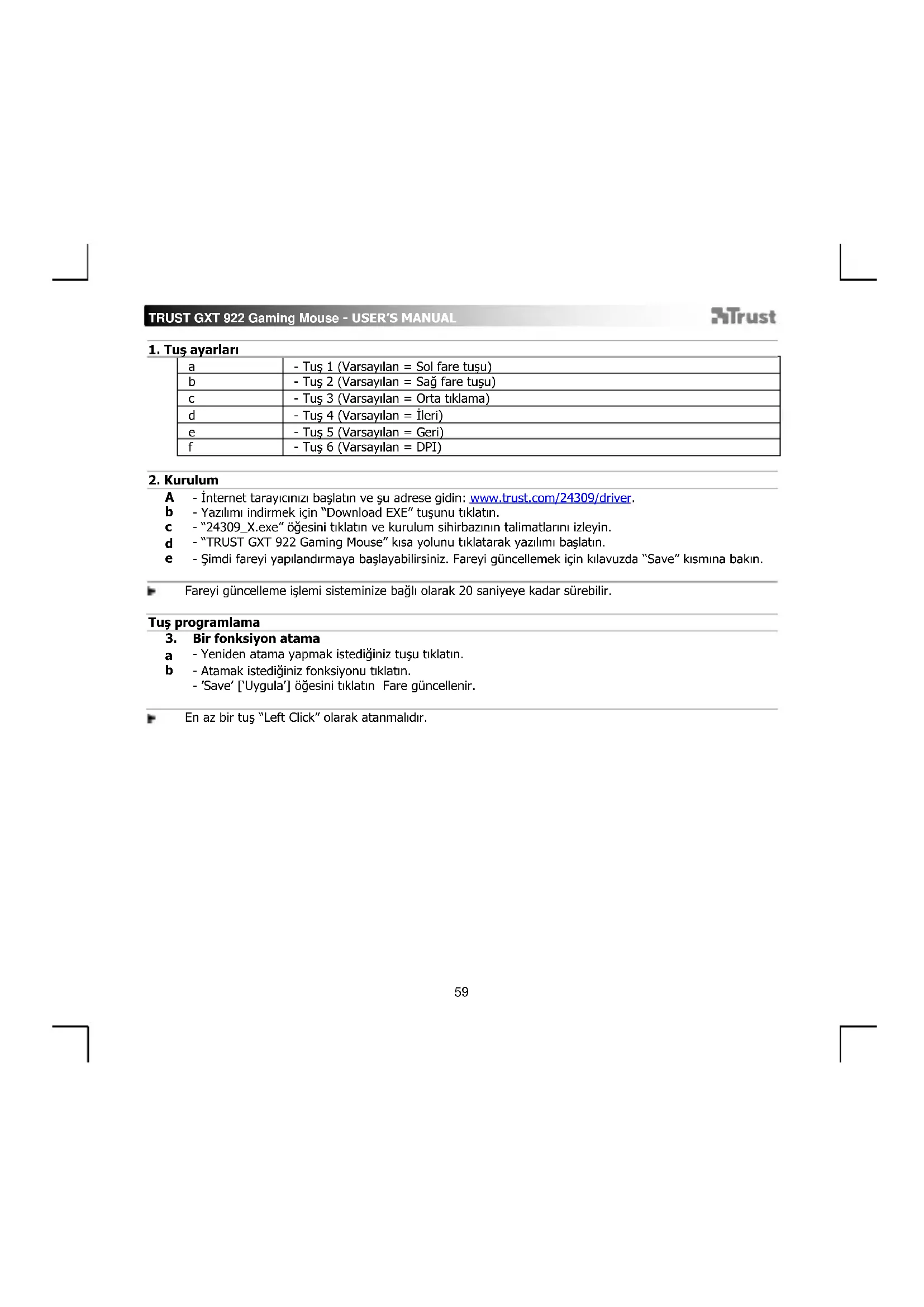 - İnternet tarayıcınızı başlatın ve şu adrese gidin: www.trust.com/24309/driver. - Yazılımı indirmek için “Download EXE” tuşunu tıklatın. - “24309_X.exe” öğesini tıklatın ve kurulum sihirbazının talimatlarını izleyin. - “TRUST GXT 922 Gaming Mouse” kısa yolunu tıklatarak yazılımı başlatın. - Şimdi fareyi yapılandırmaya başlayabilirsiniz. Fareyi güncellemek için kılavuzda “Save” kısmına bakın. Fareyi güncelleme işlemi sisteminize bağlı olarak 20 saniyeye kadar sürebilir. Tuş programlama