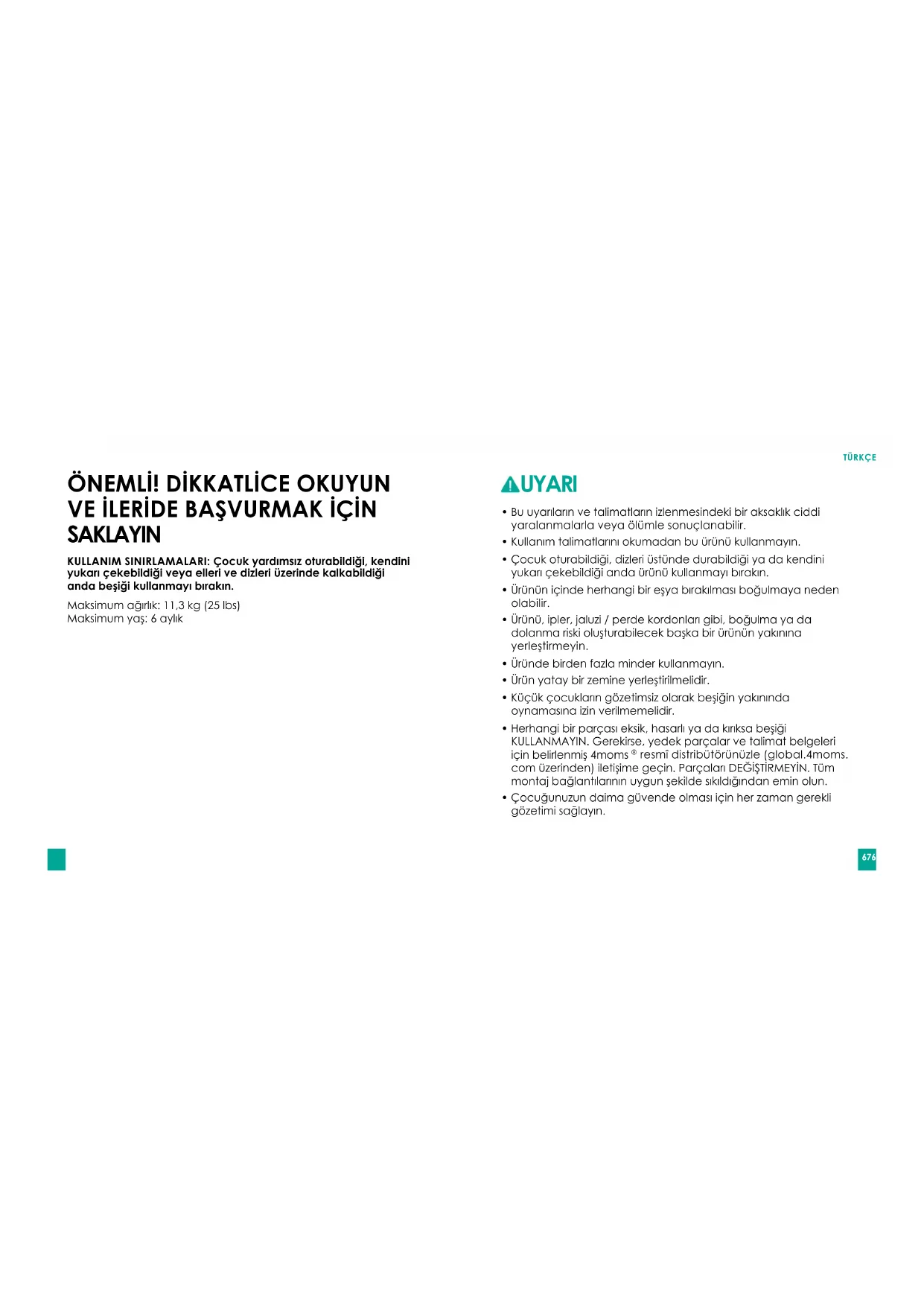 SAKLAYIN KULLANIM SINIRLAMALARI: Çocuk yardımsız oturabildiği, kendini yukarı çekebildiği veya elleri ve dizleri üzerinde kalkabildiği anda beşiği kullanmayı bırakın. Maksimumağırlık:11,3kg(25lbs) Maksimumyaş:6aylık UYARI