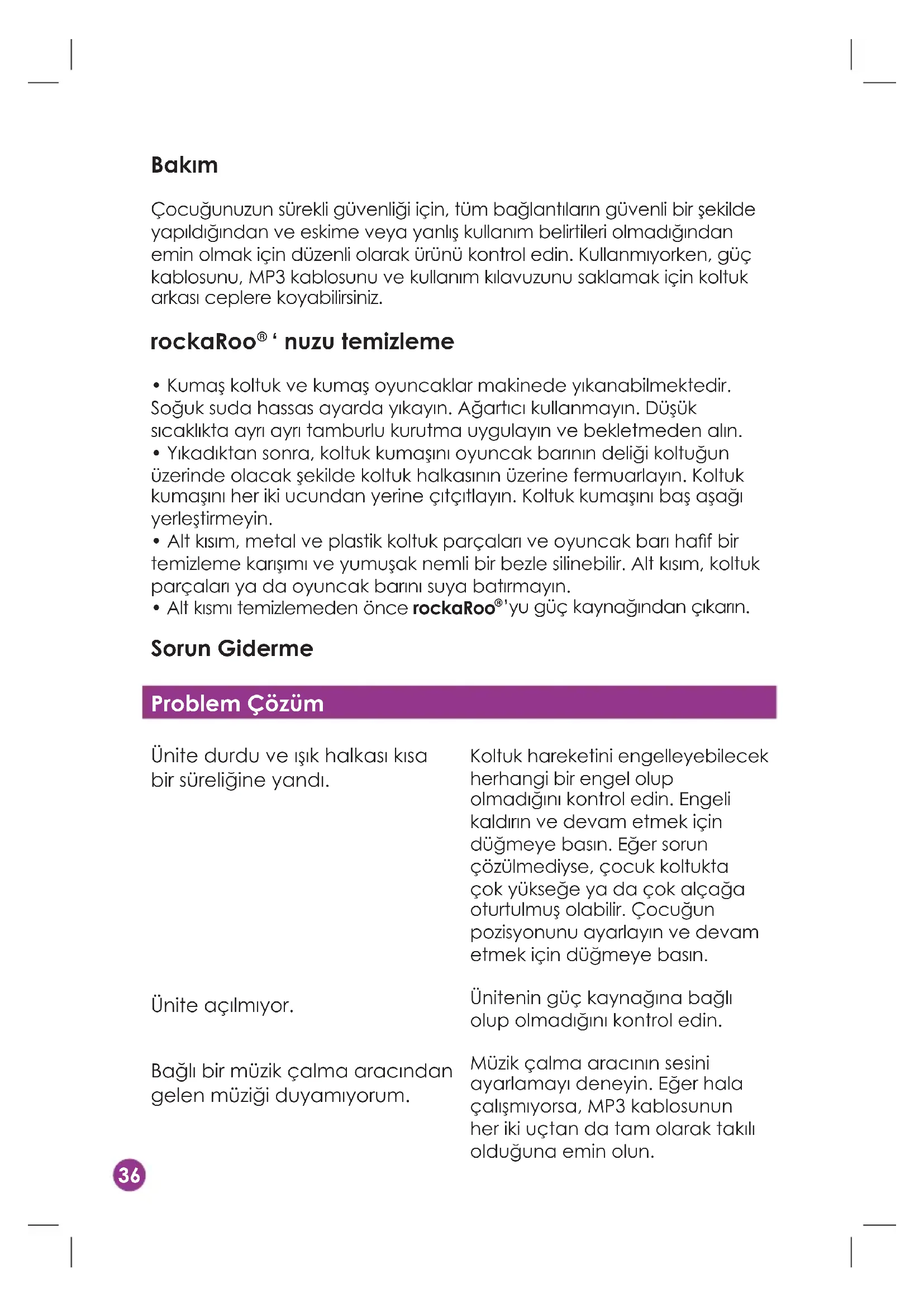 aprovado) anulará esta garantia. Esta garantia apenas é válida no país de aquisição original.36 Bakım Çocuğunuzun sürekli güvenliği için, tüm bağlantıların güvenli bir şekilde yapıldığından ve eskime veya yanlış kullanım belirtileri olmadığından emin olmak için düzenli olarak ürünü kontrol edin. Kullanmıyorken, güç kablosunu, MP3 kablosunu ve kullanım kılavuzunu saklamak için koltuk arkası ceplere koyabilirsiniz. rockaRoo