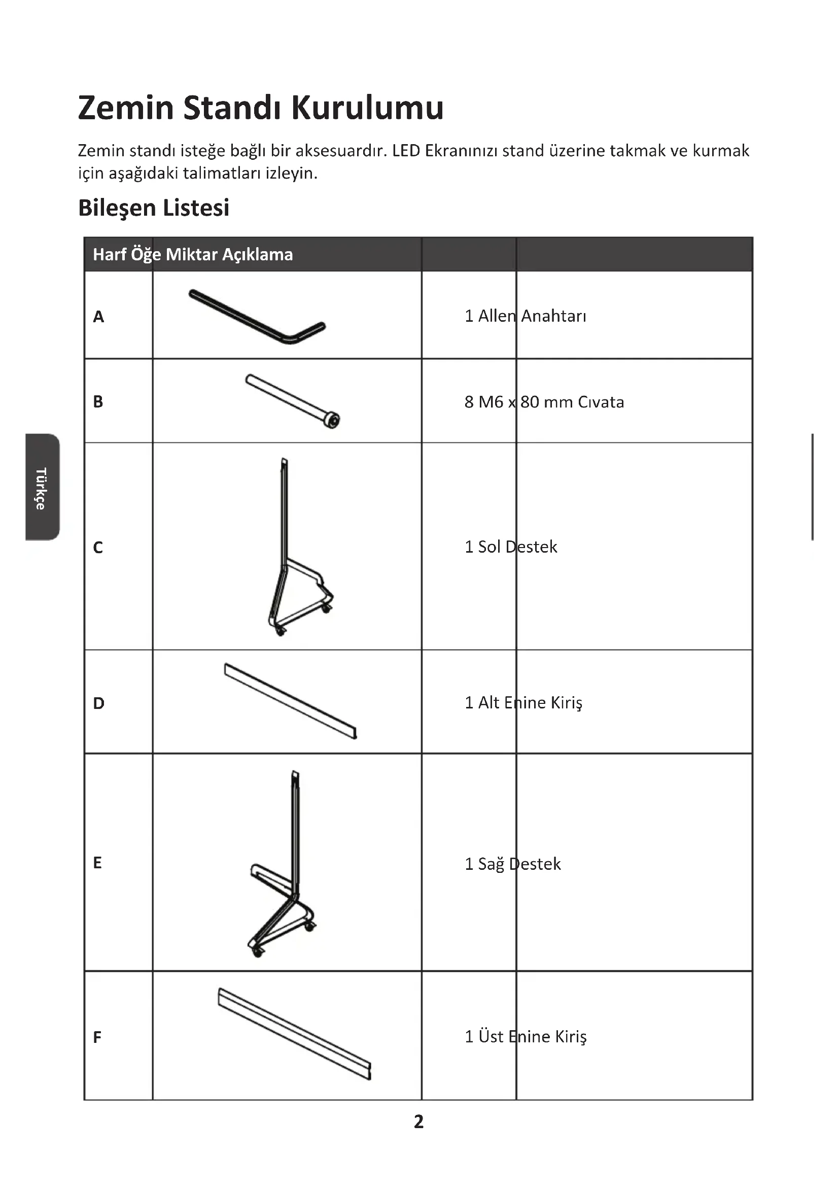 HDMI OUT USBUSBUSBRS2322 Türkçe Zemin Standı Kurulumu Zemin standı isteğe bağlı bir aksesuardır. LED Ekranınızı stand üzerine takmak ve kurmak için aşağıdaki talimatları izleyin. Bileşen Listesi Harf Öğe Miktar Açıklama